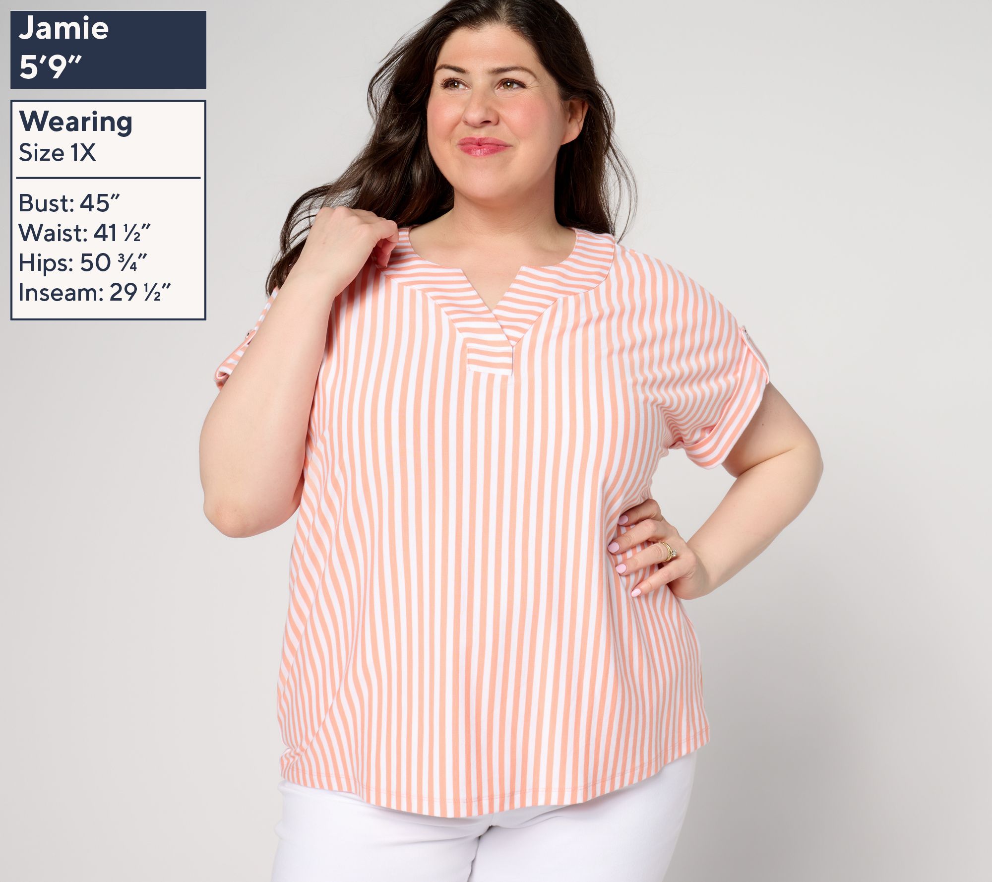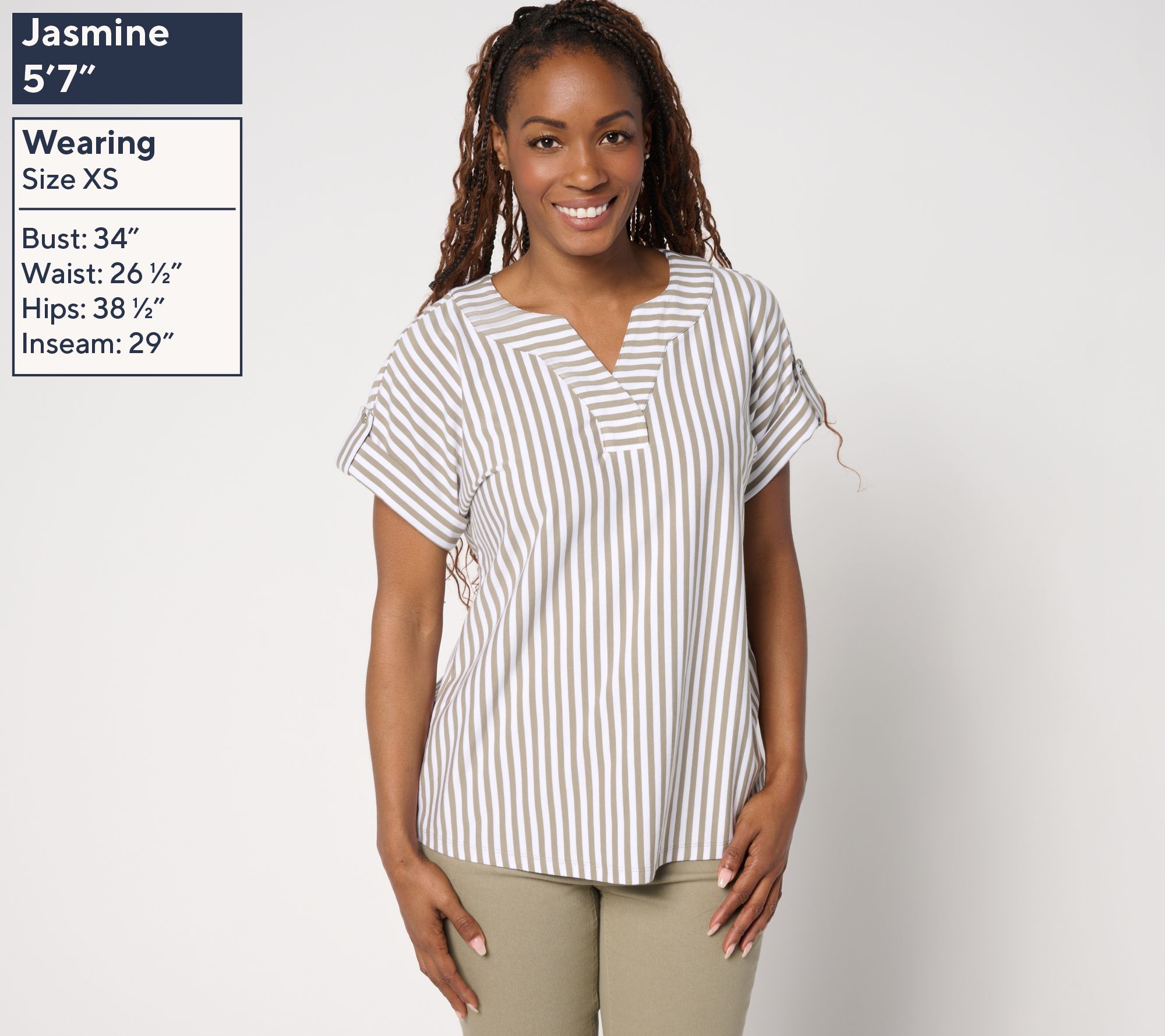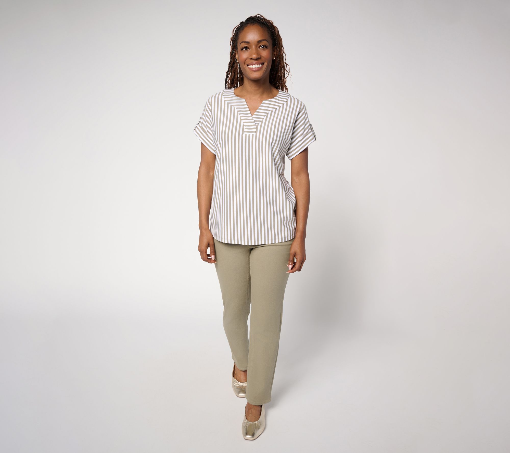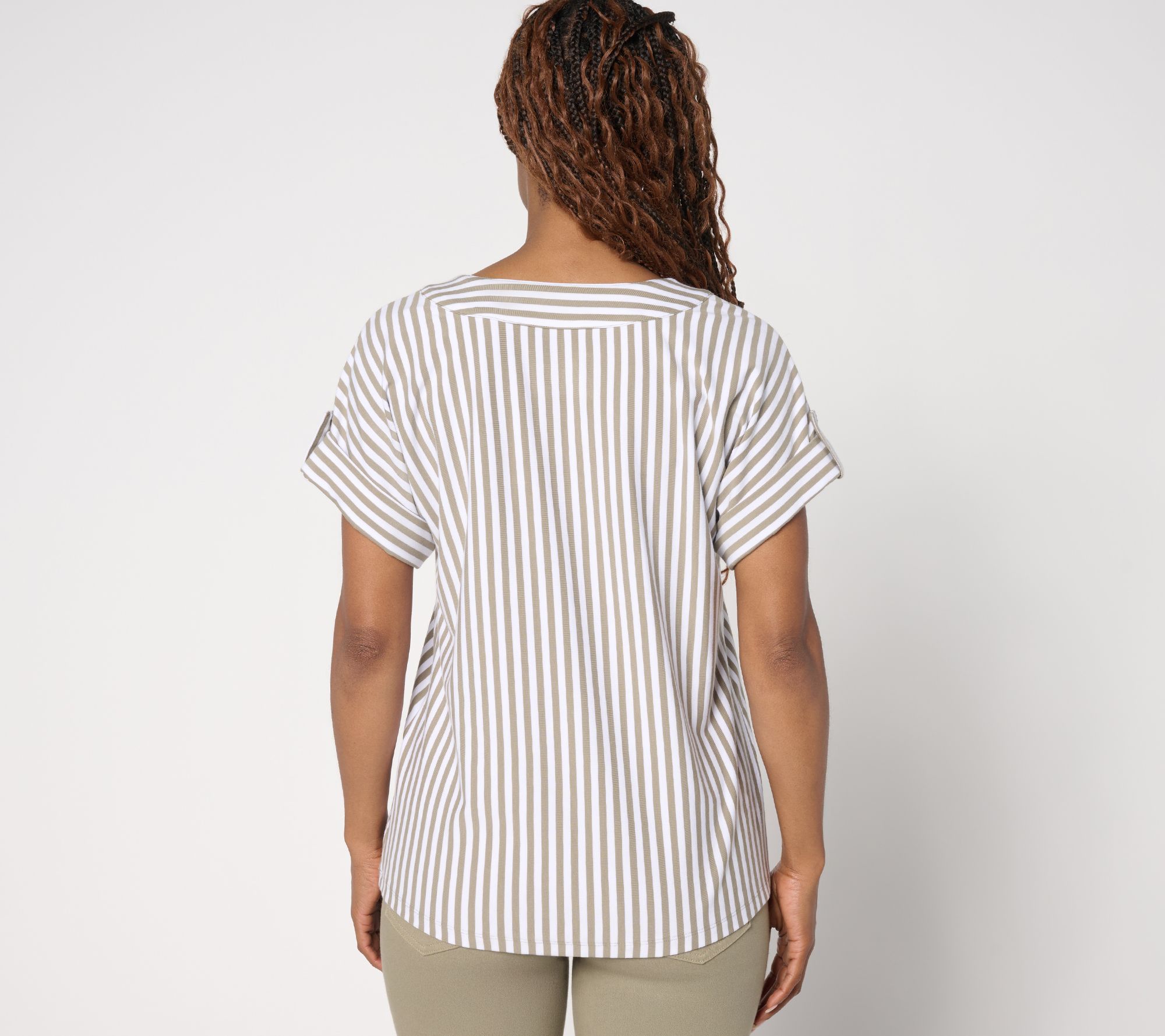 Show your stripes! This sunshine-ready Favorite Jersey top with rolled-tab cuffs is designed to stand out on weekend strolls and weekday errands alike. From Denim & Co.® Fashions.