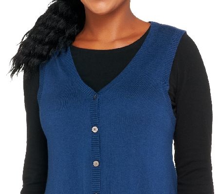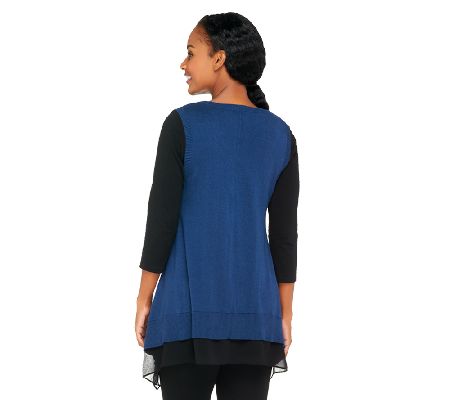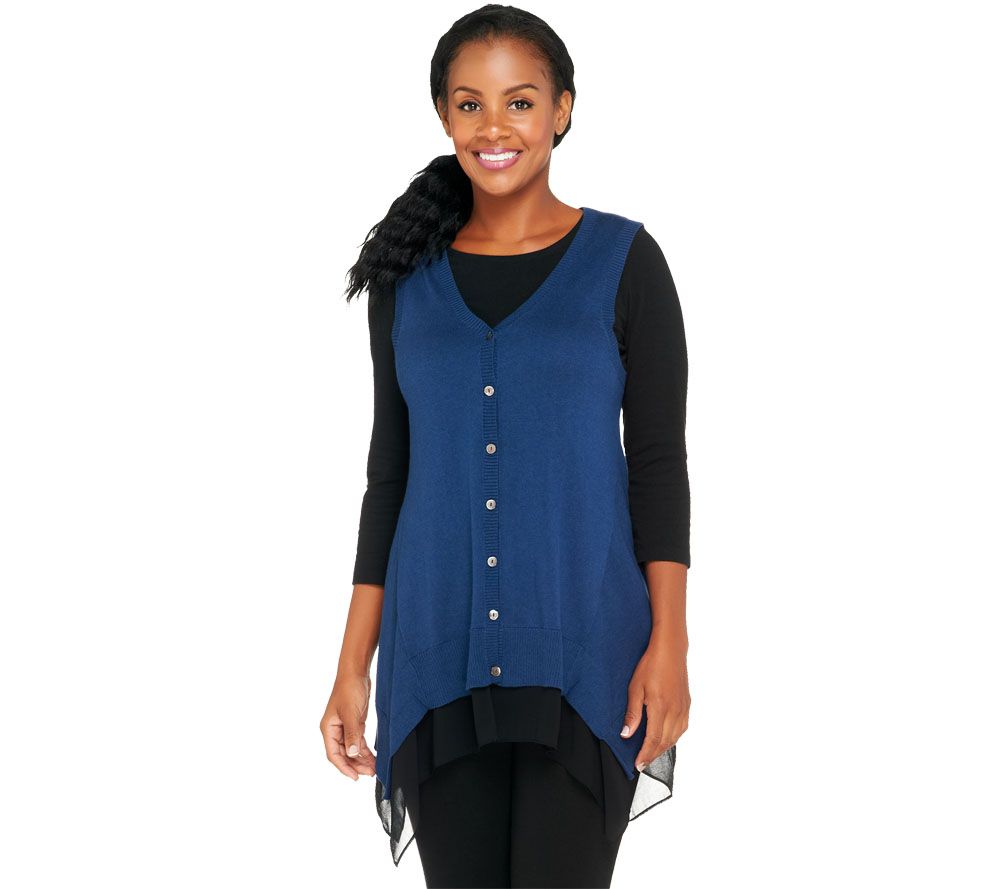Not your typical sweater vest. When a sweater vest is made from comfortable cotton with a touch of cashmere and an asymmetrical hemline trimmed with flowy chiffon, it goes from a sensible layer to a chic style statement. From LOGO by Lori Goldstein(R).