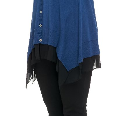 Ribbed V-neckline, button-front closure, asymmetric hemline with chiffon trim
