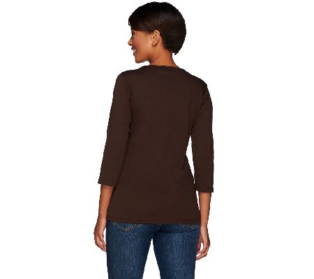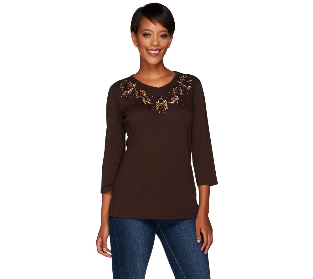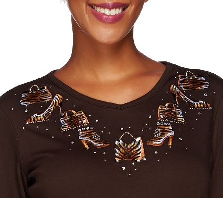 Fiercely fashionable. Add some feral fun to your wardrobe in this Copper Crush Tiger Accessories top from Quacker Factory(R). The flattering V-neckline features an array of tiger-print accessories made even more fabulous by rhinestone and embroidery details. Pair this with leggings for an anything-but-tame outfit. From Quaker Factory.