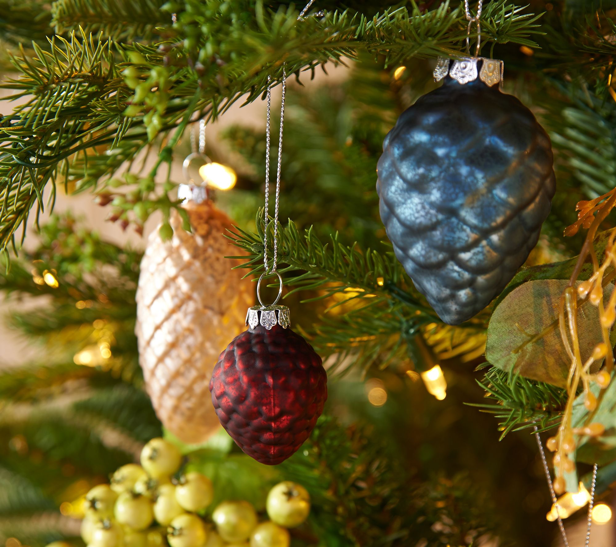 Includes nine vintage-style pinecone ornaments in colors of rose gold, deep red, bright red, and deep blue