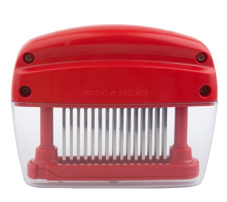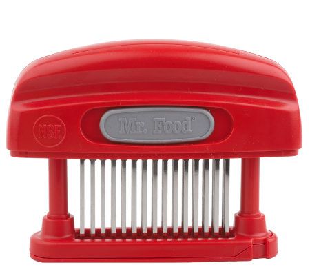 Mouthwatering! The Kitchen Magician meat tenderizer uses 45 stainless steel blades to make your meat--even less expensive cuts--tender and juicy, reducing marinating time and preventing shrinkage. It also works on dough, making pizza crusts crispy and adding flavor to your pastries. From Mr. Food.