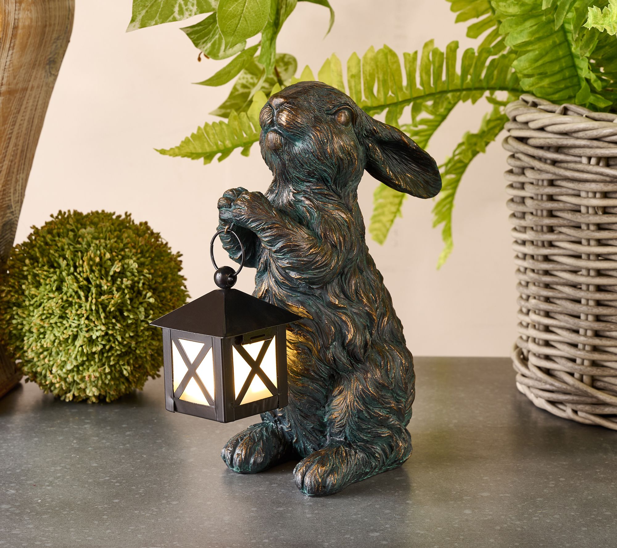 Some bunny wants to lead the way to an early spring! Add a charming touch to your garden with this delightful bronze-like furry friend statue that holds a metal lantern, perfect for lighting up your outdoor space. From the Valerie Parr Hill Collection.