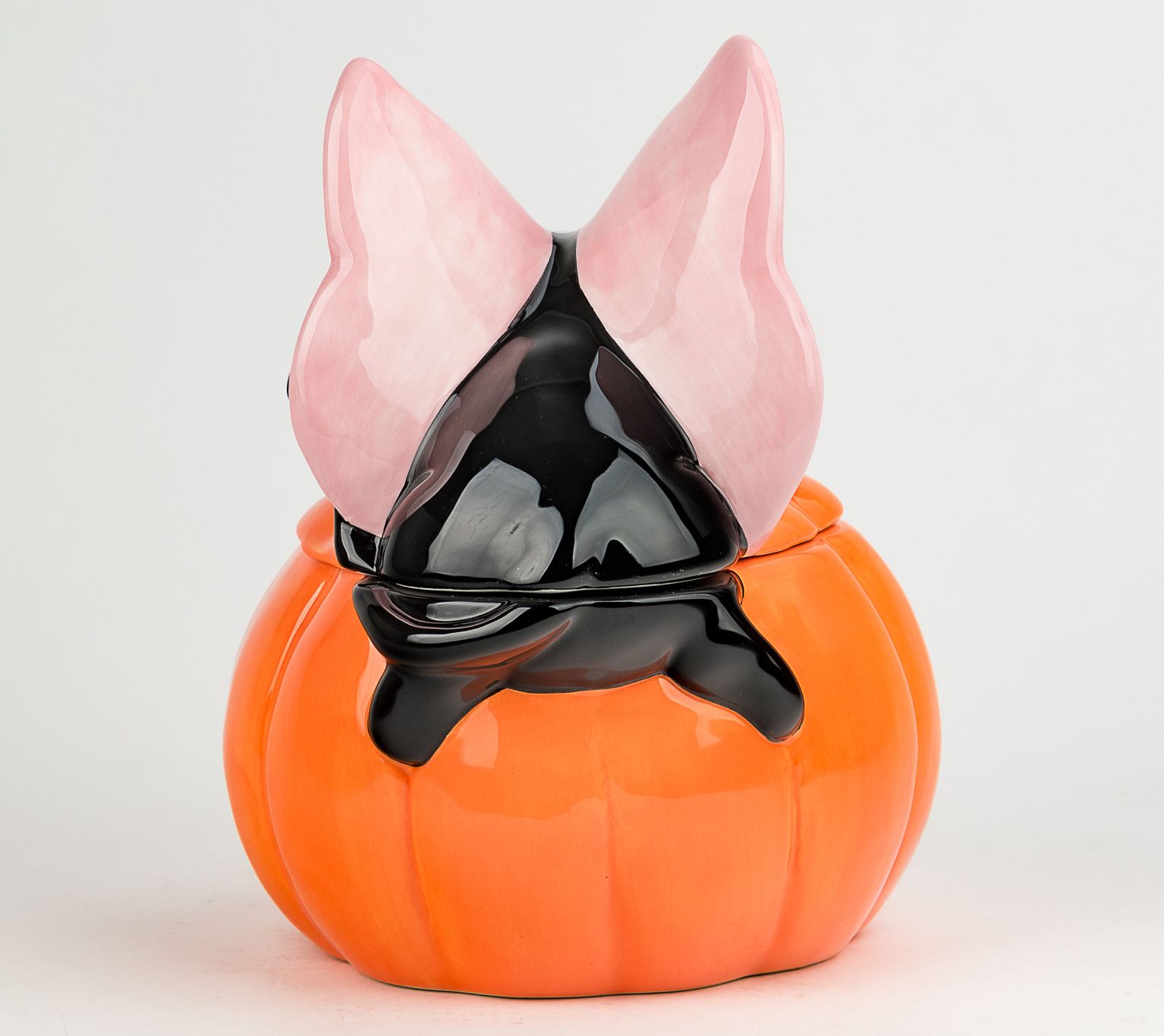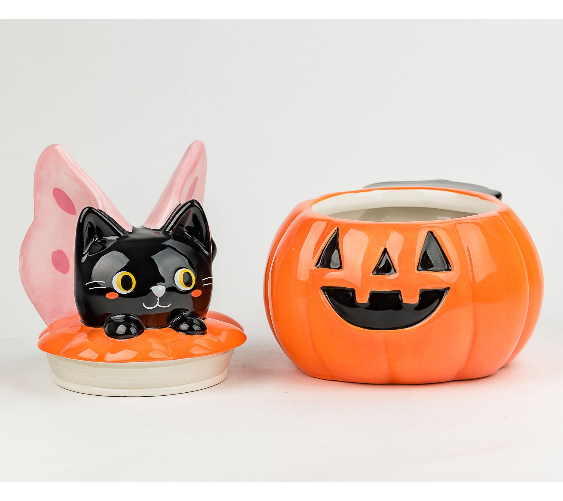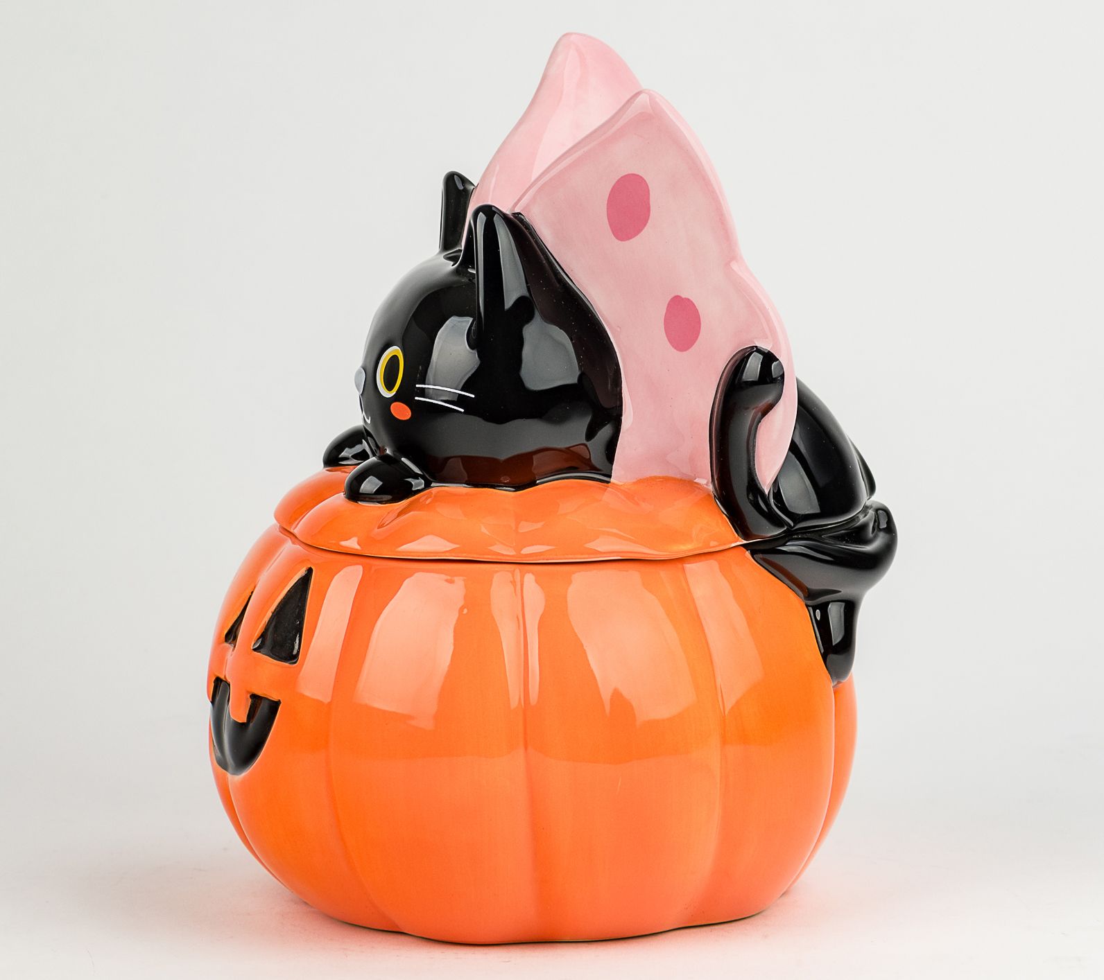Treat yourself to a touch of Halloween whimsy with this figural canister shaped like a mischievous black cat in costume. It adds playful charm and seasonal spirit to your countertop or shelf, ready to hold goodies, candies, or baking ingredients for gatherings and everyday enjoyment. From 10 Strawberry Kitty-fly.