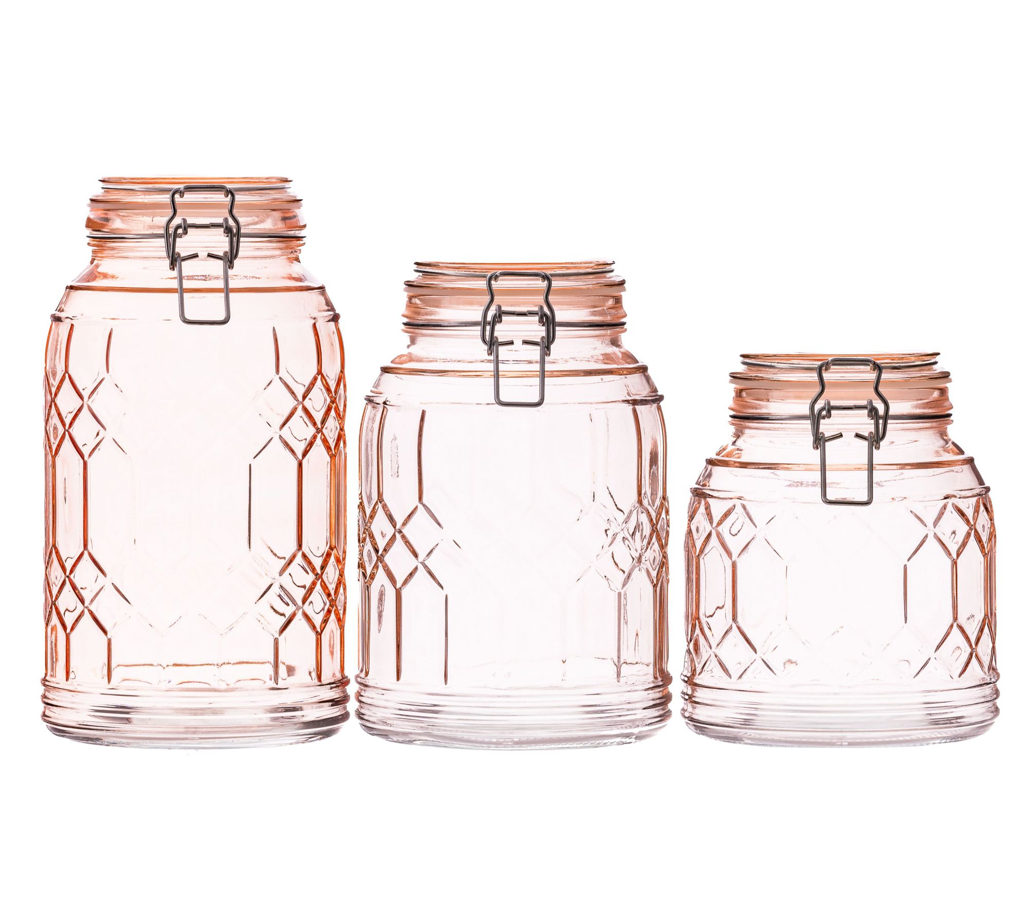 • Includes three glass canisters with lids: one small 44 oz canister, one medium 60 oz canister, one large 78 oz canister