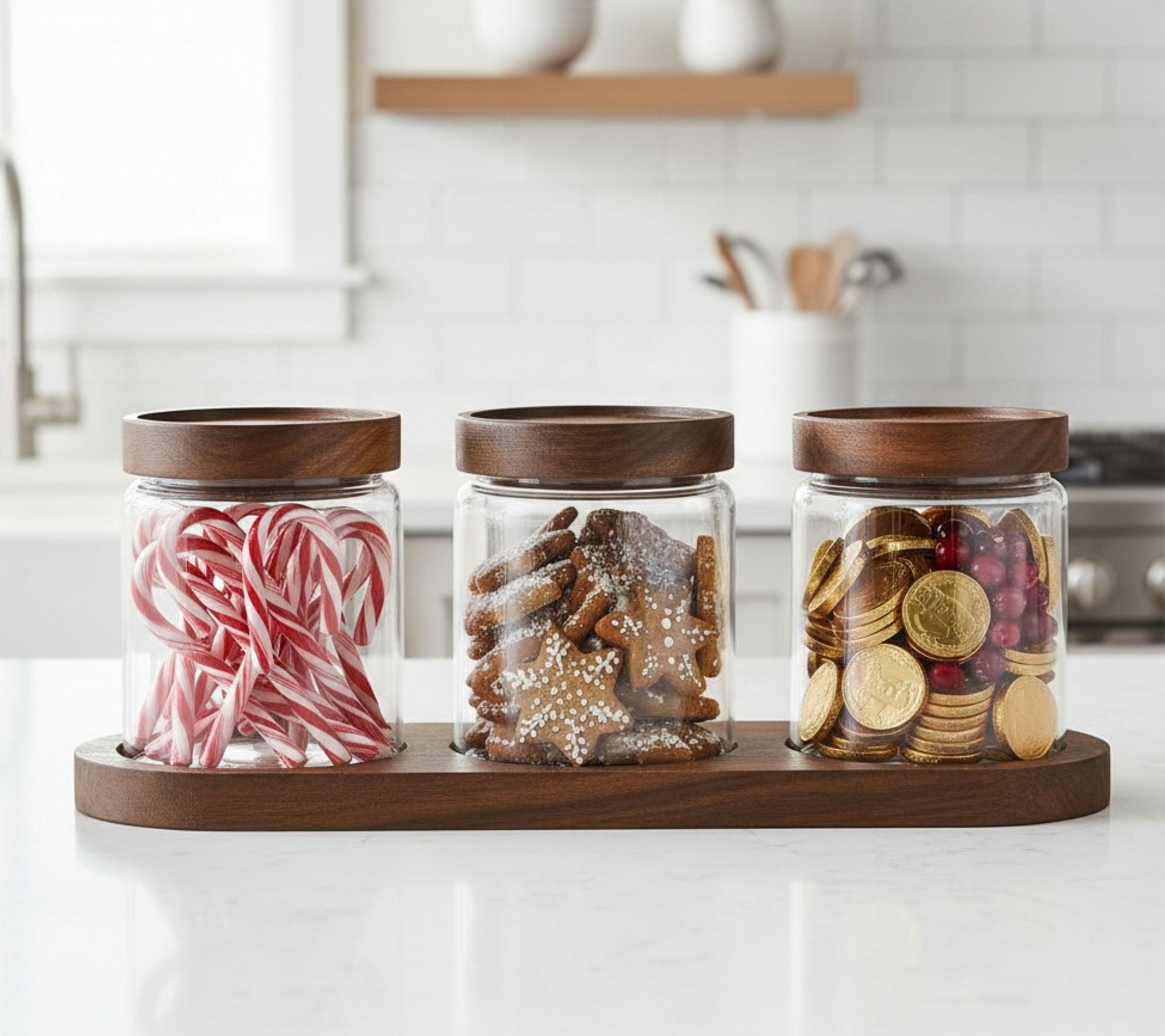 Transform your kitchen countertop with this round glass canister set and coordinating acacia wood tray -- a stylish way to organize ingredients, snacks, or coffee beans while keeping everything in view. Acacia wood lids with silicone gaskets help create secure storage, seamlessly blending beauty and function for everyday use and easy access. From 10 Strawberry Street.