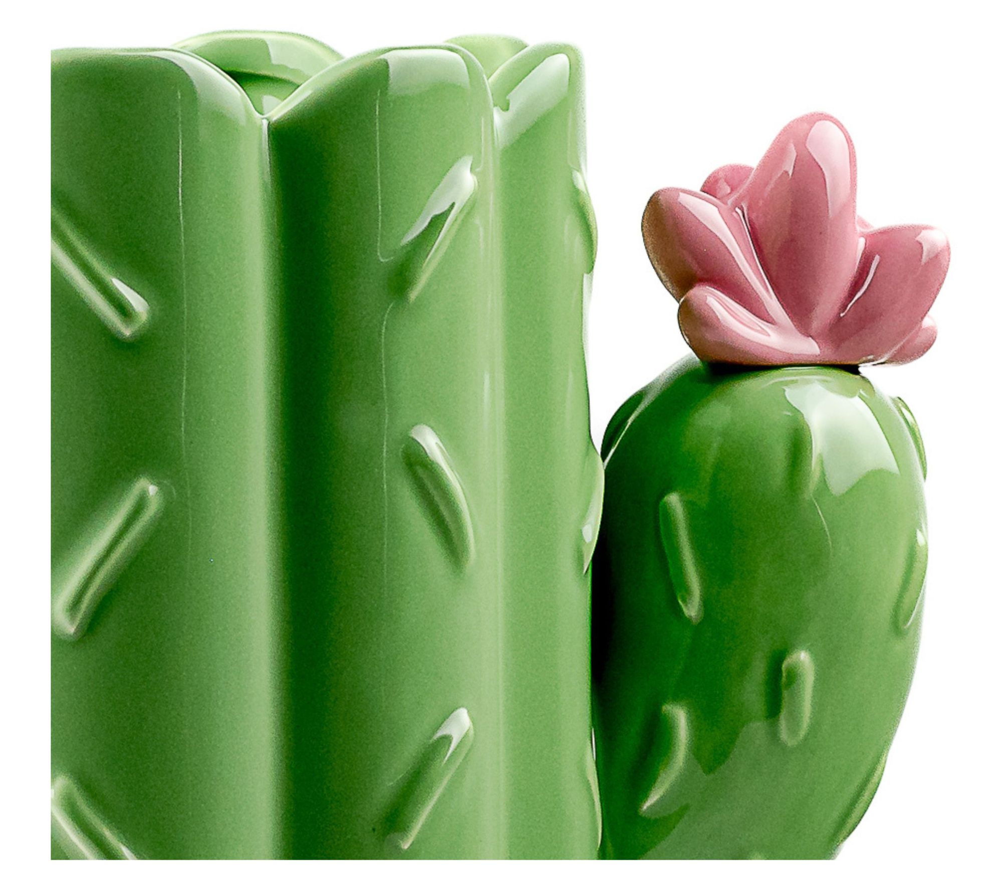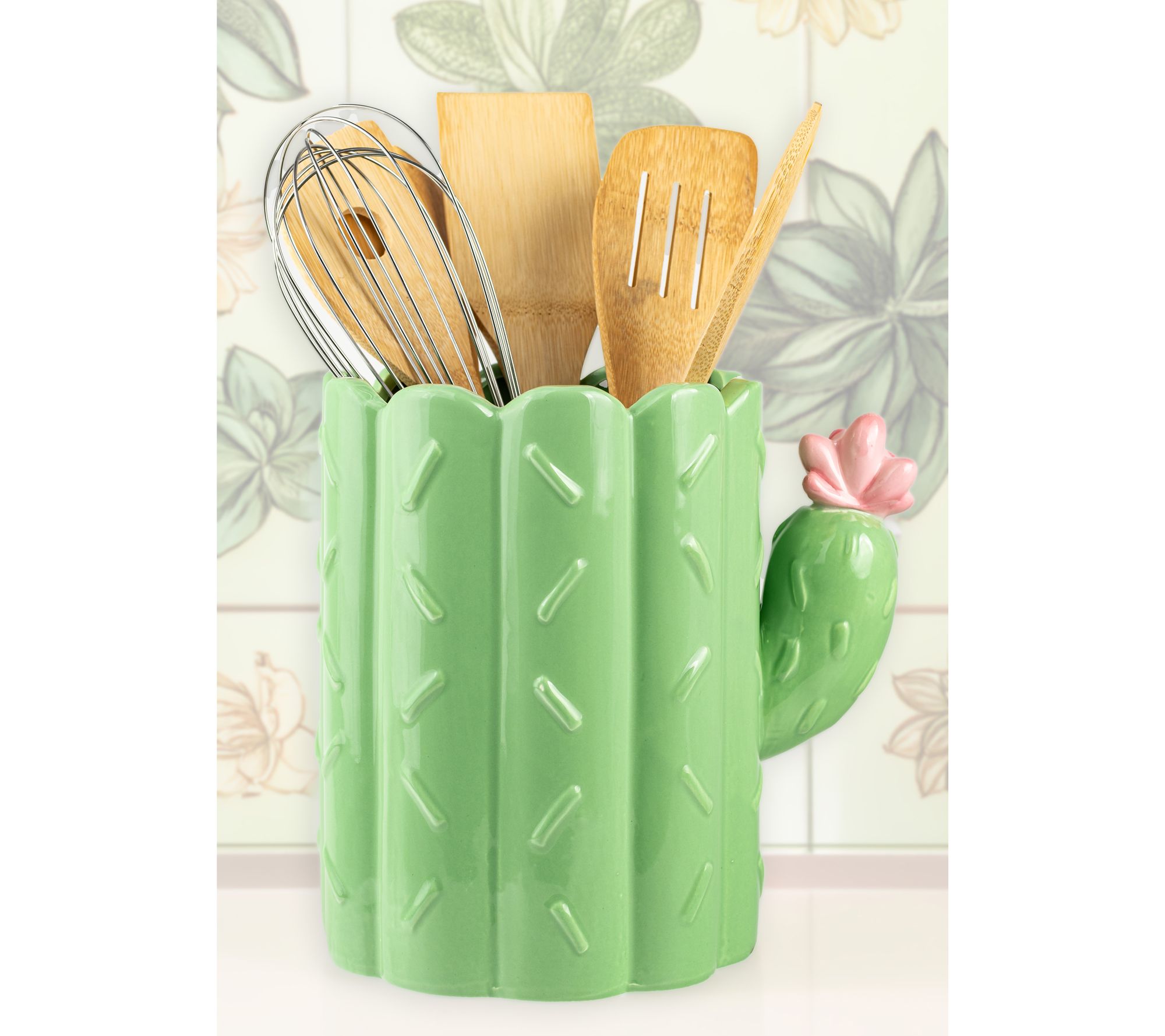 Add a touch of desert charm to your kitchen with this cactus-shaped utensil crock. The vibrant green finish and pink flower accent make it both decorative and practical for storing your cooking tools. From 10 Strawberry Street.
