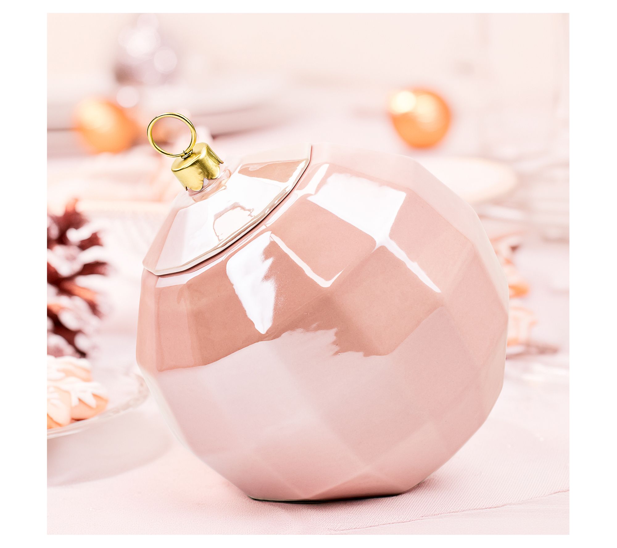 • Shimmering pink finish and festive design adds holiday cheer