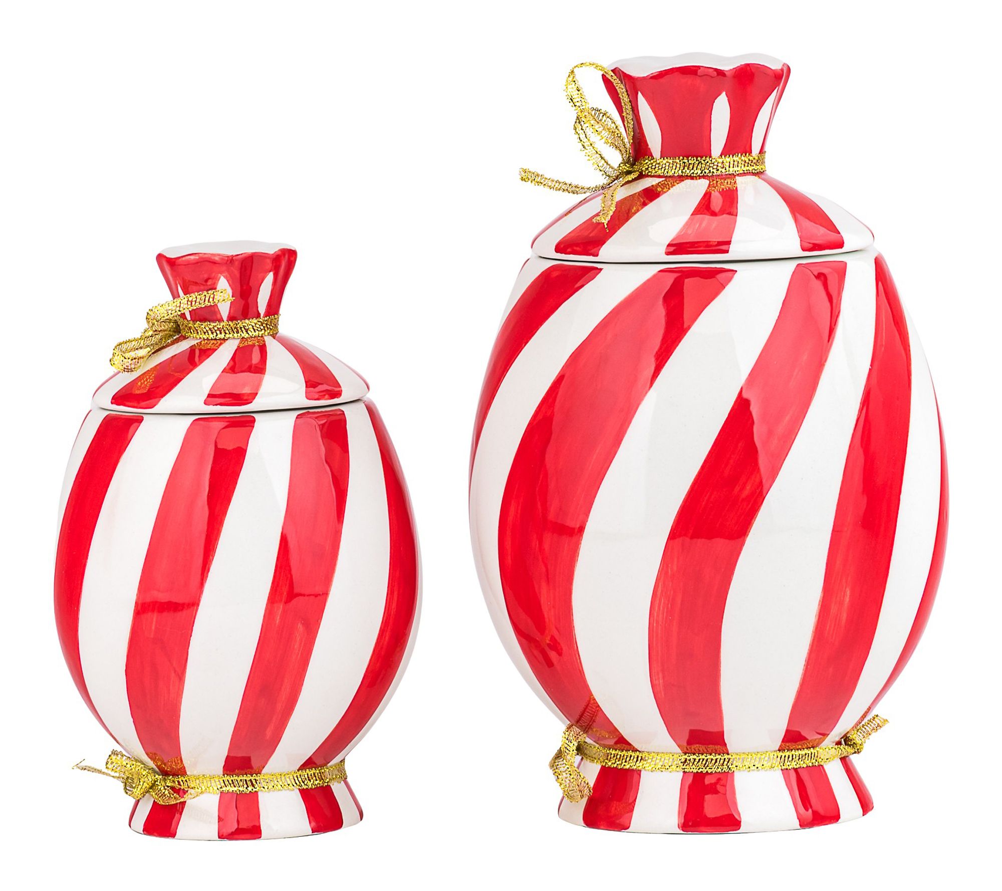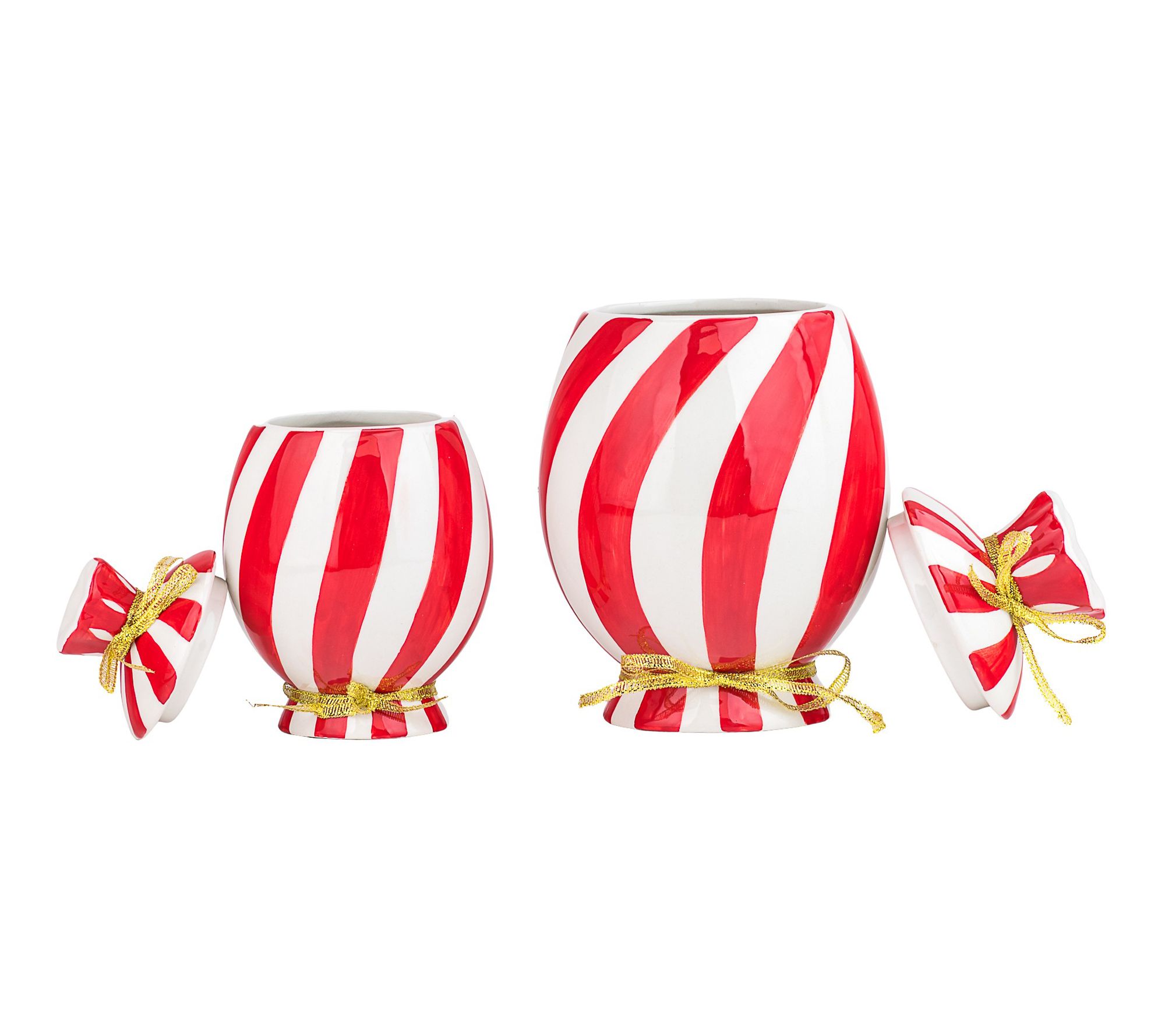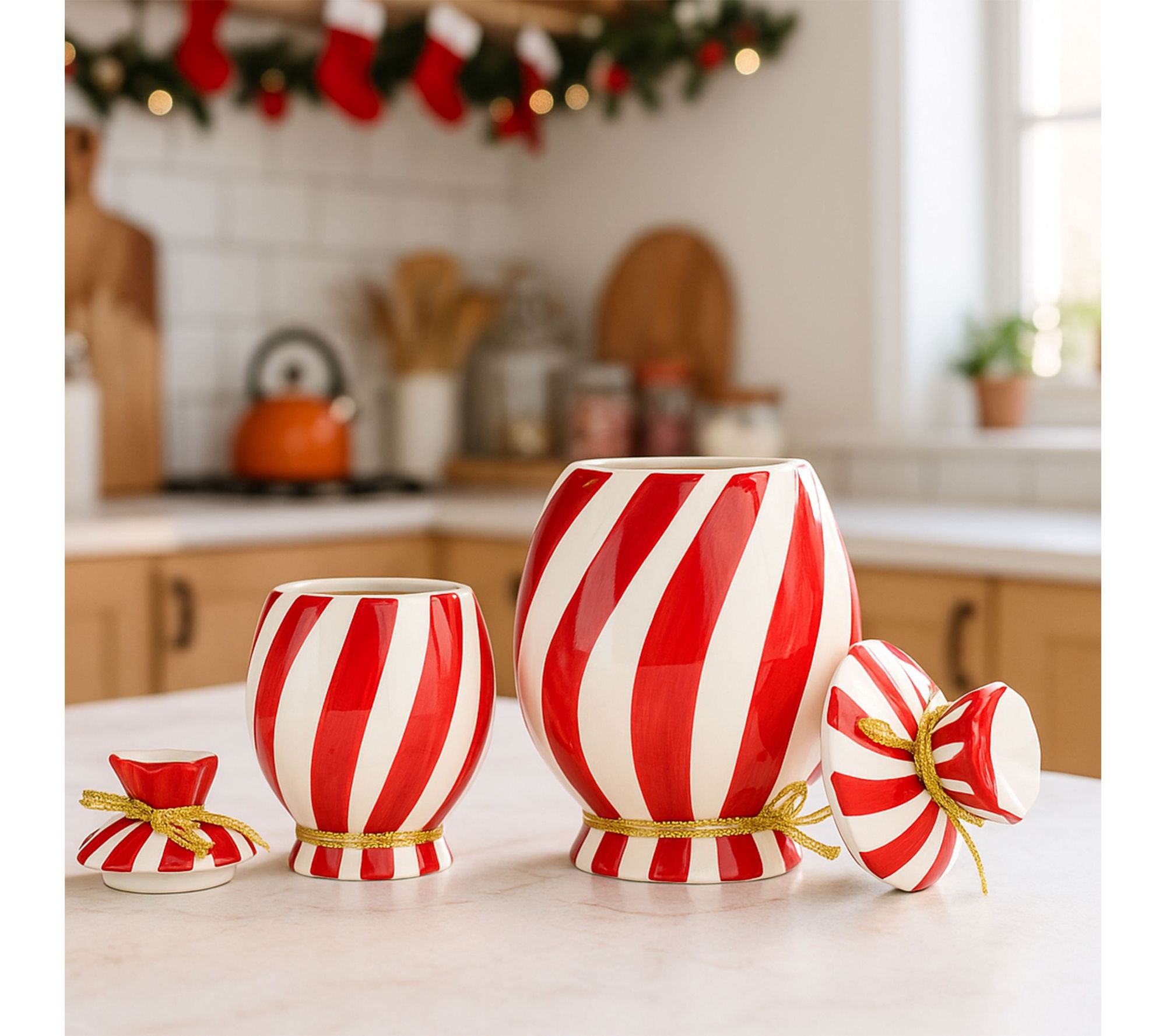 Bring a dash of holiday cheer to your kitchen with these figural canisters shaped like wrapped peppermint candies -- ideal for storing cookies, candies, or cocoa packets. Whether displayed on your countertop or used for festive treats, the graduated sizes offer versatile storage while adding a playful touch to your seasonal decor. From 10 Strawberry Street.