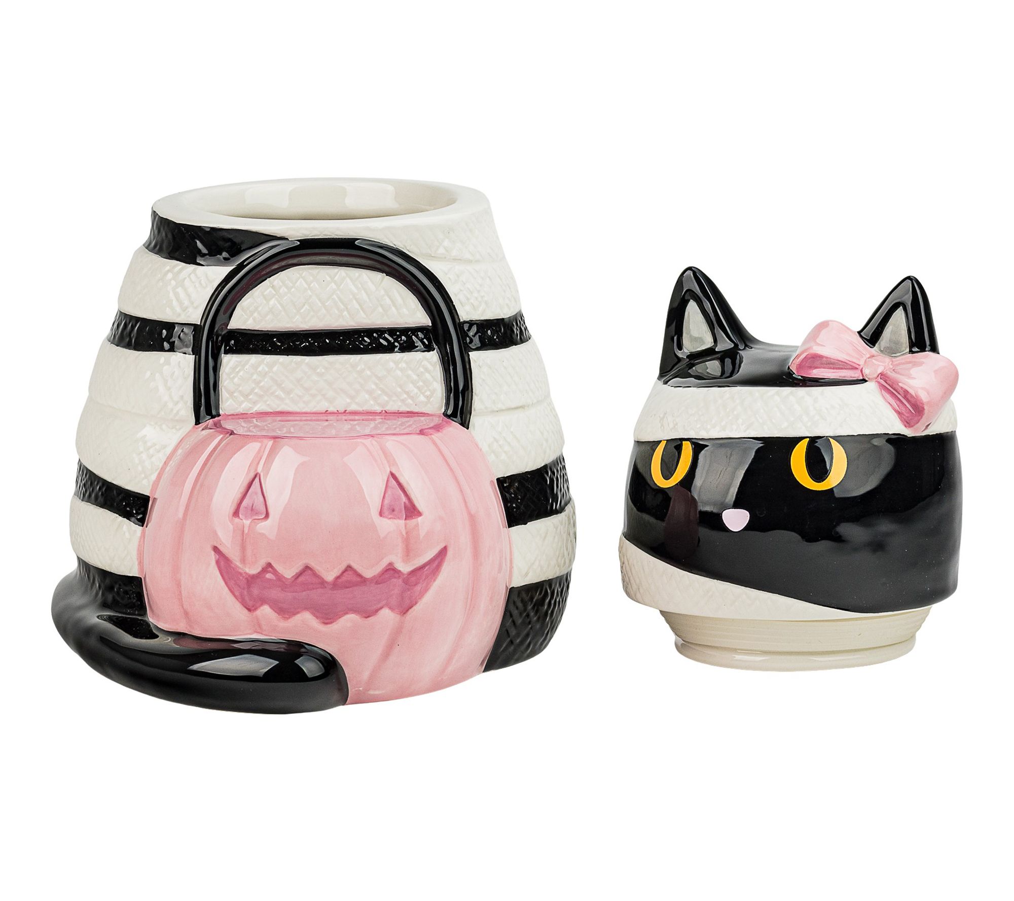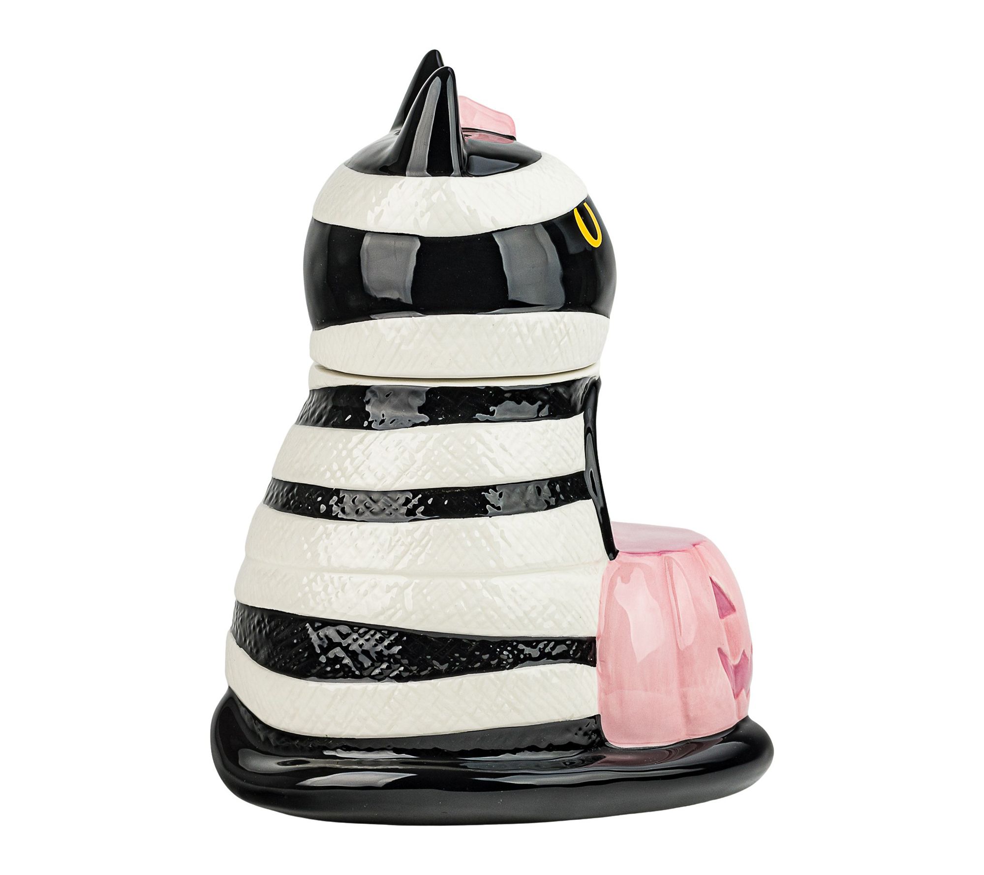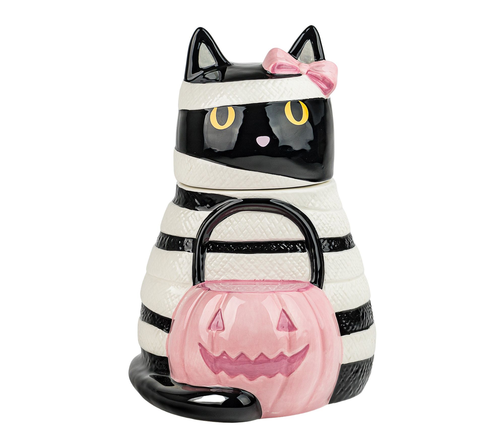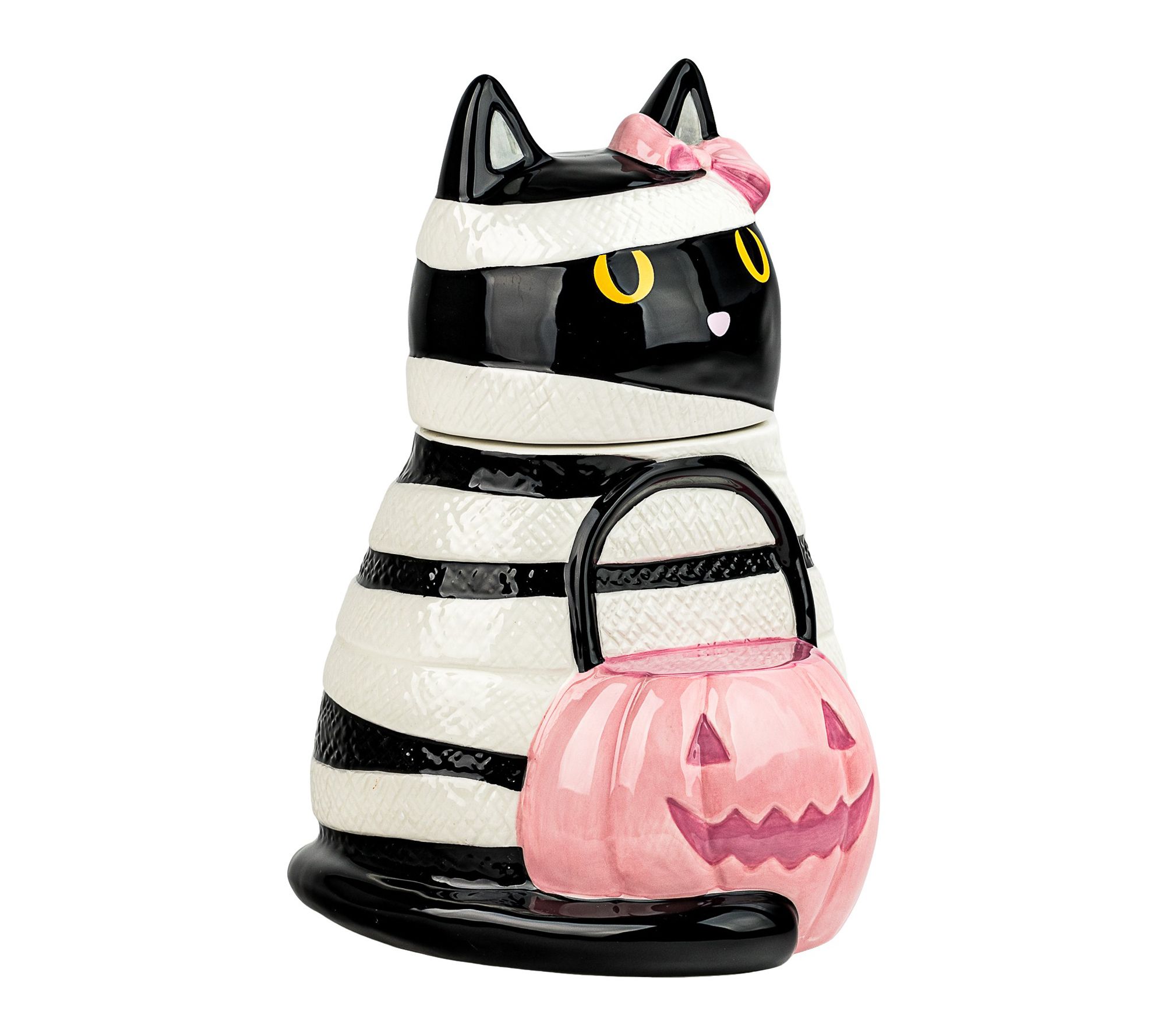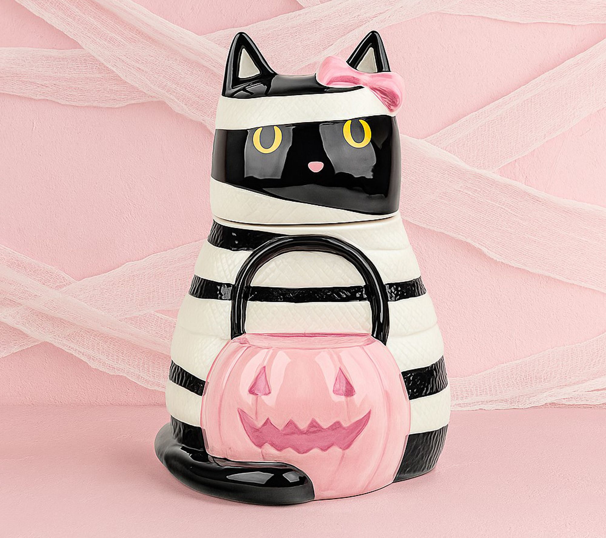 Halloween treat time gets extra charming with this mummy cat cookie jar, bringing a touch of mischief and delight to your kitchen counter. Stash your cookies or candy in the roomy canister, featuring a glossy finish and whimsical black cat dressed in a mummy costume, topped with a pink trick-or-treat bucket. Its playful presence is sure to spark smiles during festive gatherings. From 10 Strawberry Street.