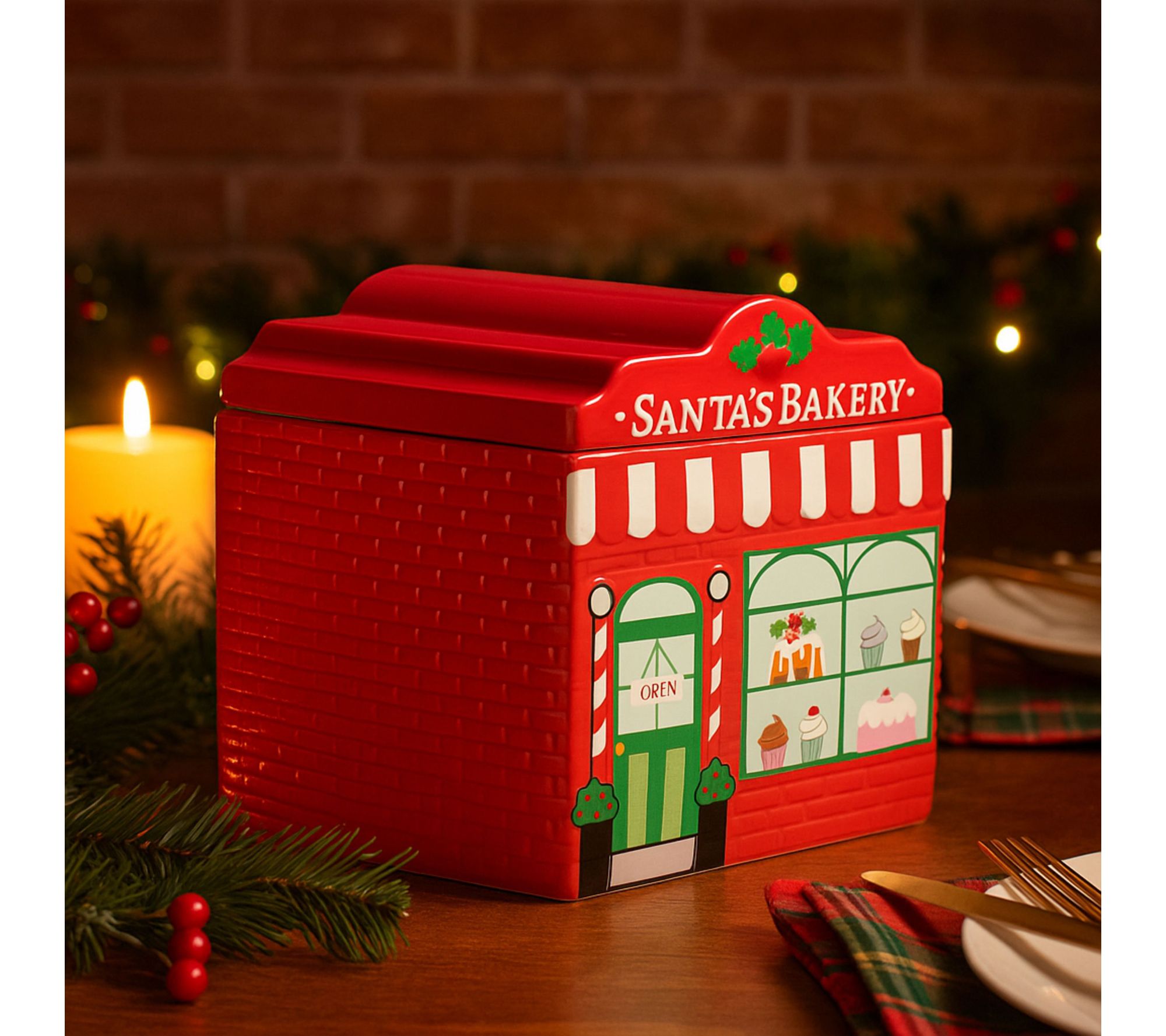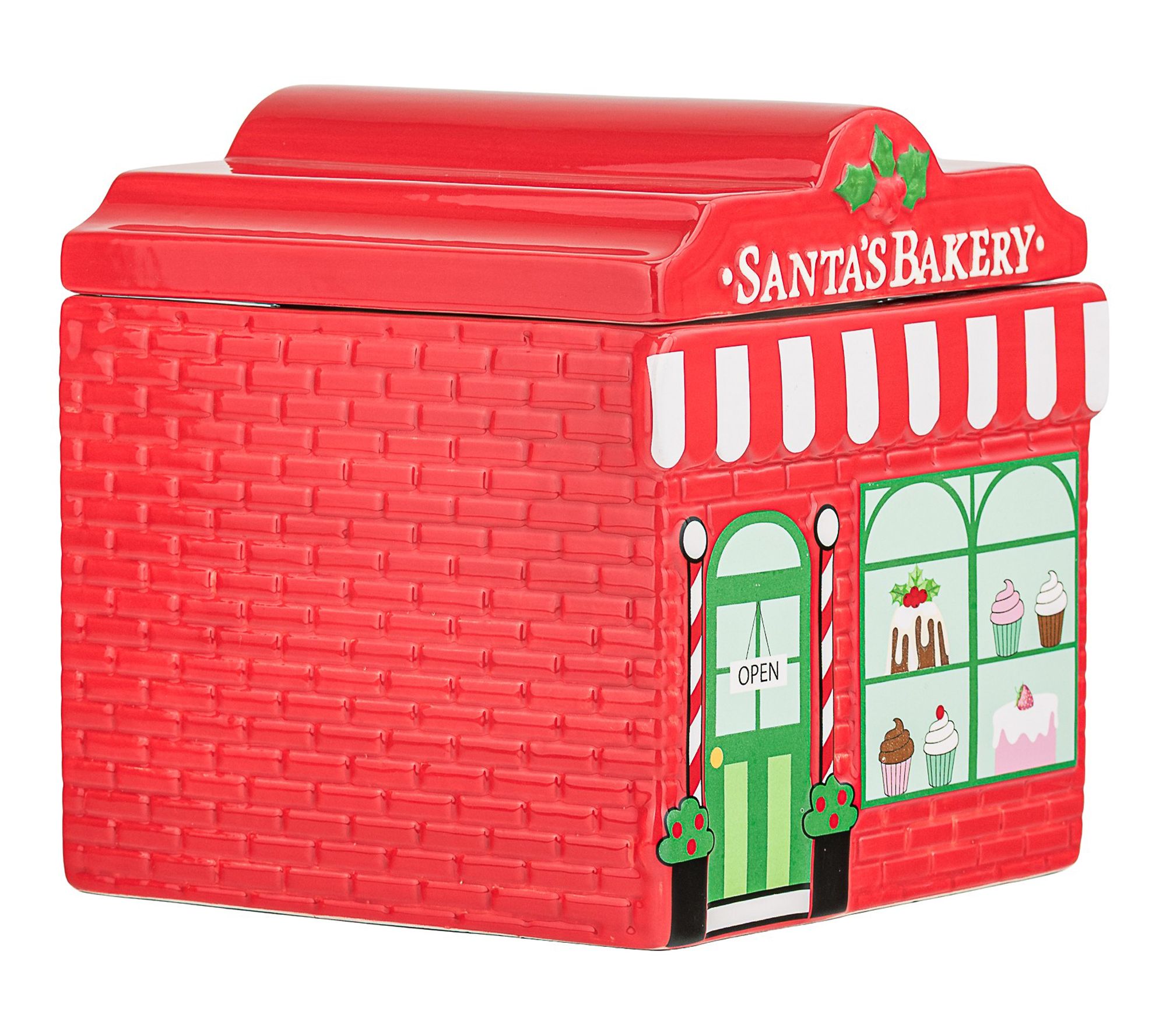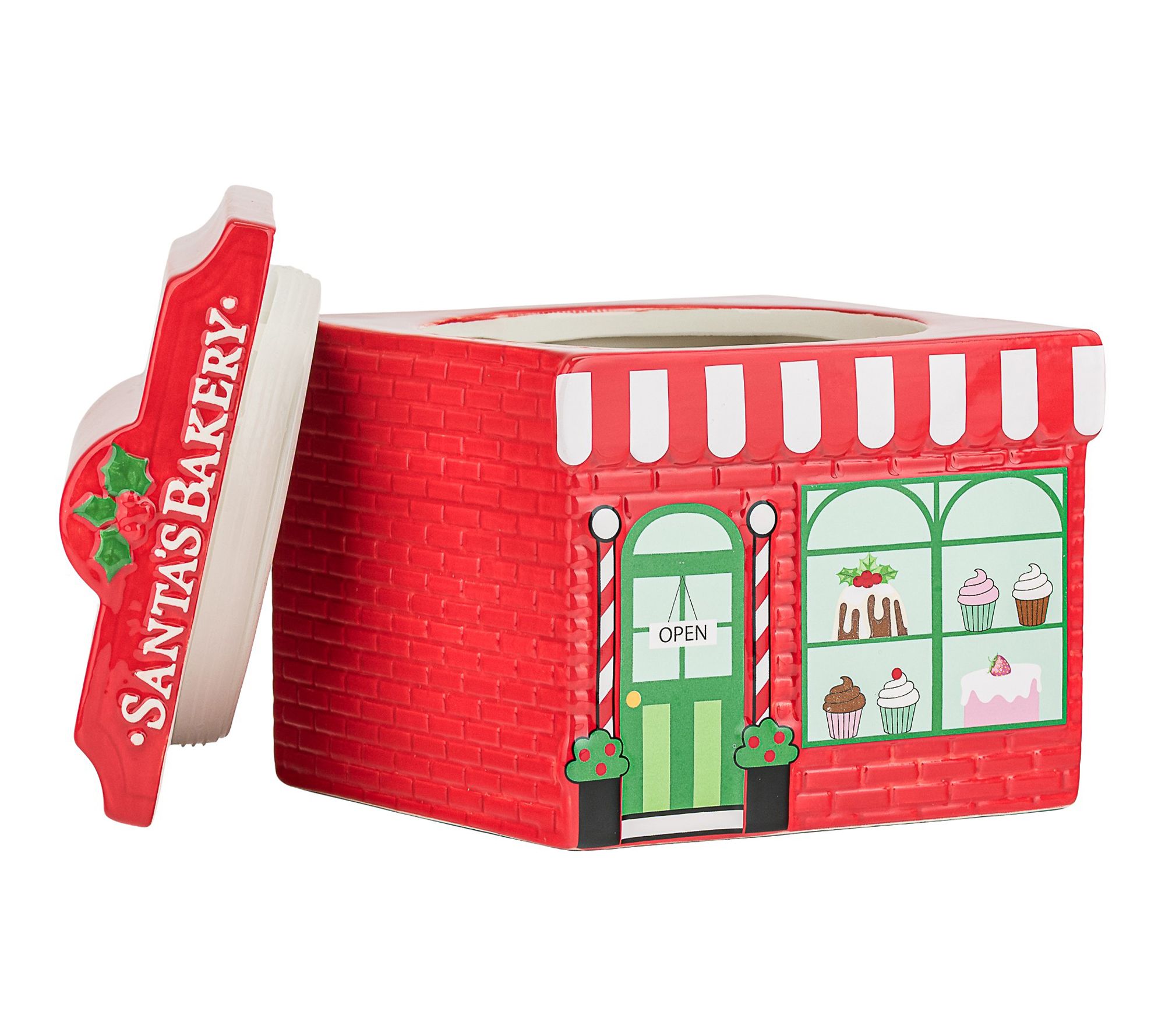 • Shaped like a festive Santa Cafe bakery with vibrant red and green trim