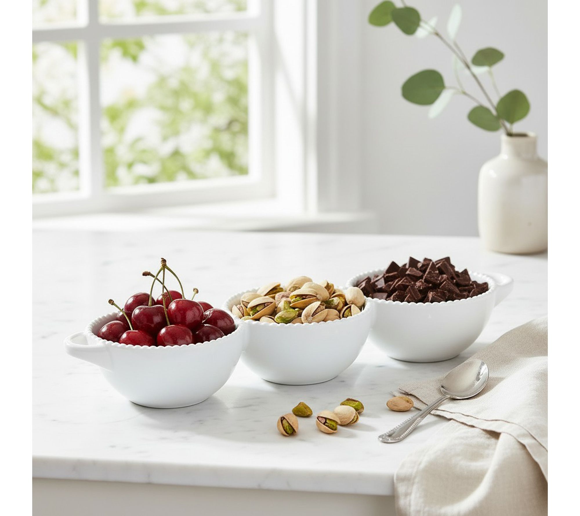 • Sculpted ceramic trays with beaded rims and three-sectioned bowls with side handles for easy serving
