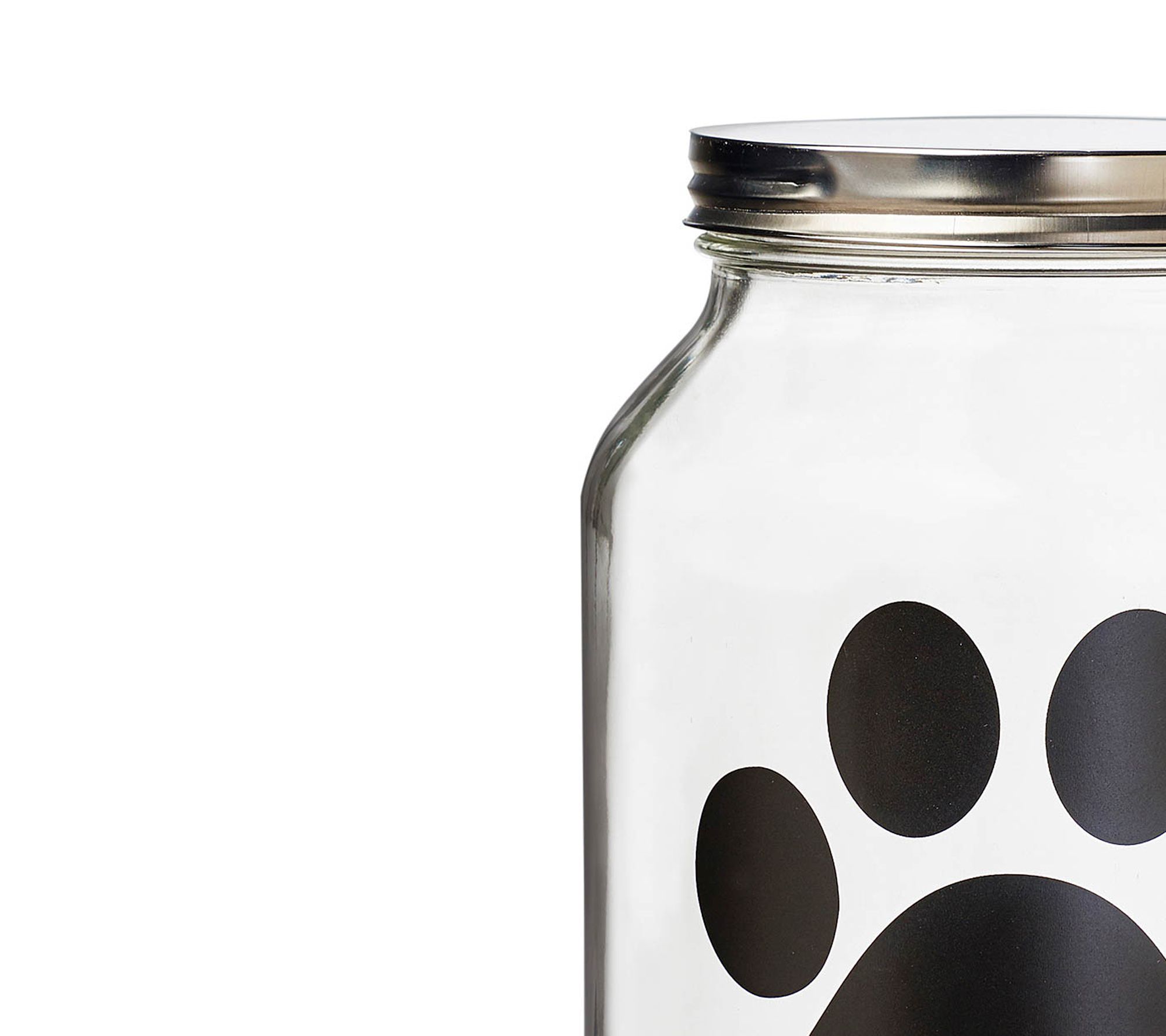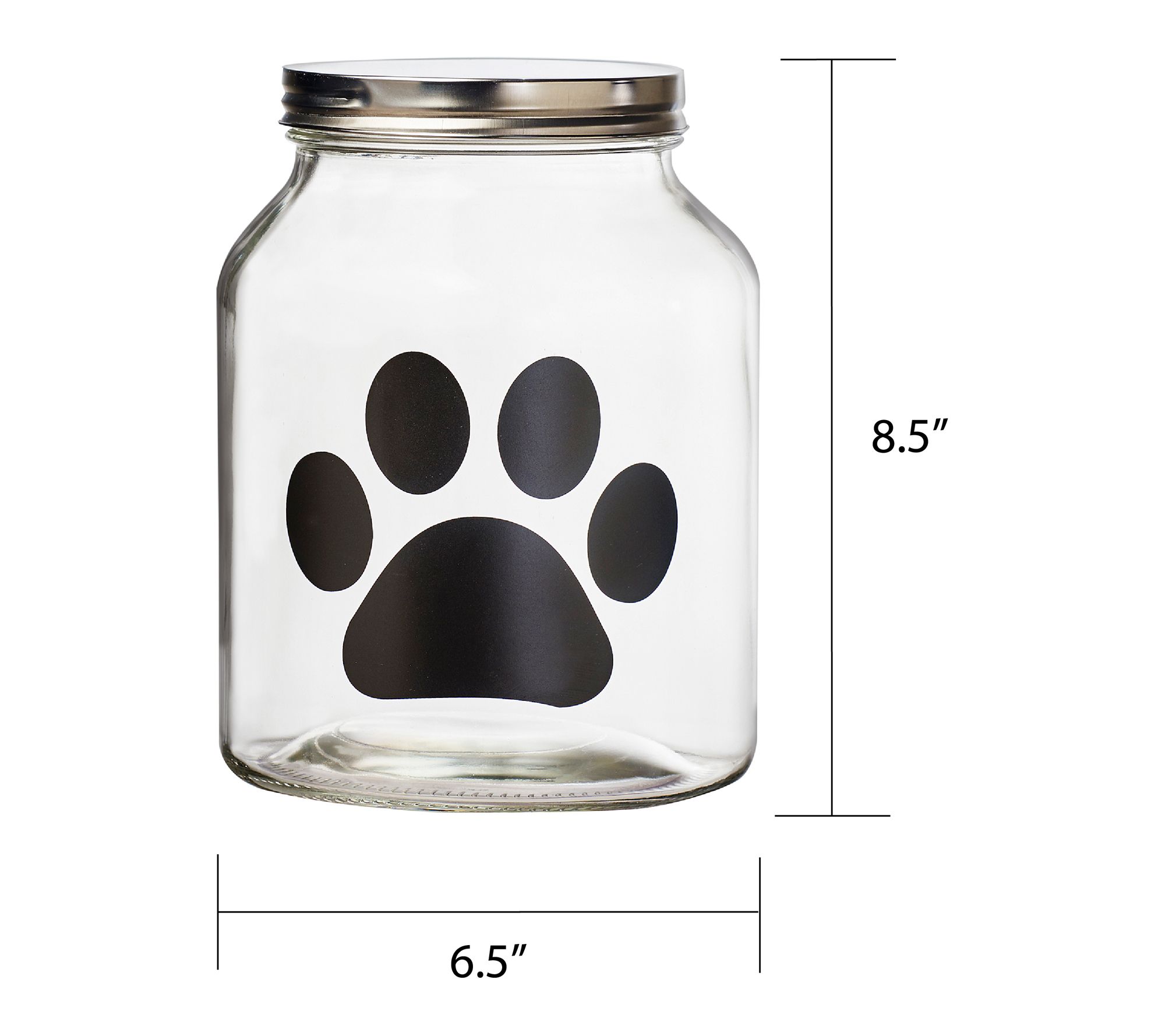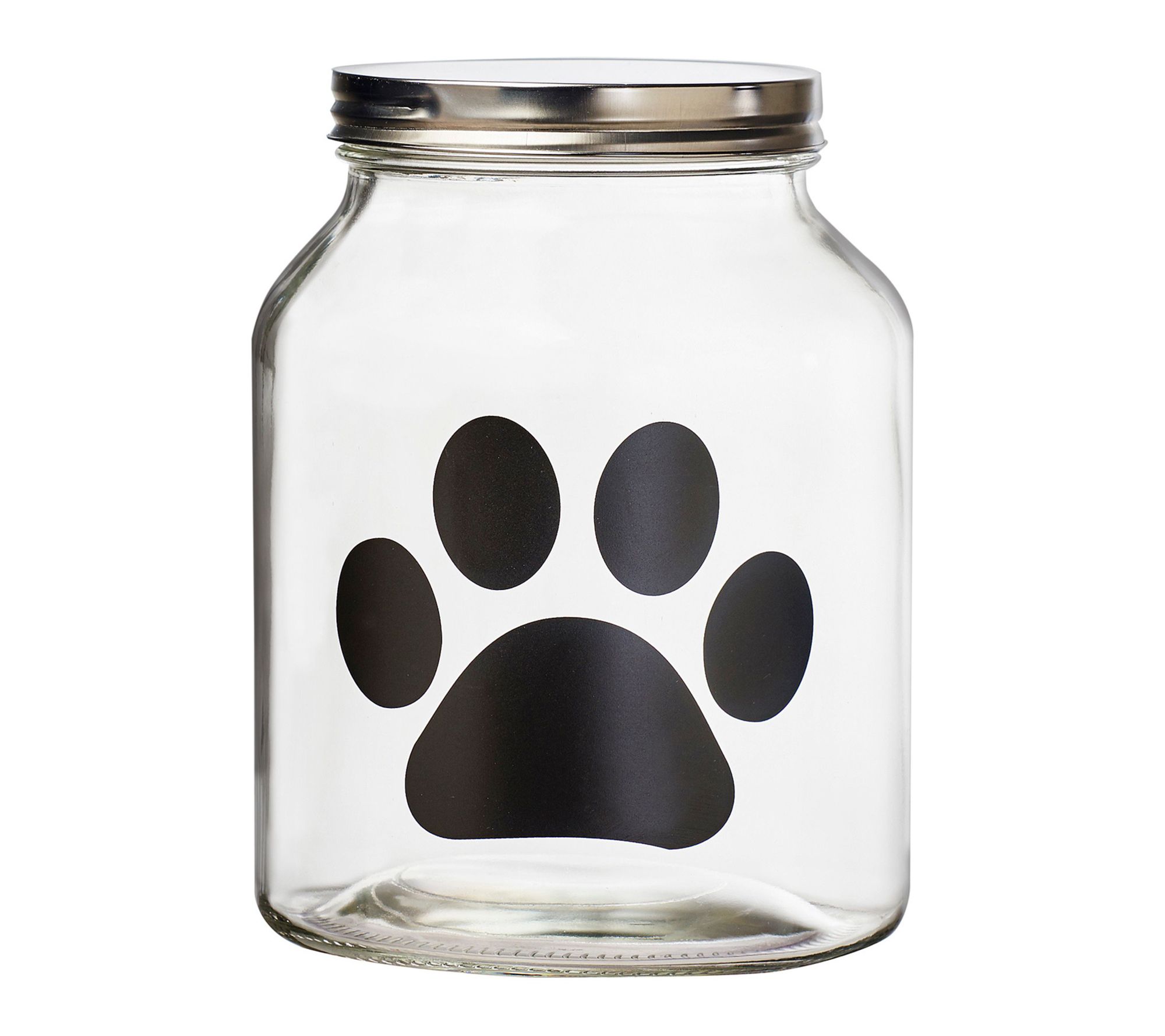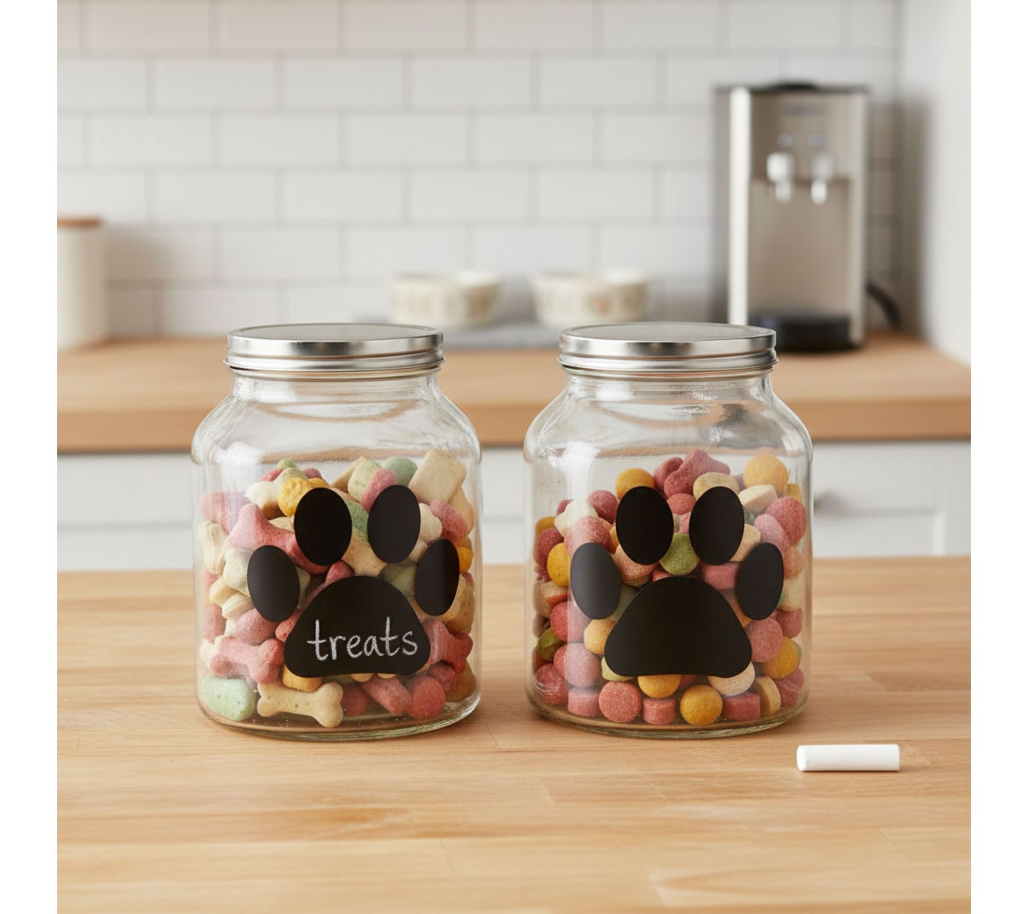 Keep your pet’s food fresh and organized with these spacious glass storage canisters, designed with a metal twist lid and silicone gasket for an airtight seal. A playful paw print chalkboard decal lets you label treats, kibble, or essentials using the included chalk, adding a fun touch to your pet’s feeding area. From 10 Strawberry Street .