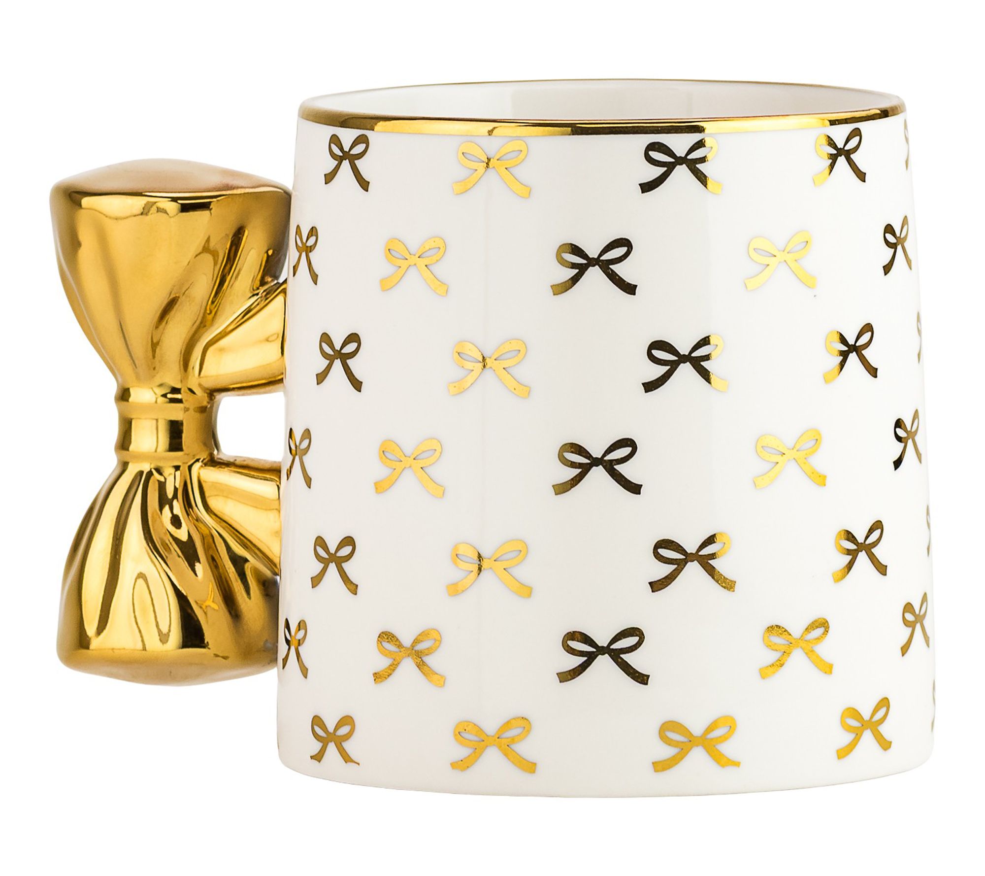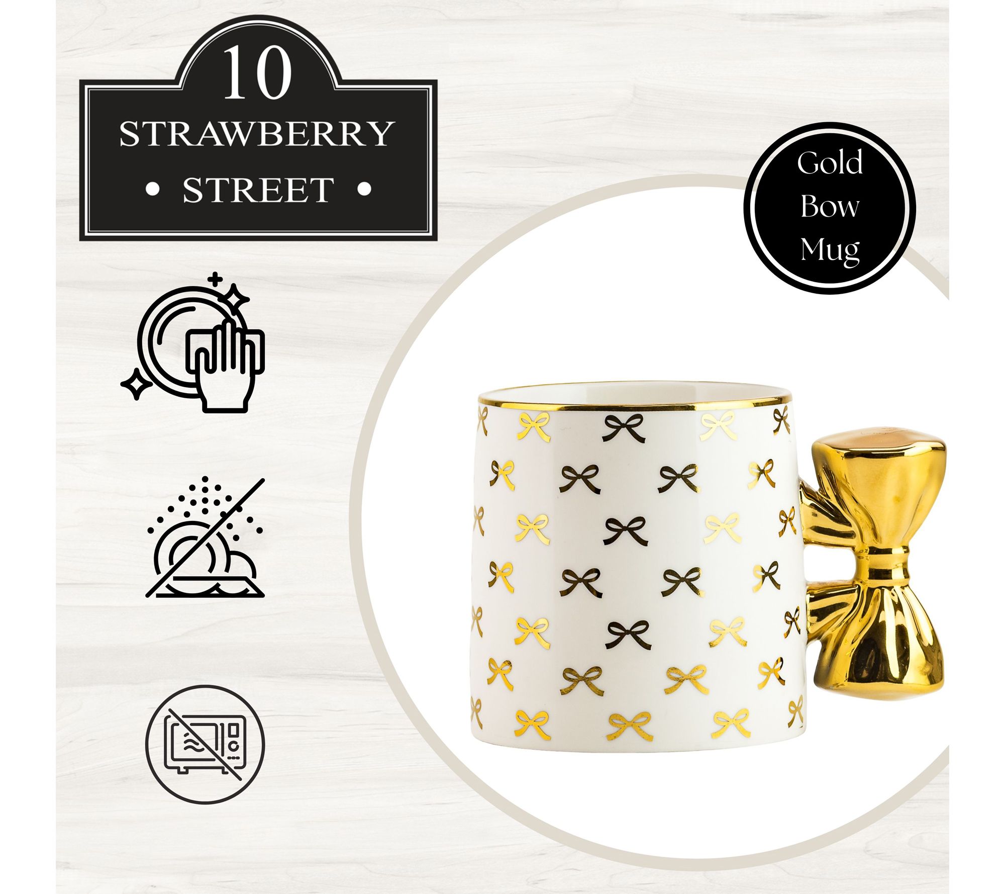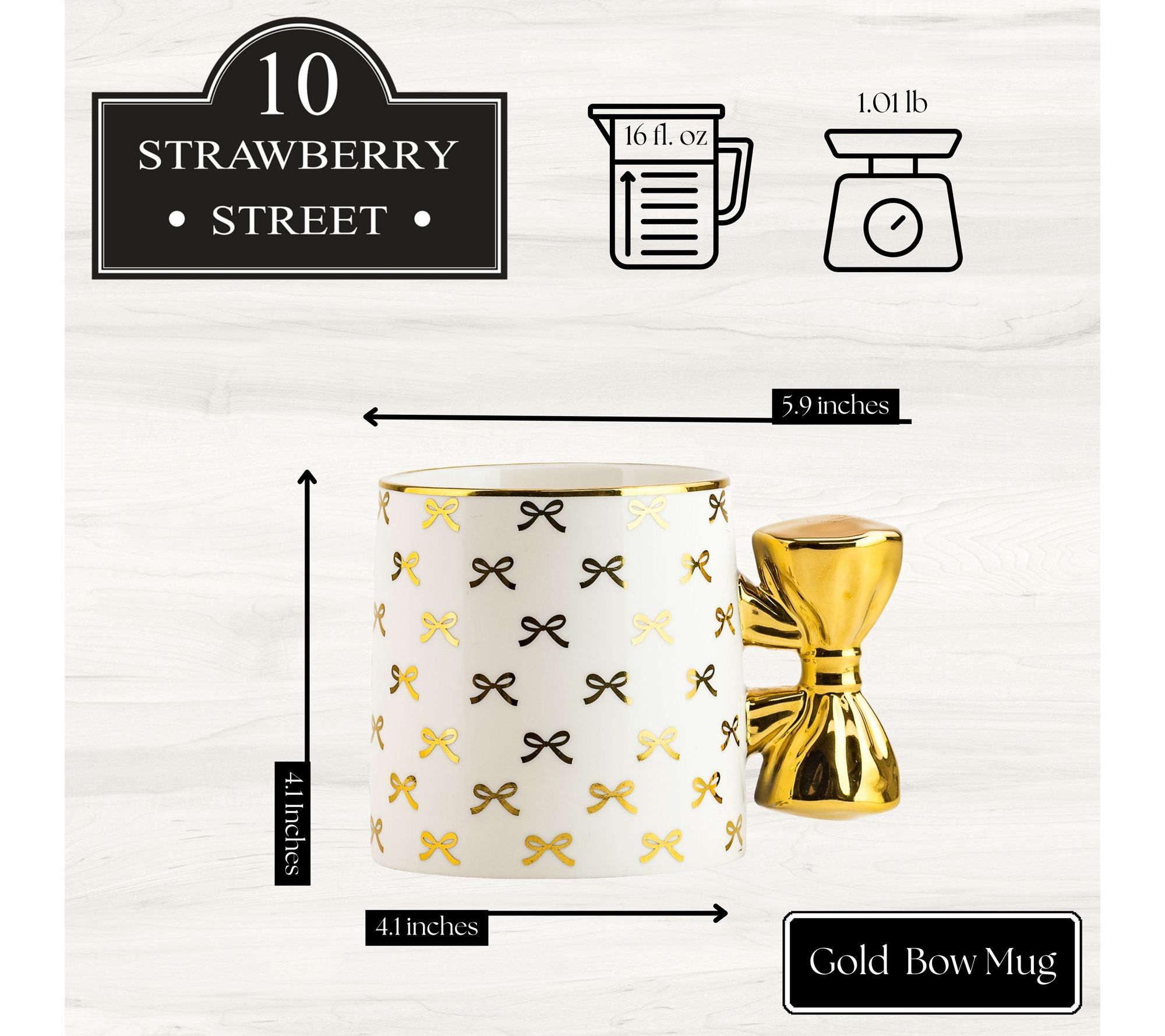 Brighten up your coffee breaks or gatherings with this set of 16-oz mugs, each adorned with an allover gold bow pattern and a playful figural bow handle. Whether you're enjoying a cozy cup of cocoa or serving guests during the holidays, these mugs add a sparkling touch of charm and chic style to your table. From 10 Strawberry Street.