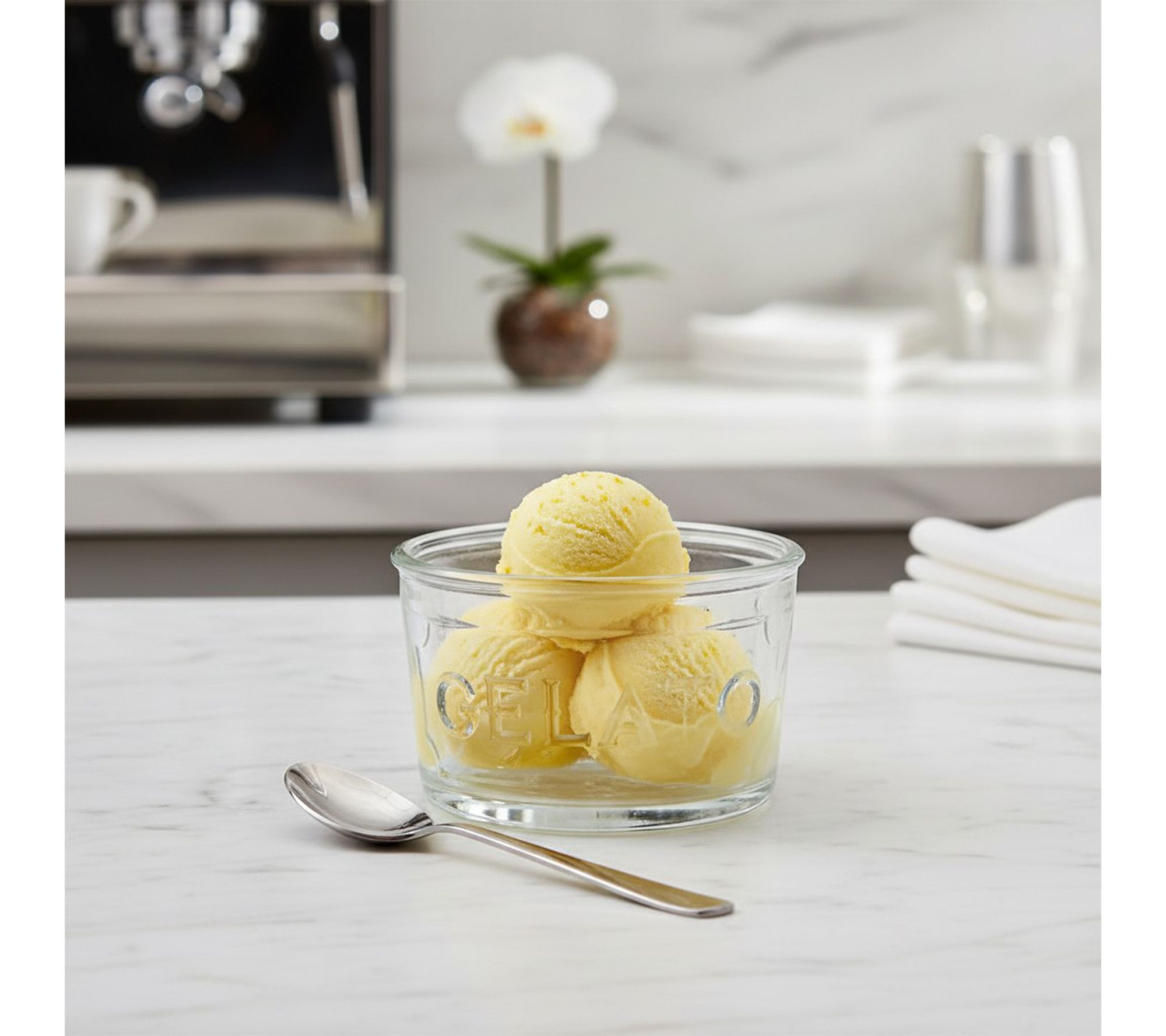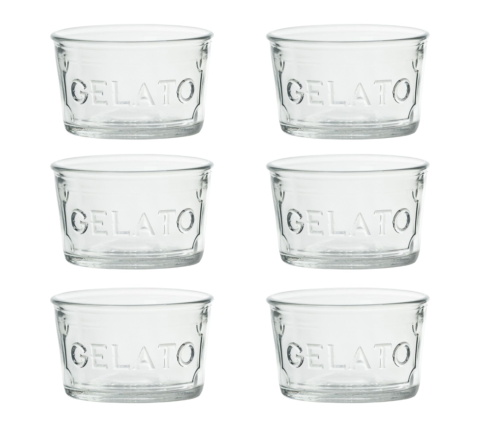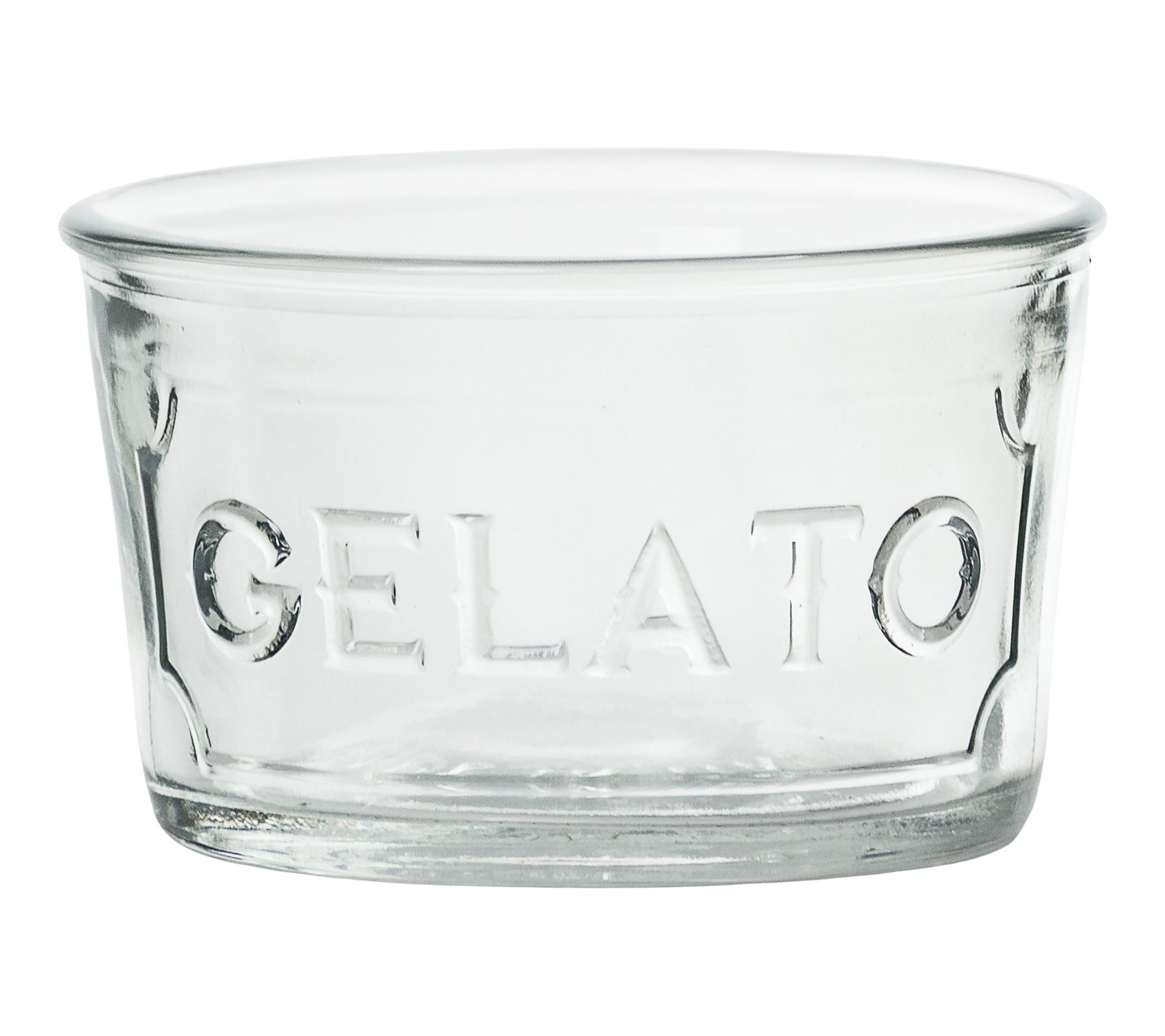 • Clear glass design featuring an embossed "gelato" label
