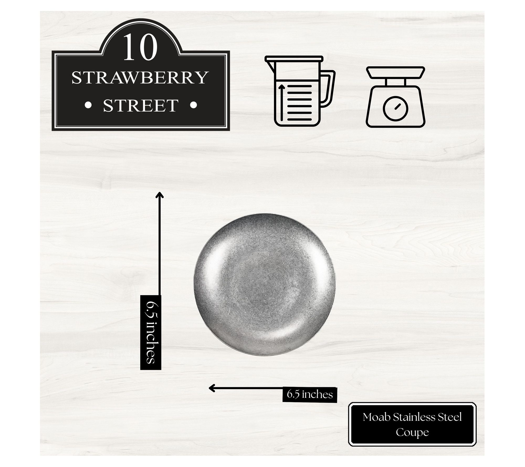 • Includes six stainless steel round coupe plates