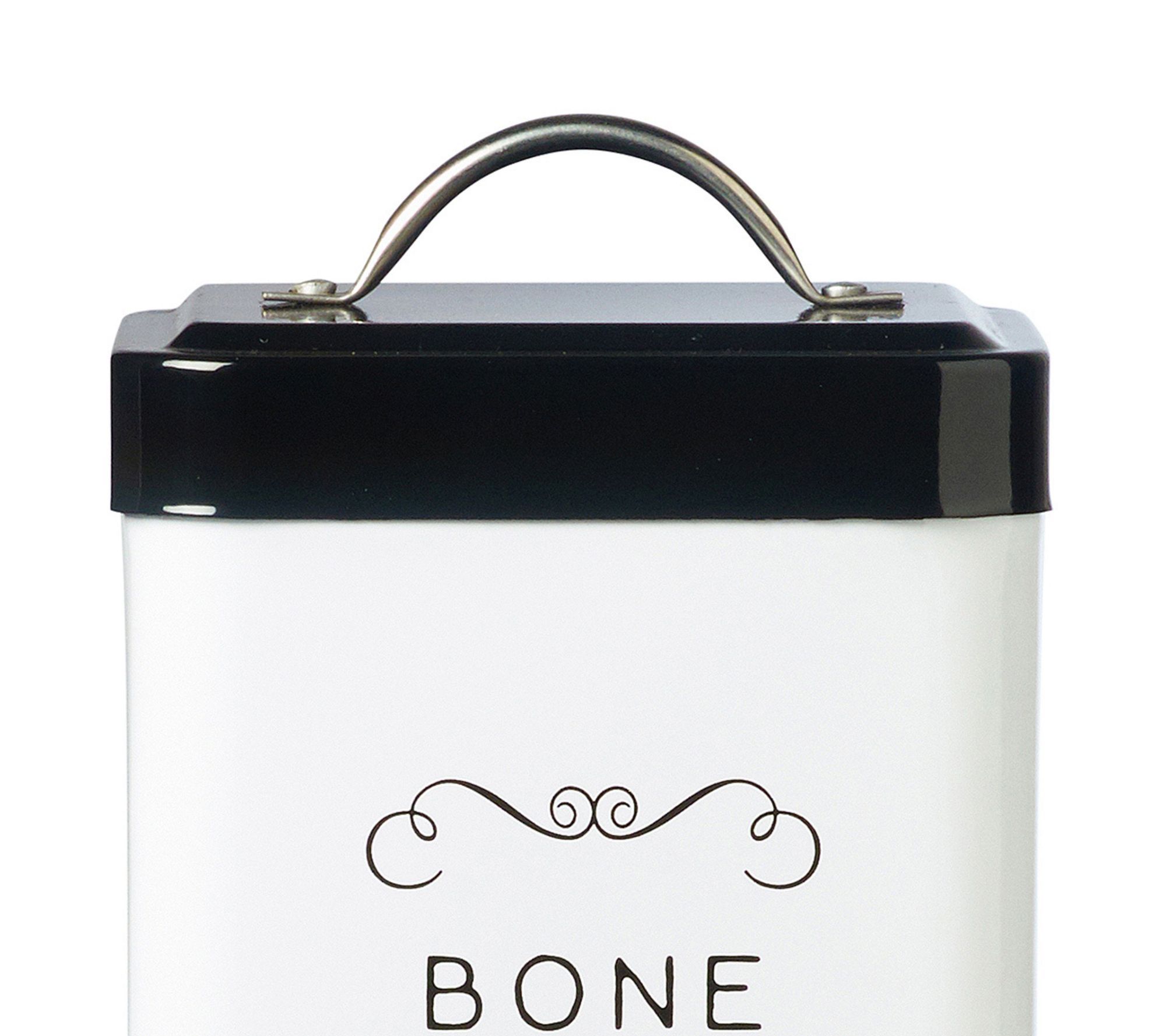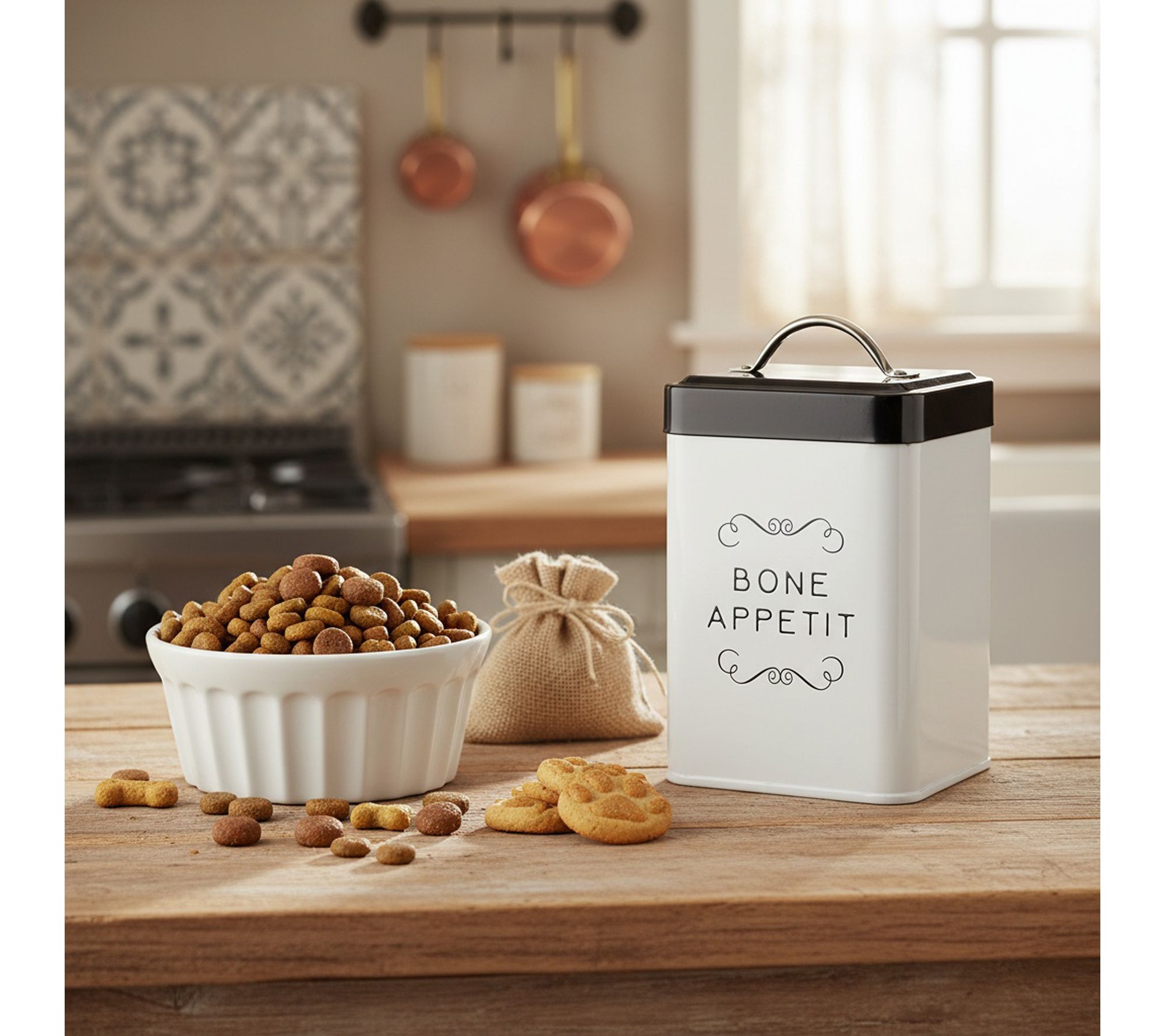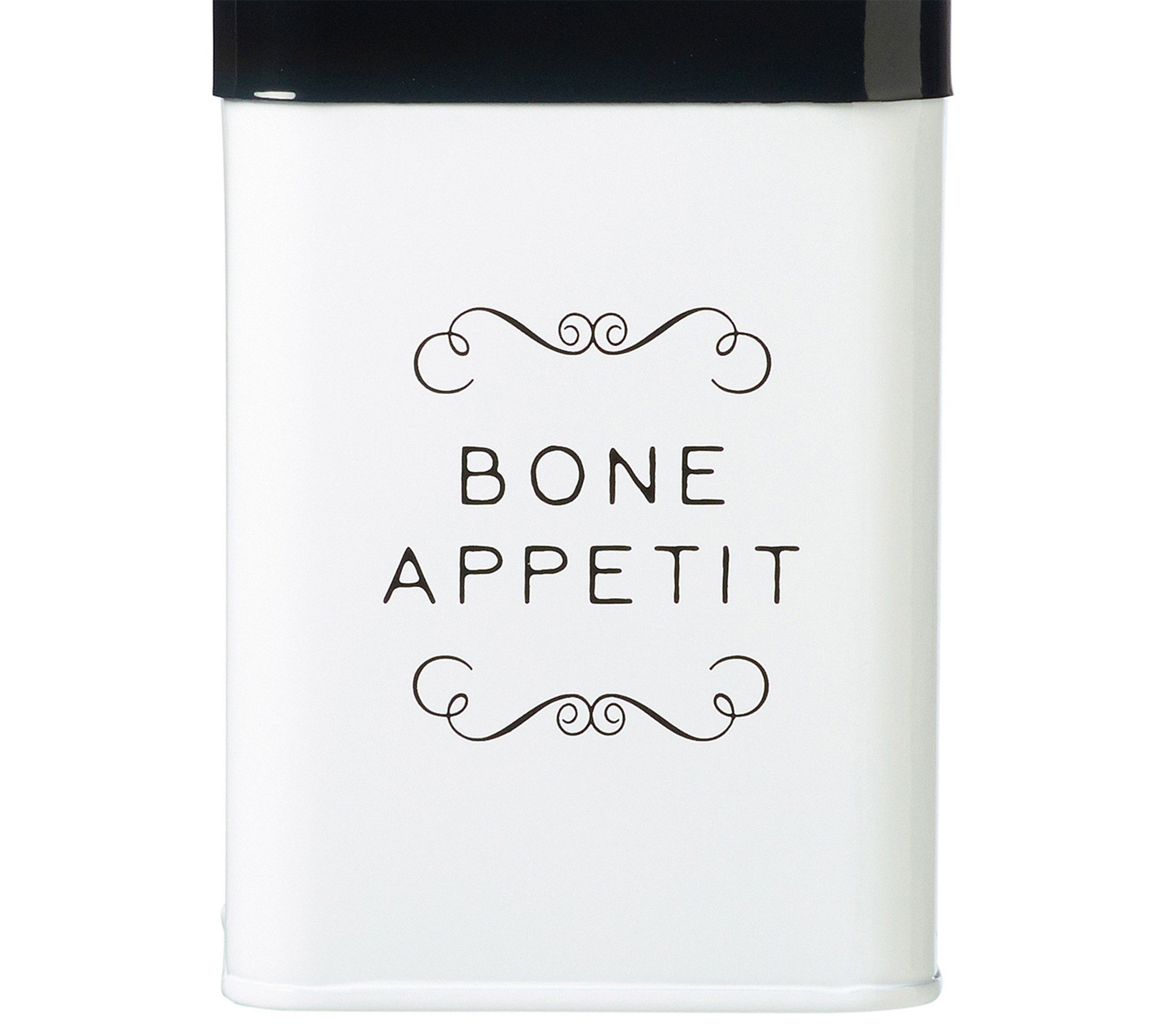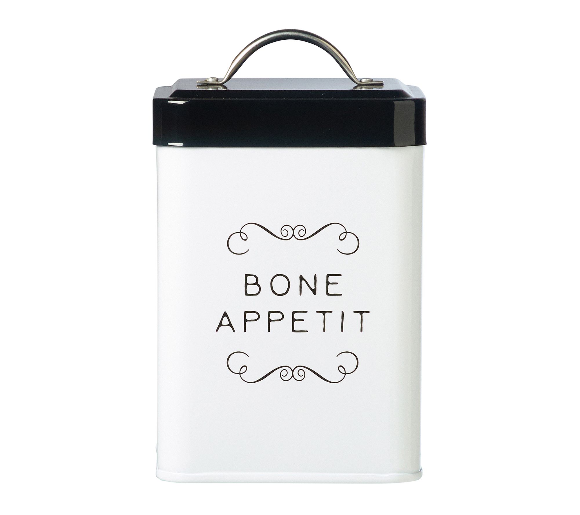 • Organizes pet treats or food with style; decorative design with "Bone Appetite" printed on the front