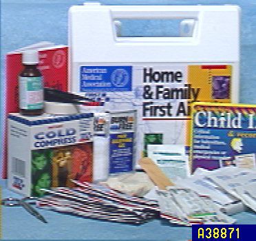 The home & family first aid kit has a First Aid Guide, 1 pair of latex gloves, 1 Child I.D. and records kit, 1 oz. IPECAC Syrup, 1 pair small scissors, 1 finger splint, tweezers, 1 trauma pad, 1 eye pad, 3 sting relief pads, a roll of gauze, 15 alcohol cleansing pads, 9 antiseptic cleansing wipes, 2 antibiotic ointments, 1 instant ice cold compress, 10 dinosaur children bandages, 25 band aids, 3 pks. Ibuprofen, 3 square patches, 2 packets burn gel, 10 children bandages, (8) 2 x 2 gauze dressing pads, & 1 roll adhesive tape all in a plastic case. USA.