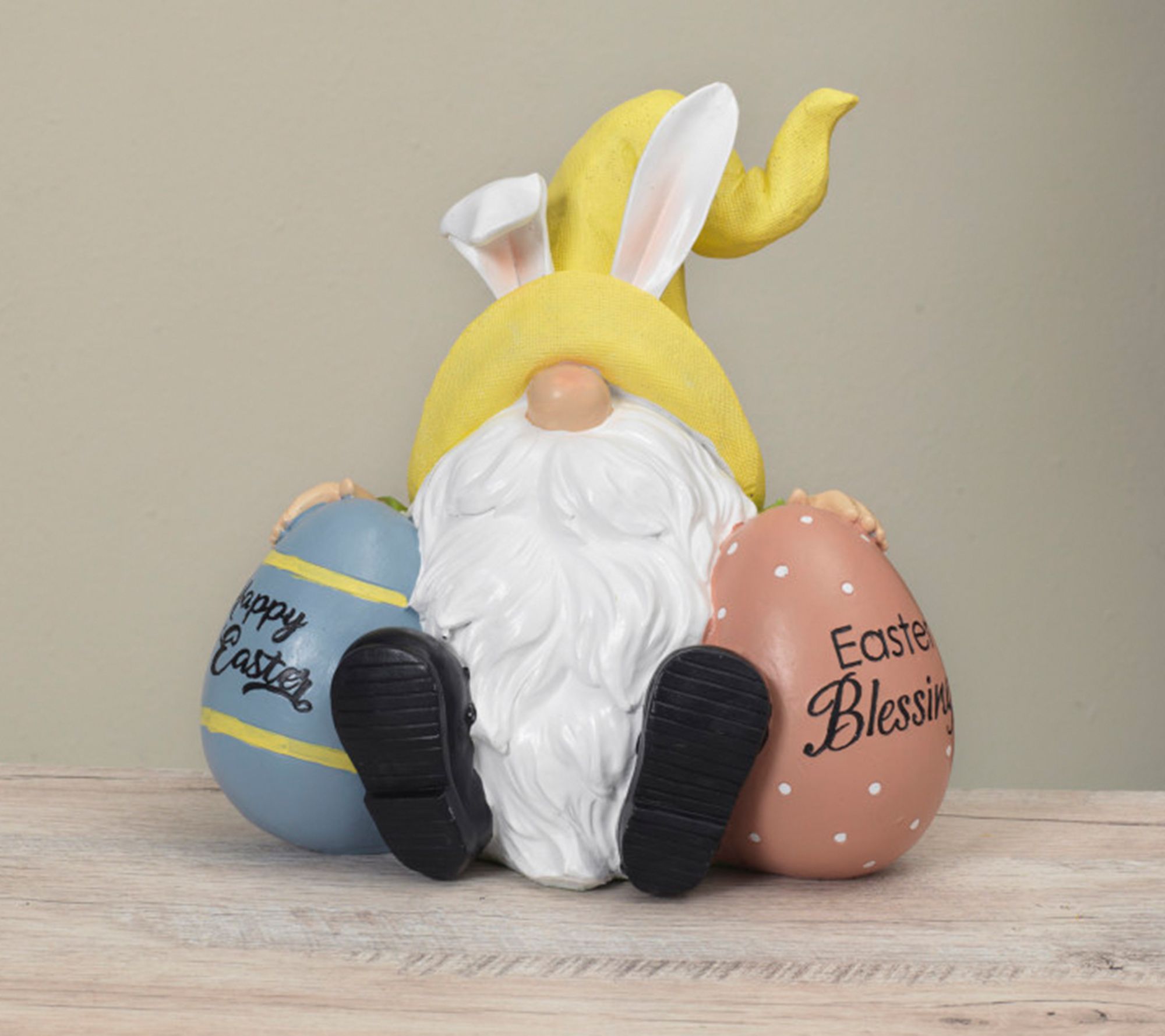 With bunny ears poking out of his gnome hat, this cute little fellow is ready to welcome springtime with a pair of colorful eggs that each offer a fun Easter message. From Gerson International.