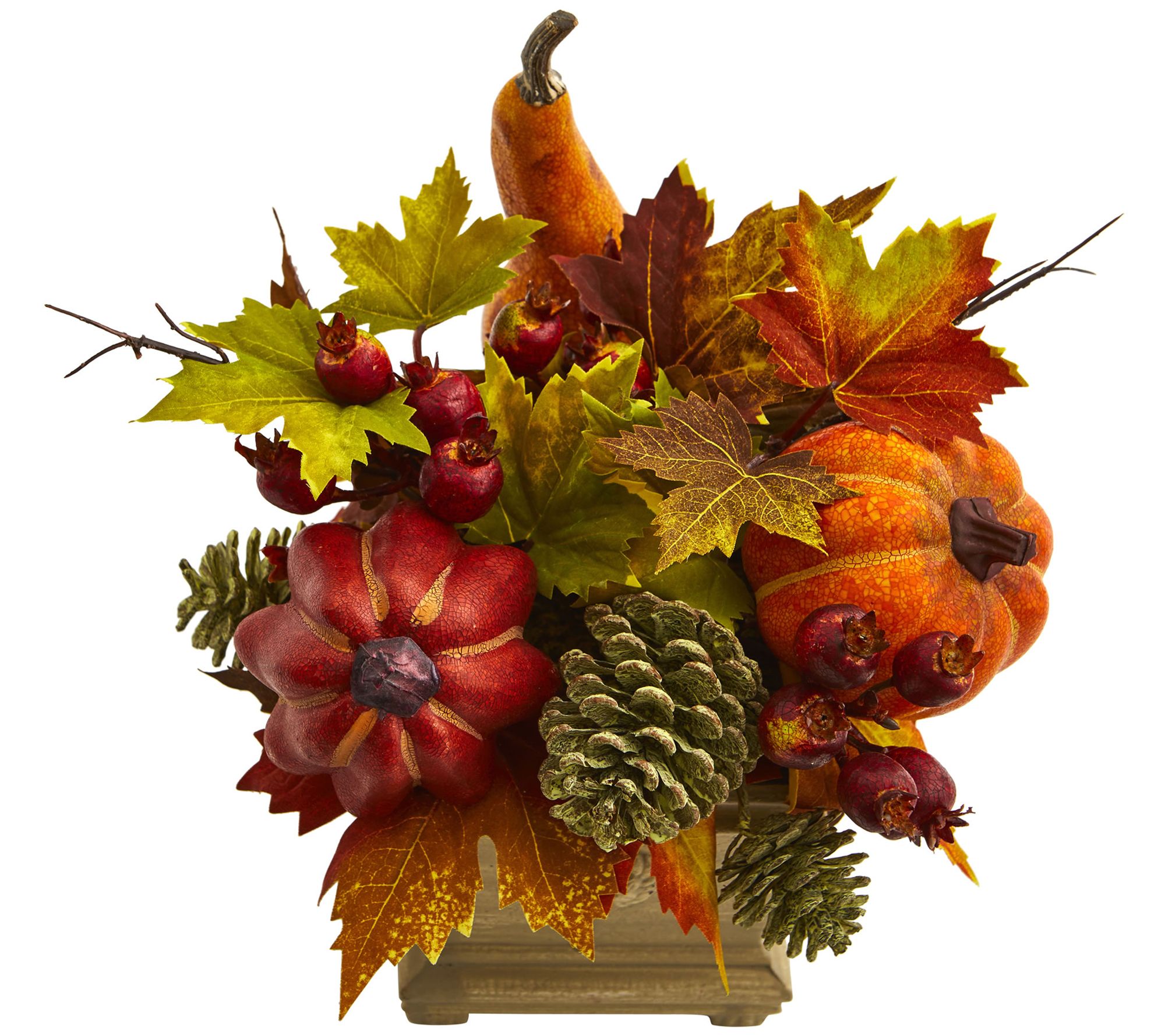 • Autumn arrangement featuring faux pumpkins, berries, pinecones, and leaves