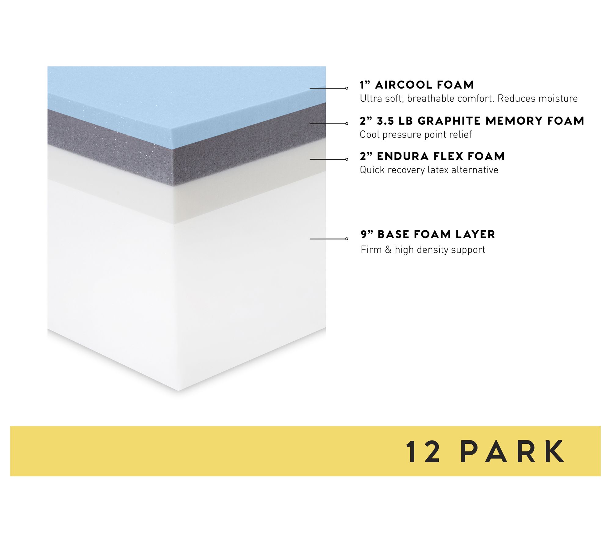 • Layers: 1" breathable AirCool foam; 2" graphite-infused memory foam; 2" Endura Flex foam; 9" supportive base foam