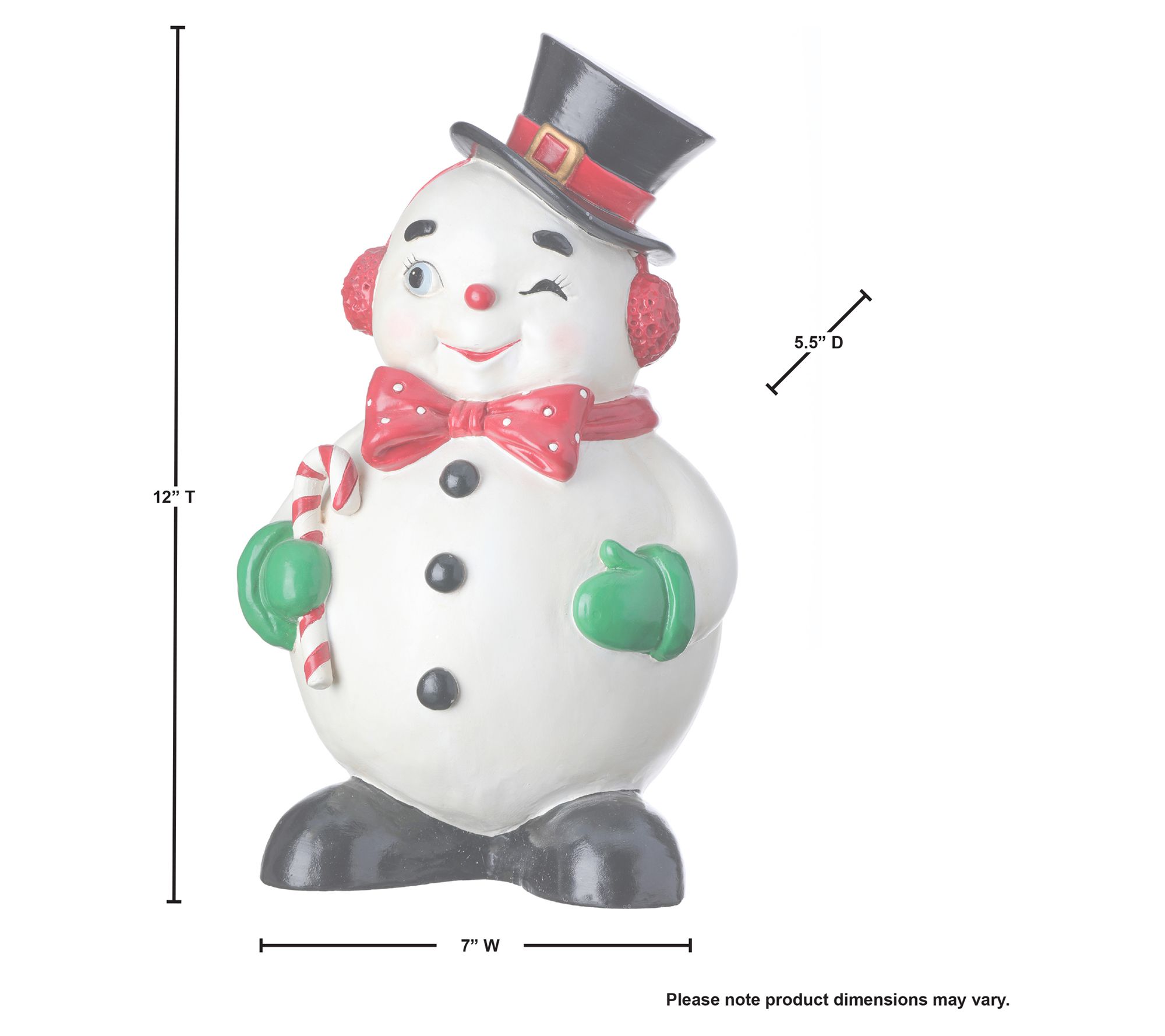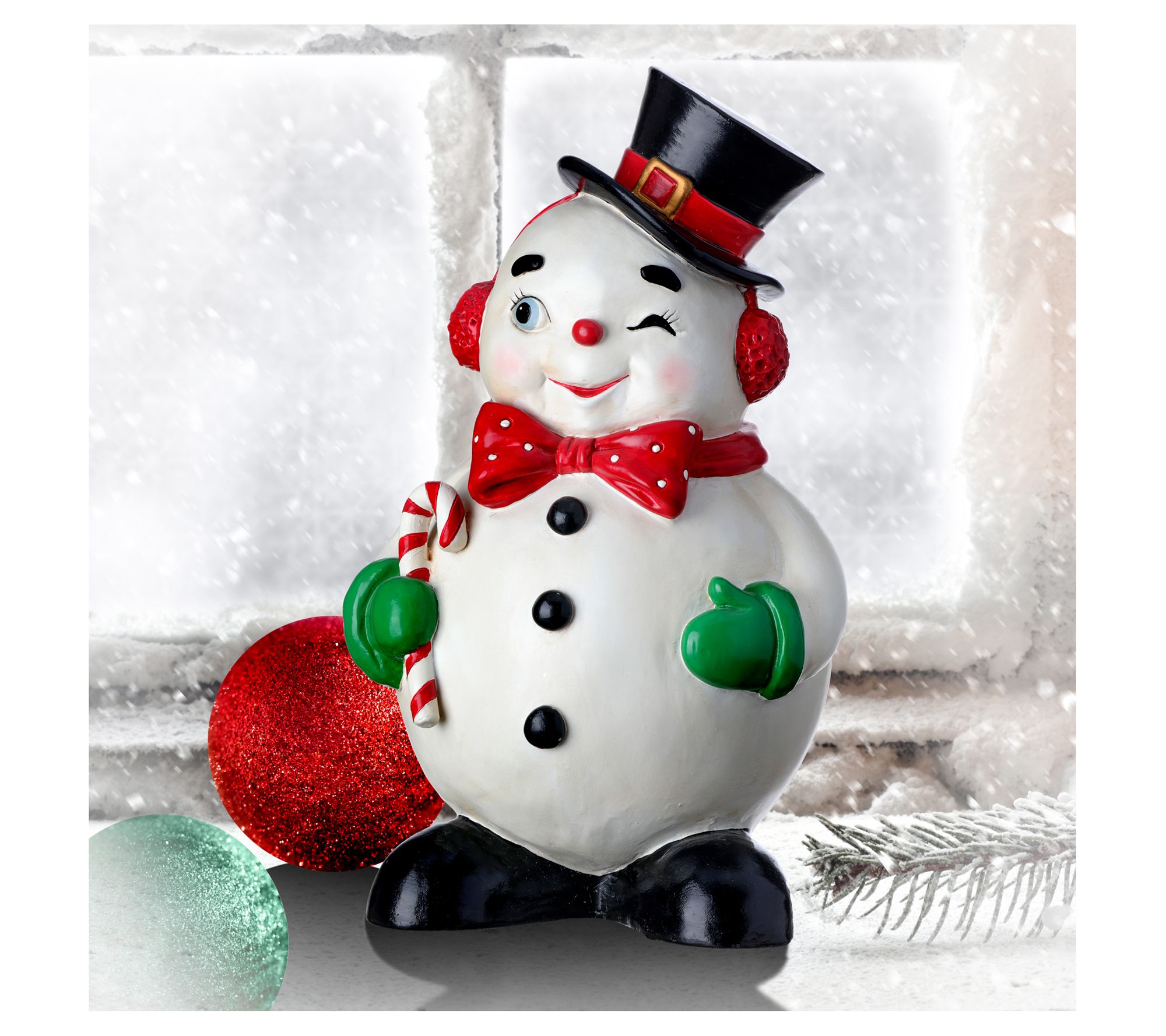 Add a touch of whimsy to your holiday decor with the 12" Standing Winking Jolly Snowman by Valerie. This charming snowman, adorned in festive colors of white, red, green, and black, brings a smile and a wink to your seasonal celebrations. Perfect for any room, it's a delightful way to spread Christmas cheer. From the Valerie Parr Hill Collection.