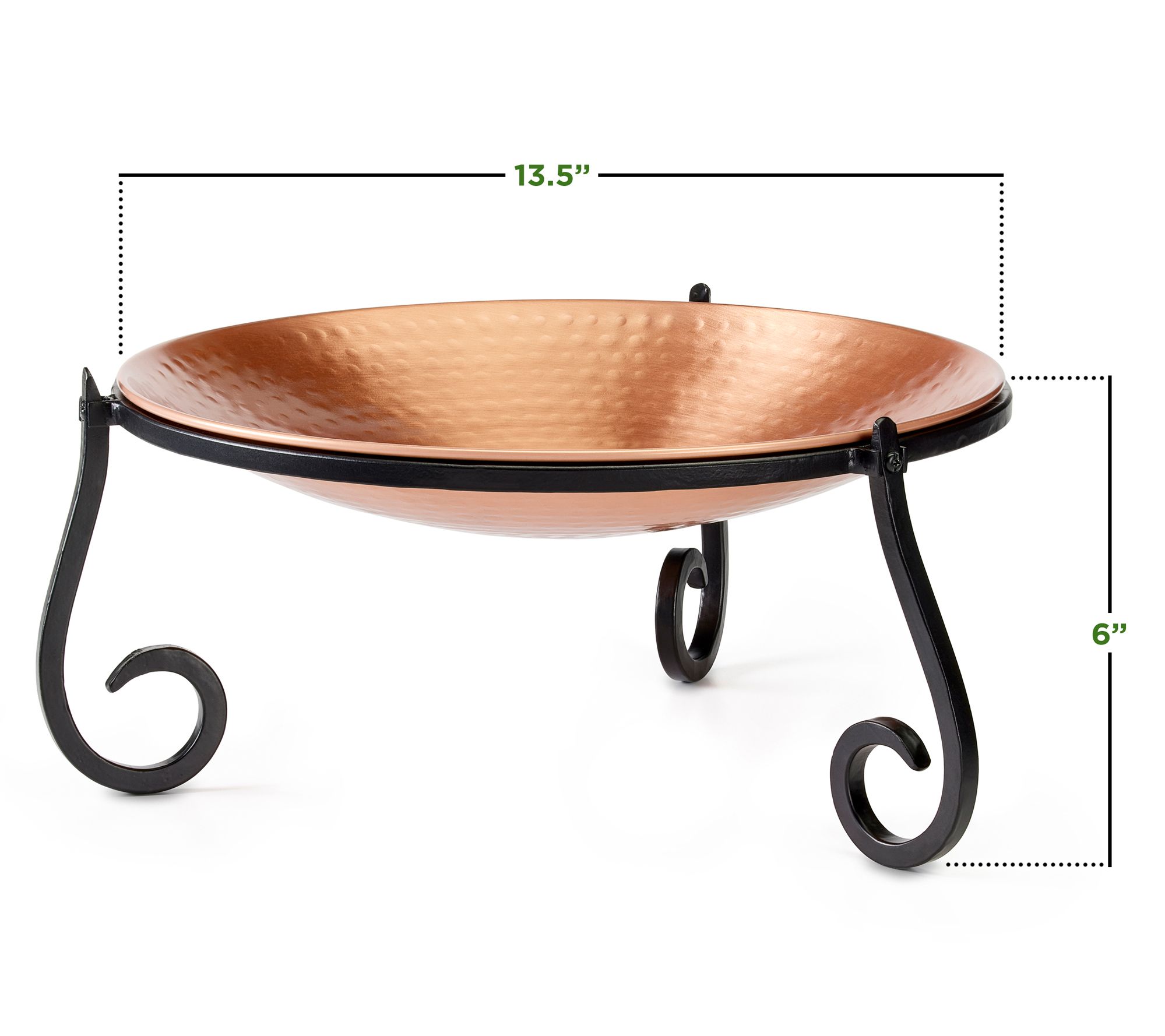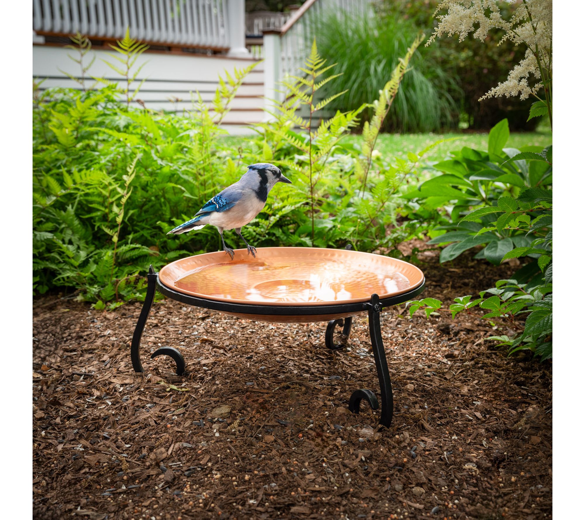 Enhance your garden with this elegant copper birdbath, perfect for attracting birds or serving as a feeder. The sturdy solid steel stand with scrolled legs adds a decorative touch and ensures stability. Made from durable, heavy-gauge copper, this versatile piece blends function with beauty, making it a delightful addition to any patio or backyard. From Good Directions.