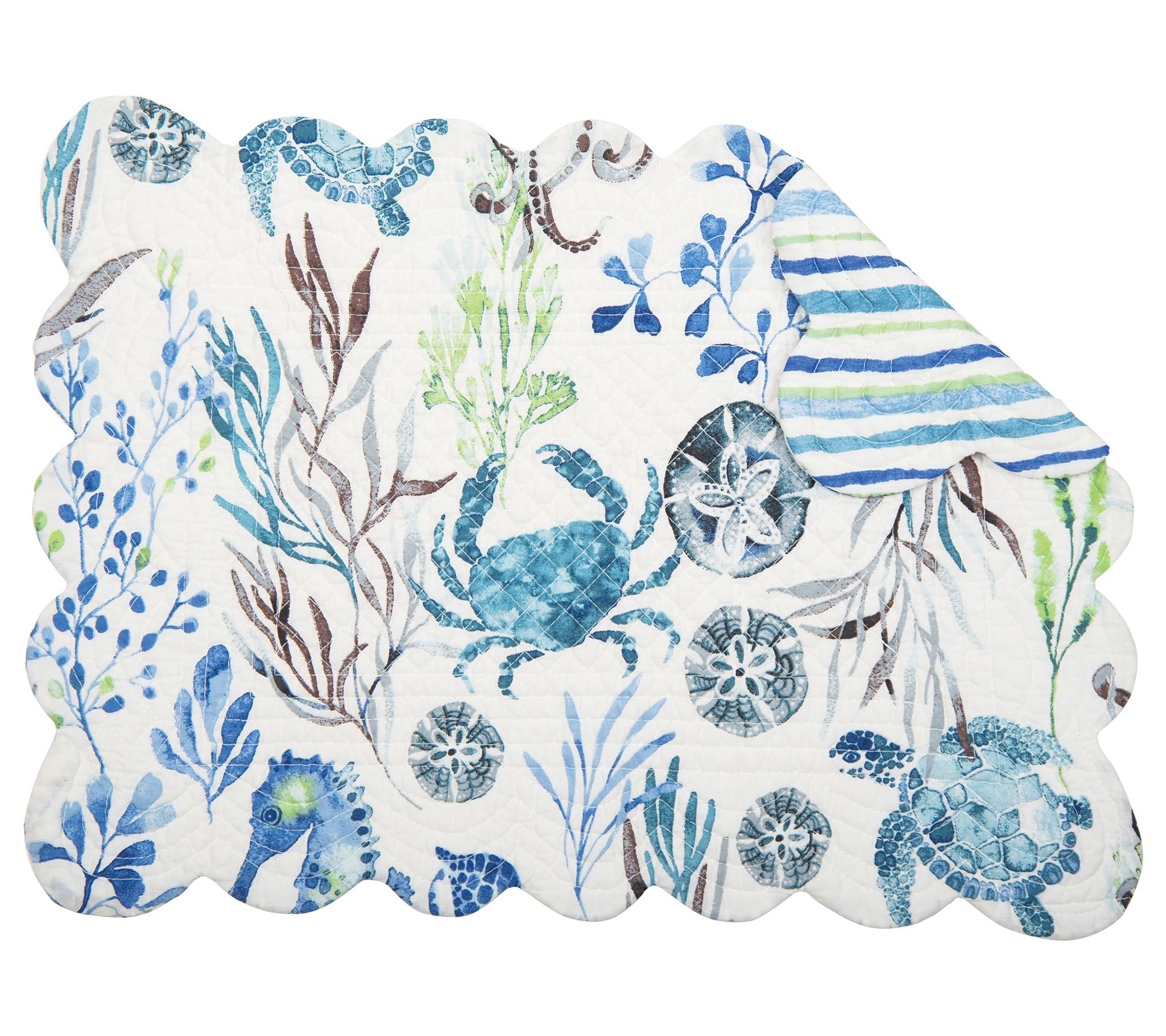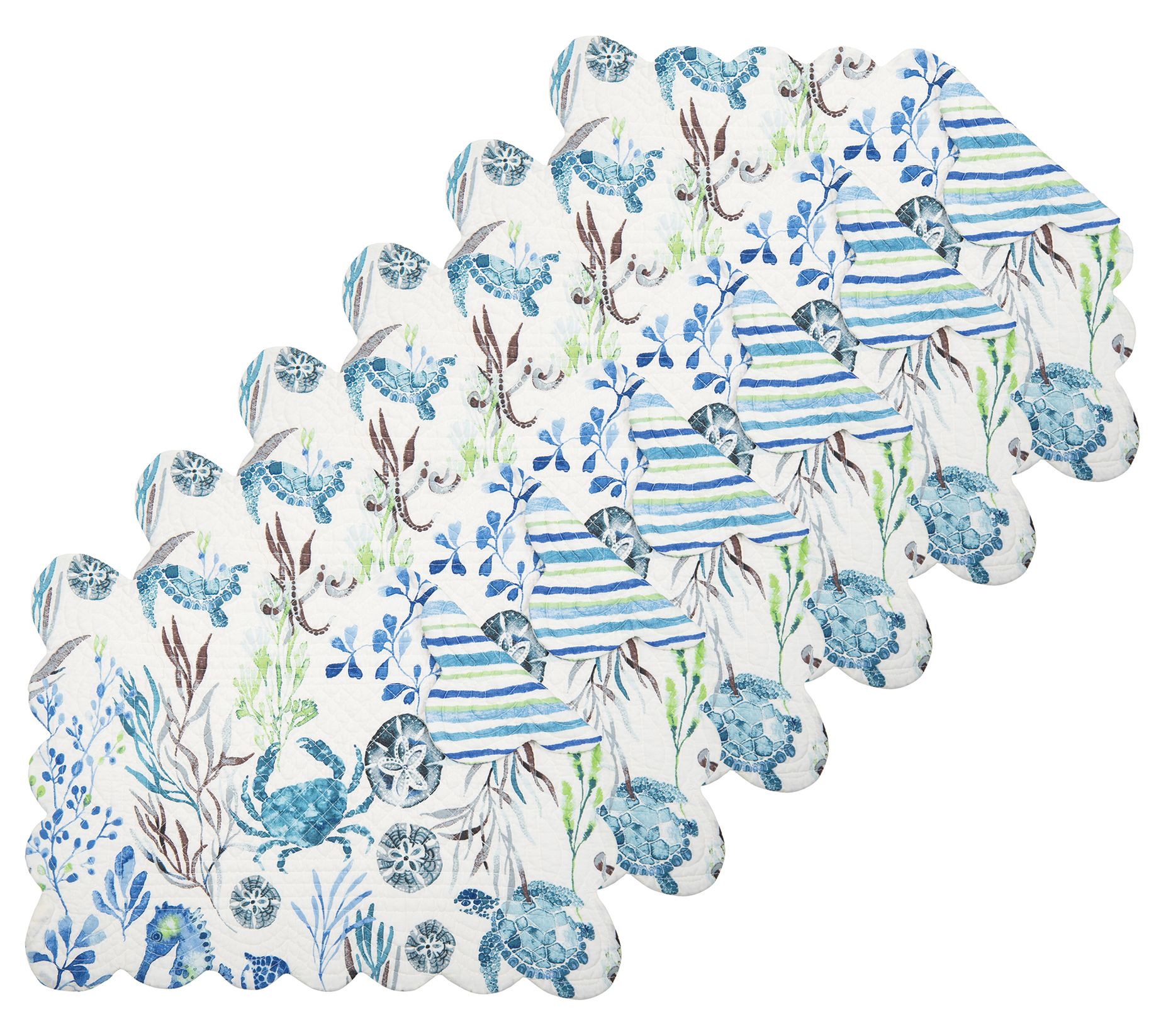 Seaside charm that makes every meal feel like a day at the beach, this set of six Crescent Bay placemats showcases colorful sea creatures and kelp on the front, and a lively striped pattern on the reverse. From the Valerie Parr Hill Collection.