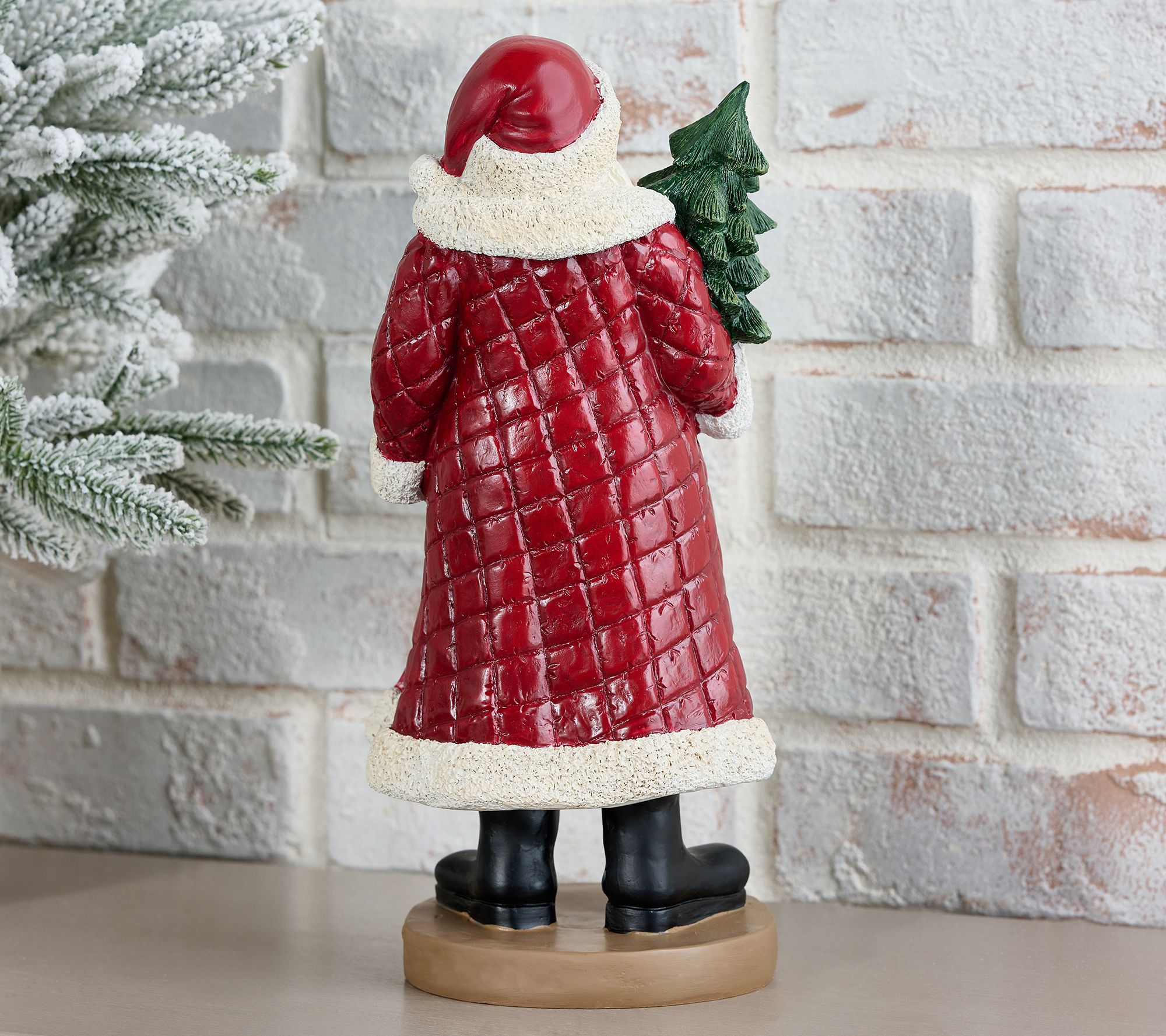 • Santa wears checked vest, quilted coat with faux fur trim, and holds a tree