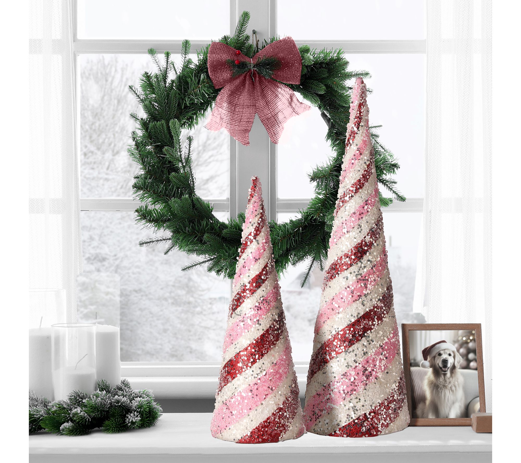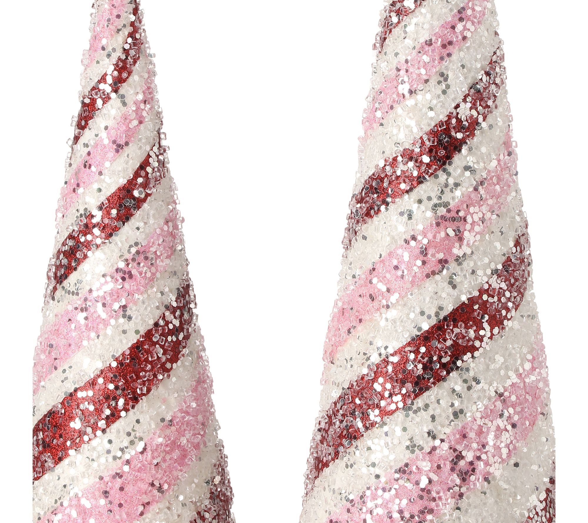 Add a touch of sparkle to your holiday decor with this set of two glitter iced striped cone trees by Valerie. Featuring a dazzling combination of glitter stripes, sequins, and beads in festive hues of pink, white, and red, these enchanting trees are perfect for tabletop settings, mantels, or shelves. From the Valerie Parr Hill Collection.