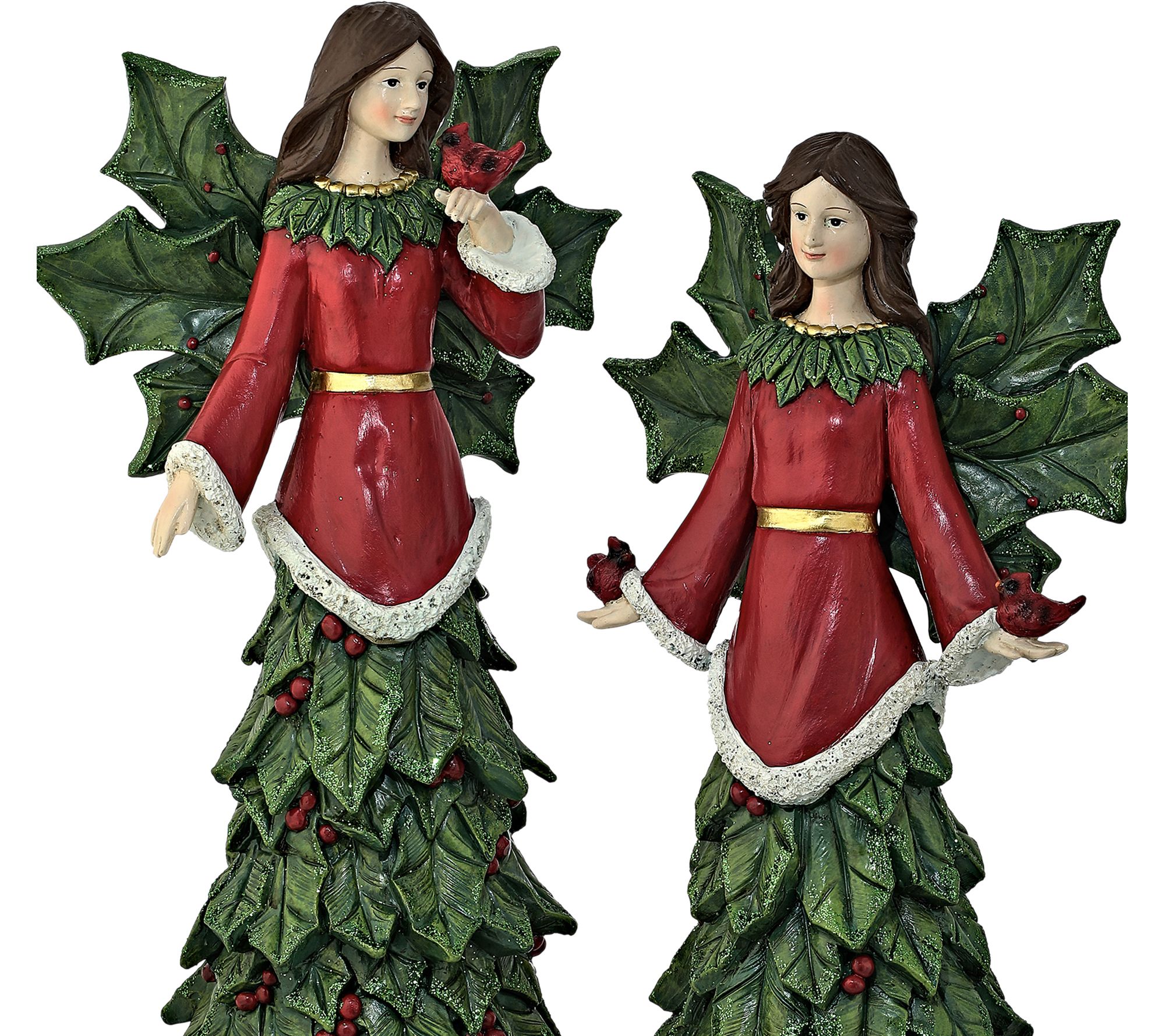 Add a touch of heavenly charm to your home with the 14" Holly Angel Set of 2 by Valerie. These enchanting figurines, each holding little cardinals, embody the spirit of the season with their serene expressions and elegant design. Perfect for your holiday display, these angels feature intricately detailed holly leaf skirts adorned with red berries, holly wings, and vibrant colors that capture the beauty of the holiday season. From Valerie.