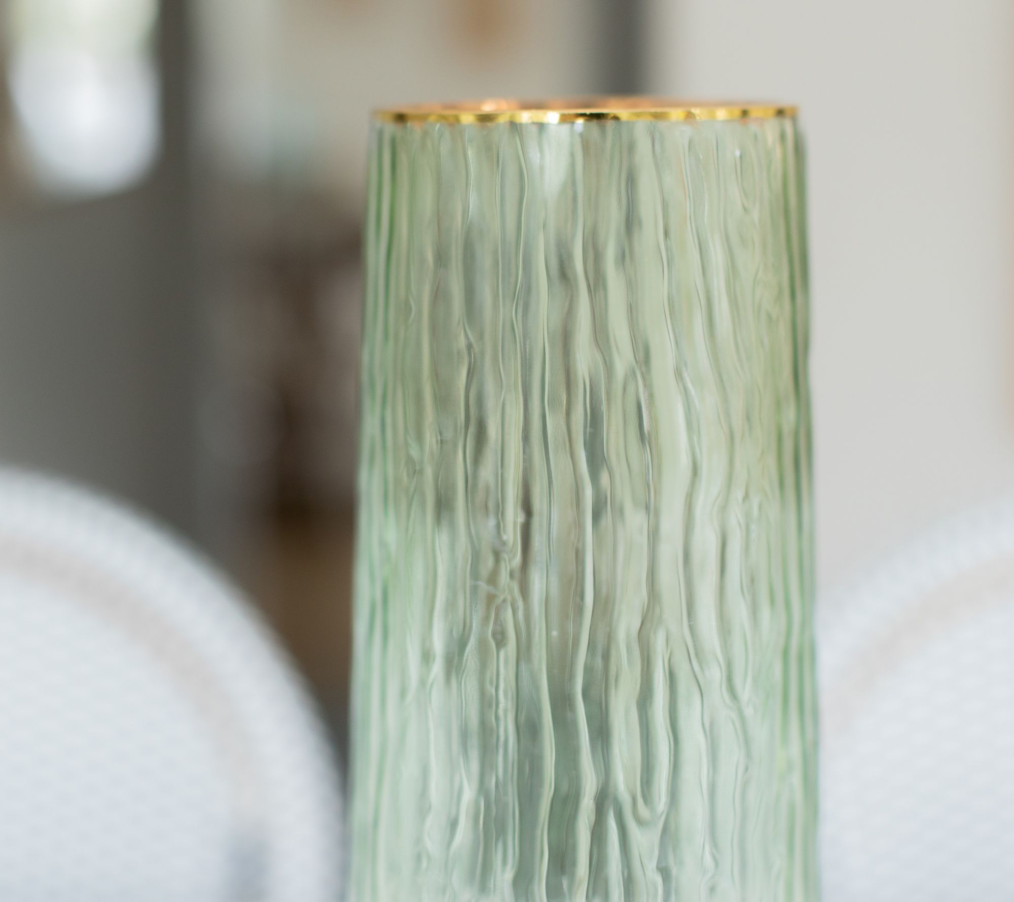Elevate your everyday decor with this textured glass vase accented with a gold painted rim. From Lauren McBride.