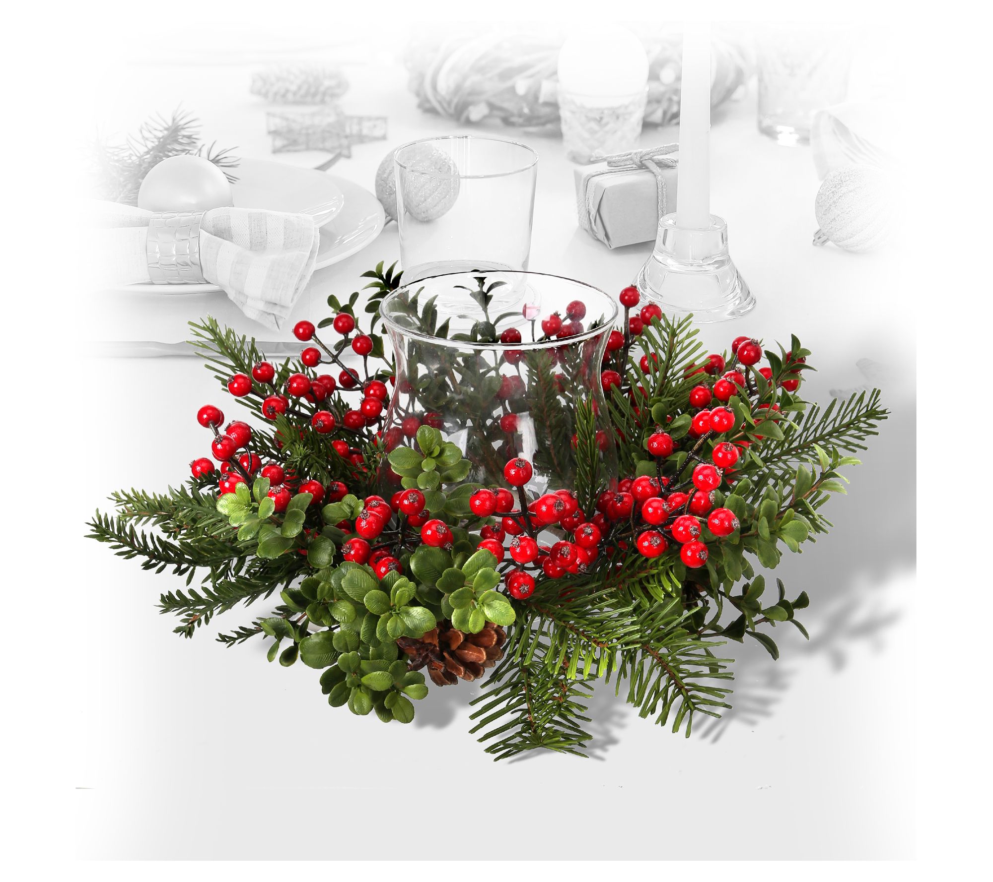 Transform your holiday decor with this lovely candleholder, a stunning addition that showcases plump faux berries and boxwood fir branches. Perfect for creating a festive centerpiece with your favorite candle, it promises to enchant your guests and add a touch of cheer to your seasonal space. From the Valerie Parr Hill Collection.