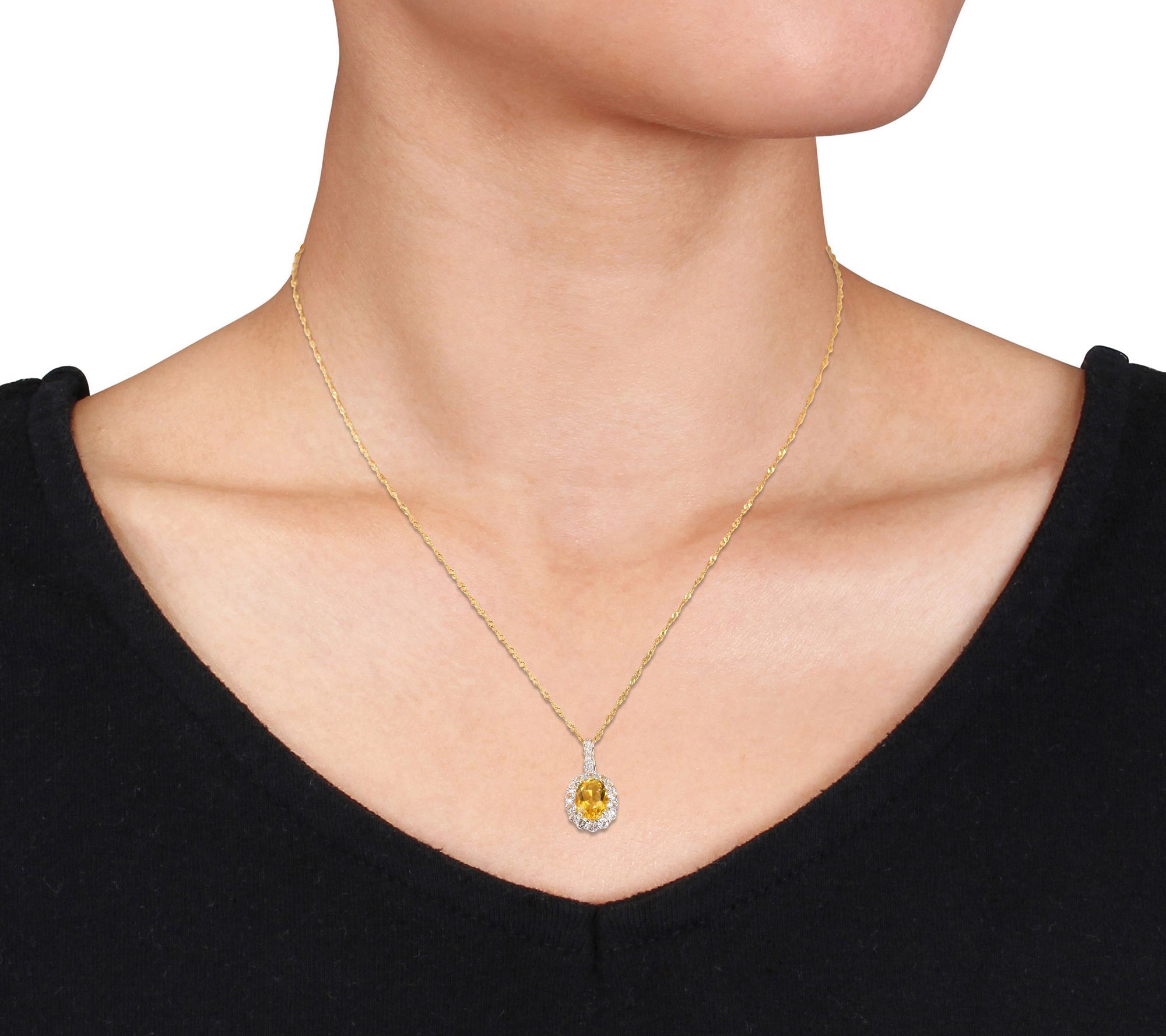 • Oval, prong-set citrine gemstones; halo of round white topaz gemstones prong set in 14K white gold; bail and lever backs lined with round diamonds set in 14K white gold; polished finish