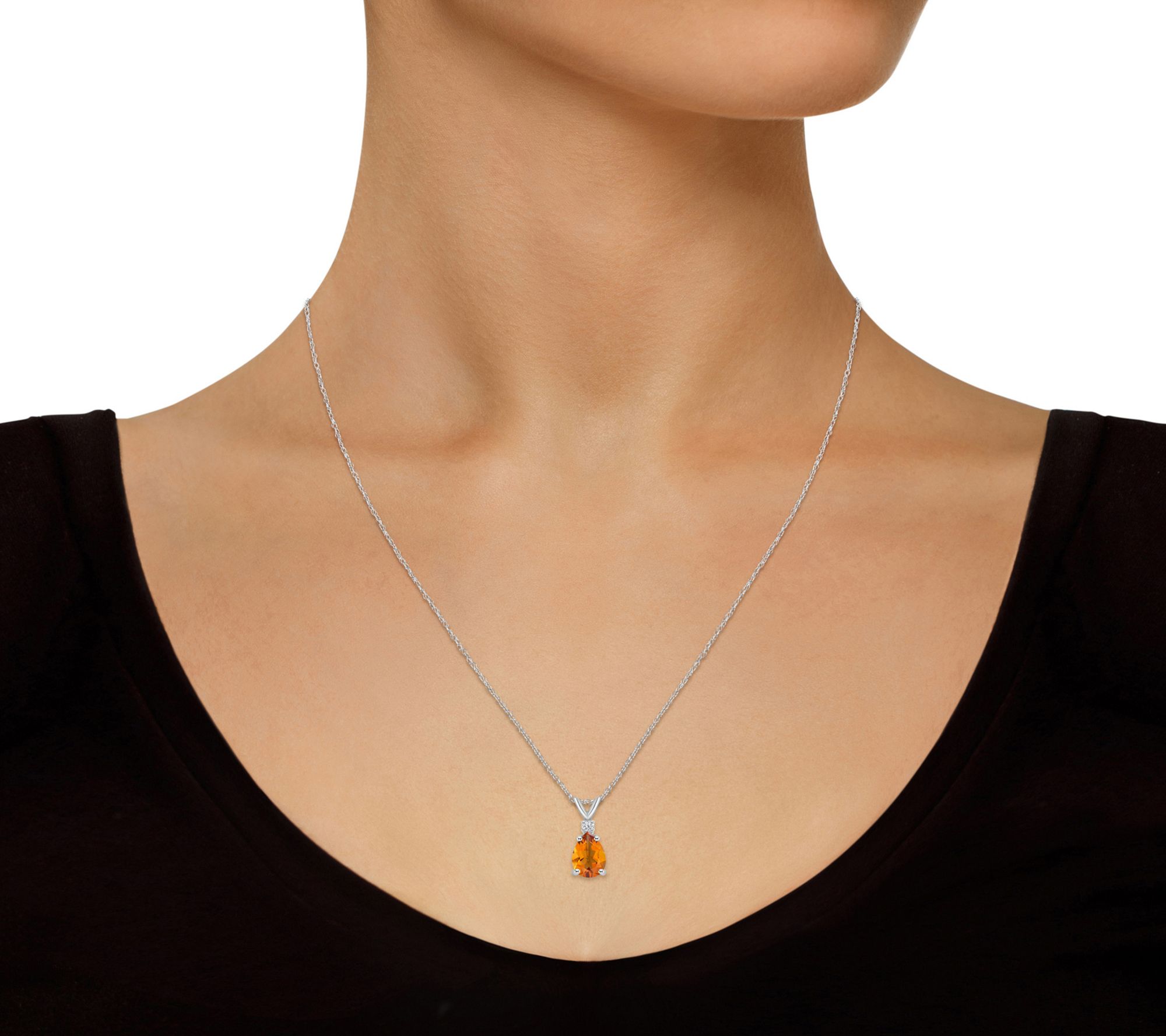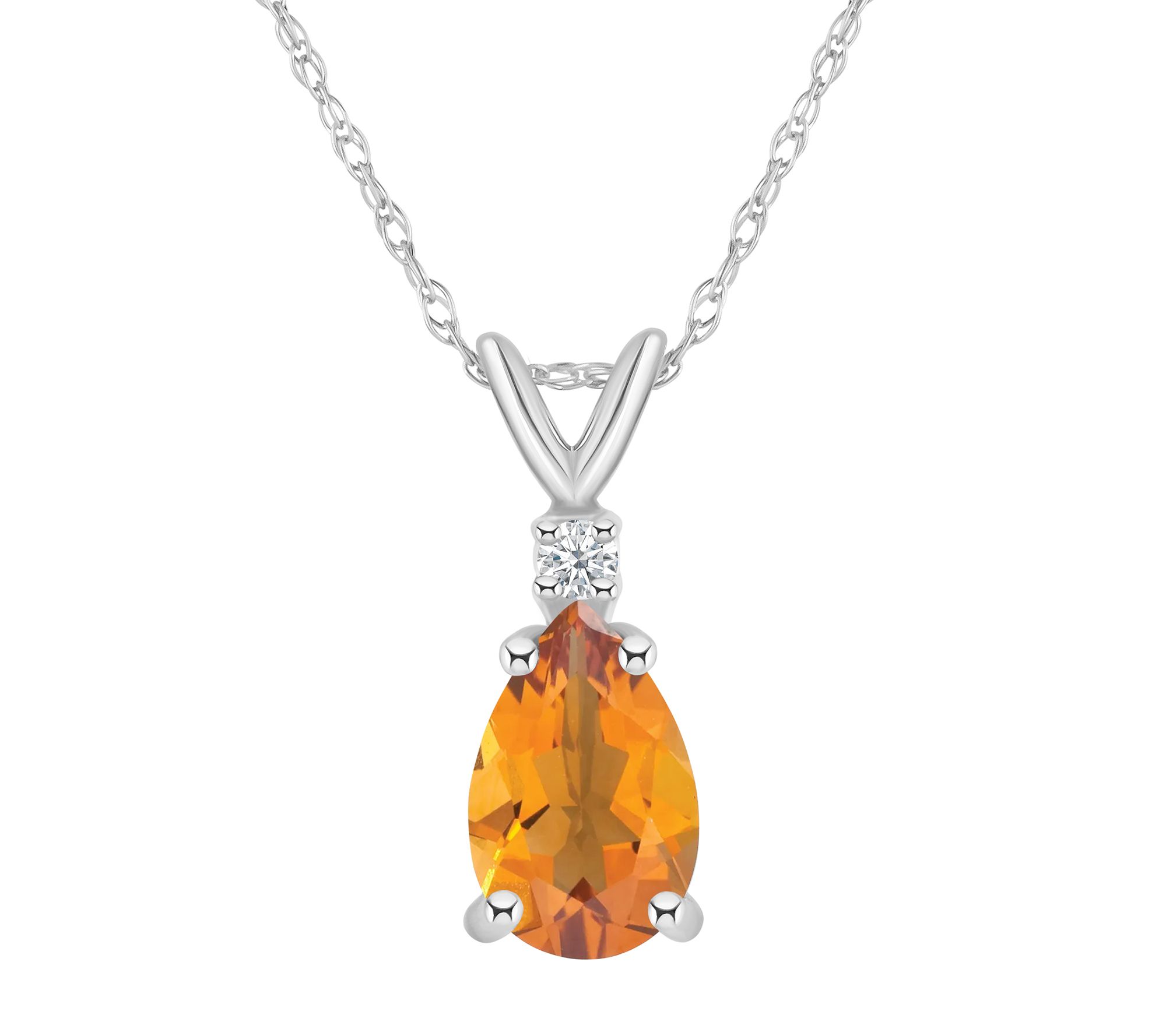 • Prong-set, pear-shape citrine pendant in basket setting; diamond accents on top