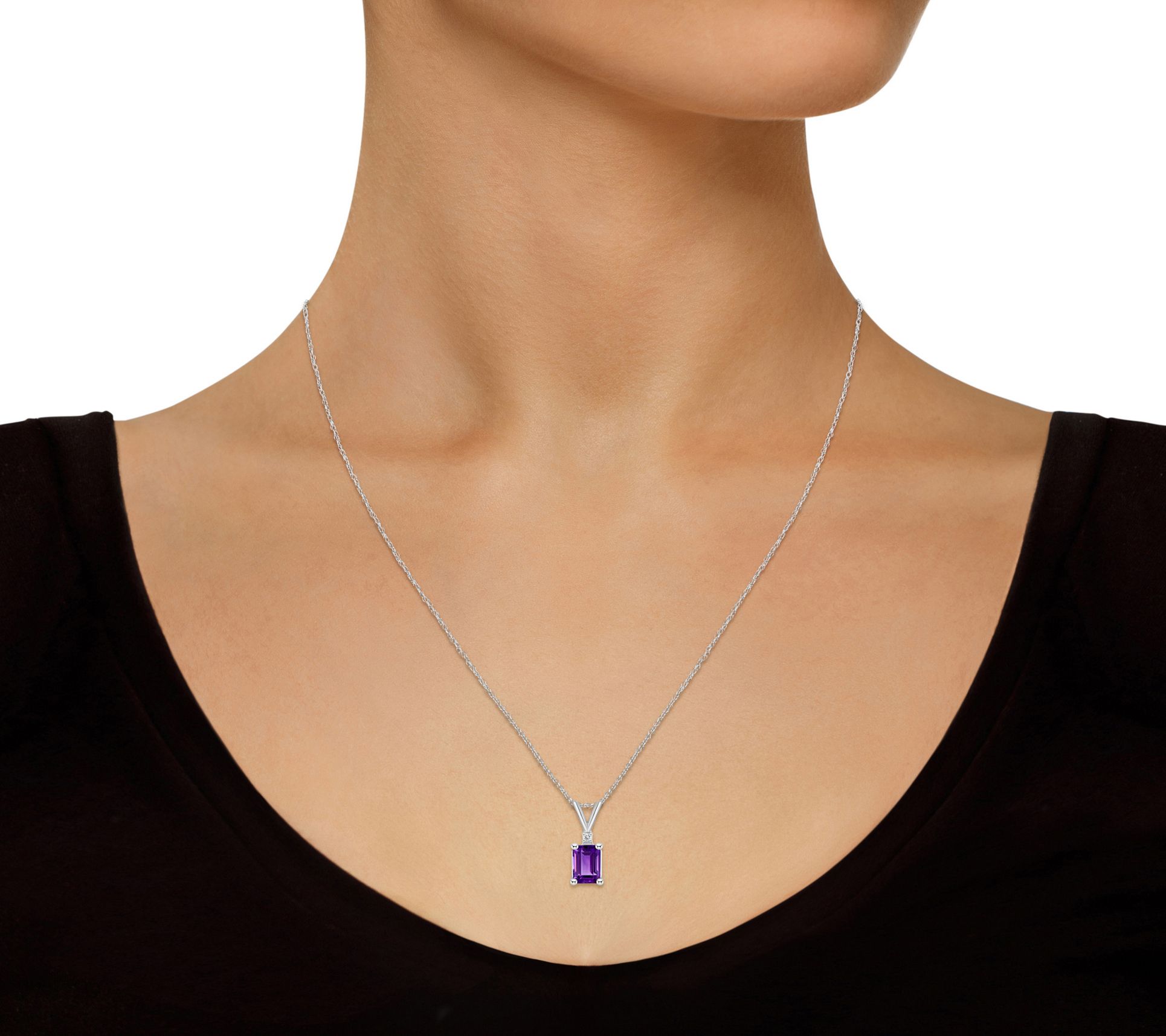 • Prong-set, emerald-cut amethyst accented by prong-set diamond on top