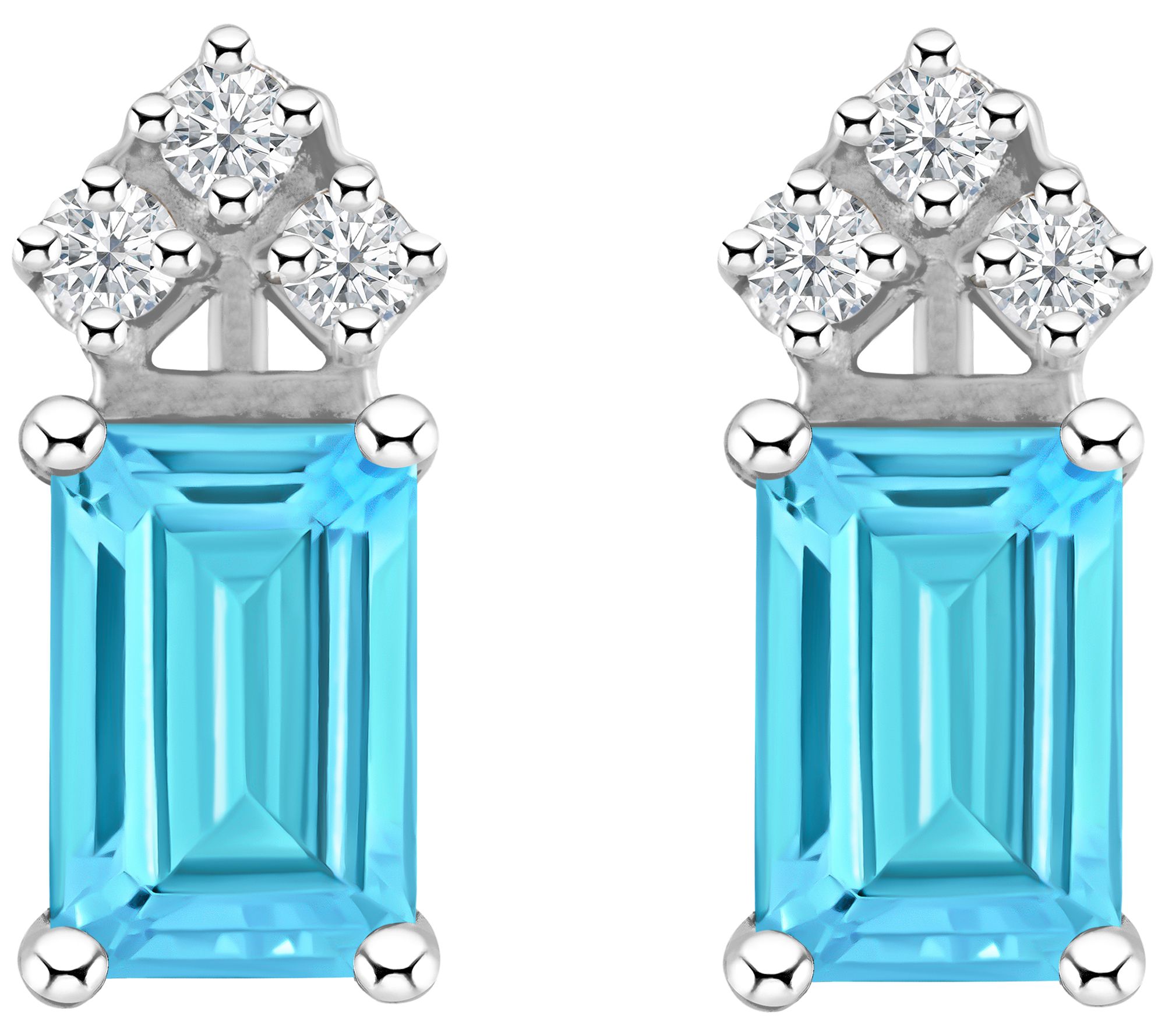 • Prong-set, emerald-cut, blue topaz in a basket setting accented by three round, prong-set diamonds on top