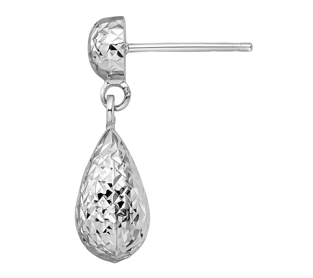 • Button post with 3D teardrop-shaped dangle; polished with diamond-cut finish