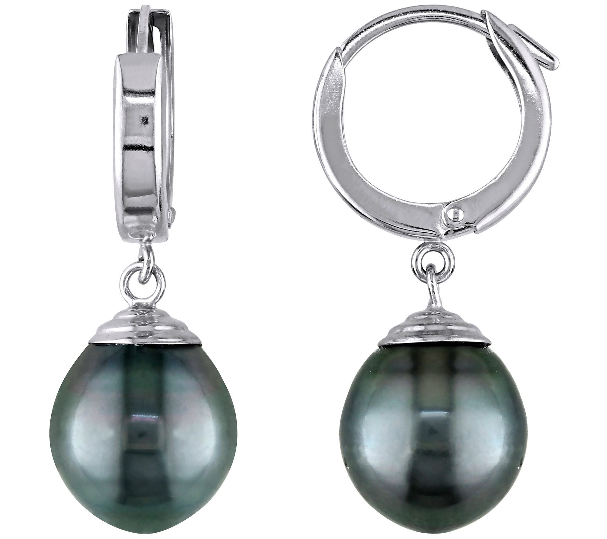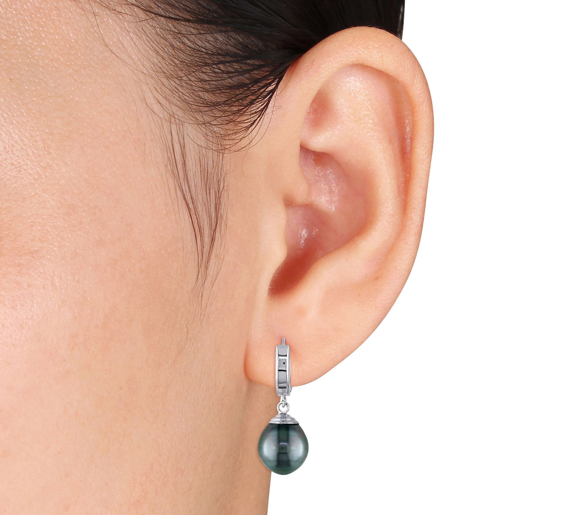 • Hinged hoop drop earrings; black Tahitian cultured freshwater pearls; polished finish