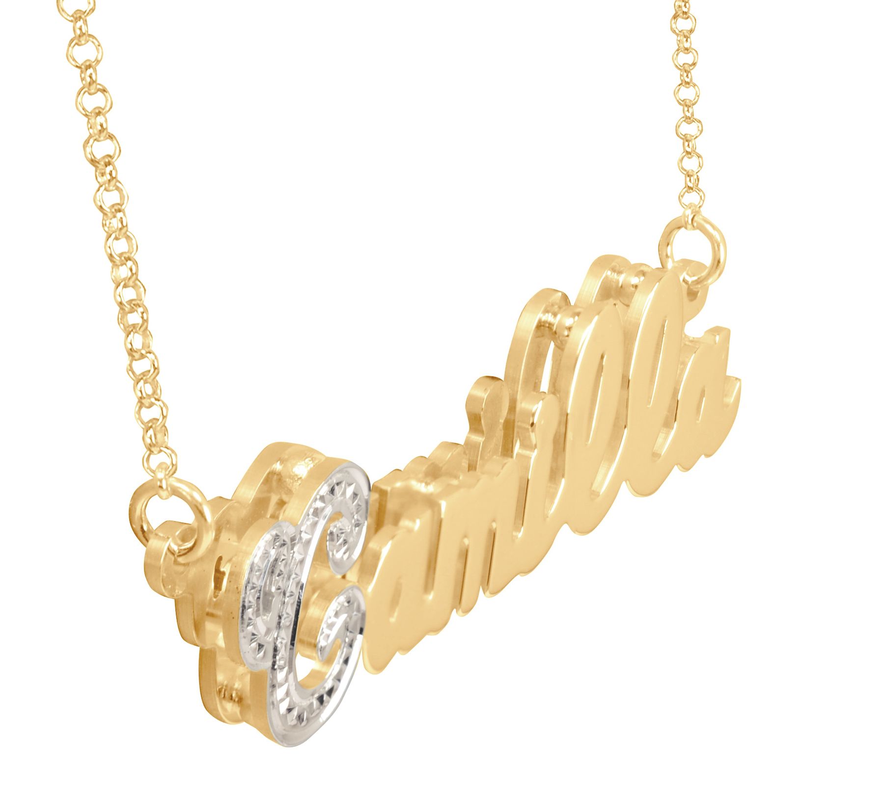 • Rolo link chain; 3D name with diamond-cut, rhodium-plated sterling silver first initial; personalize with up to 10 letters