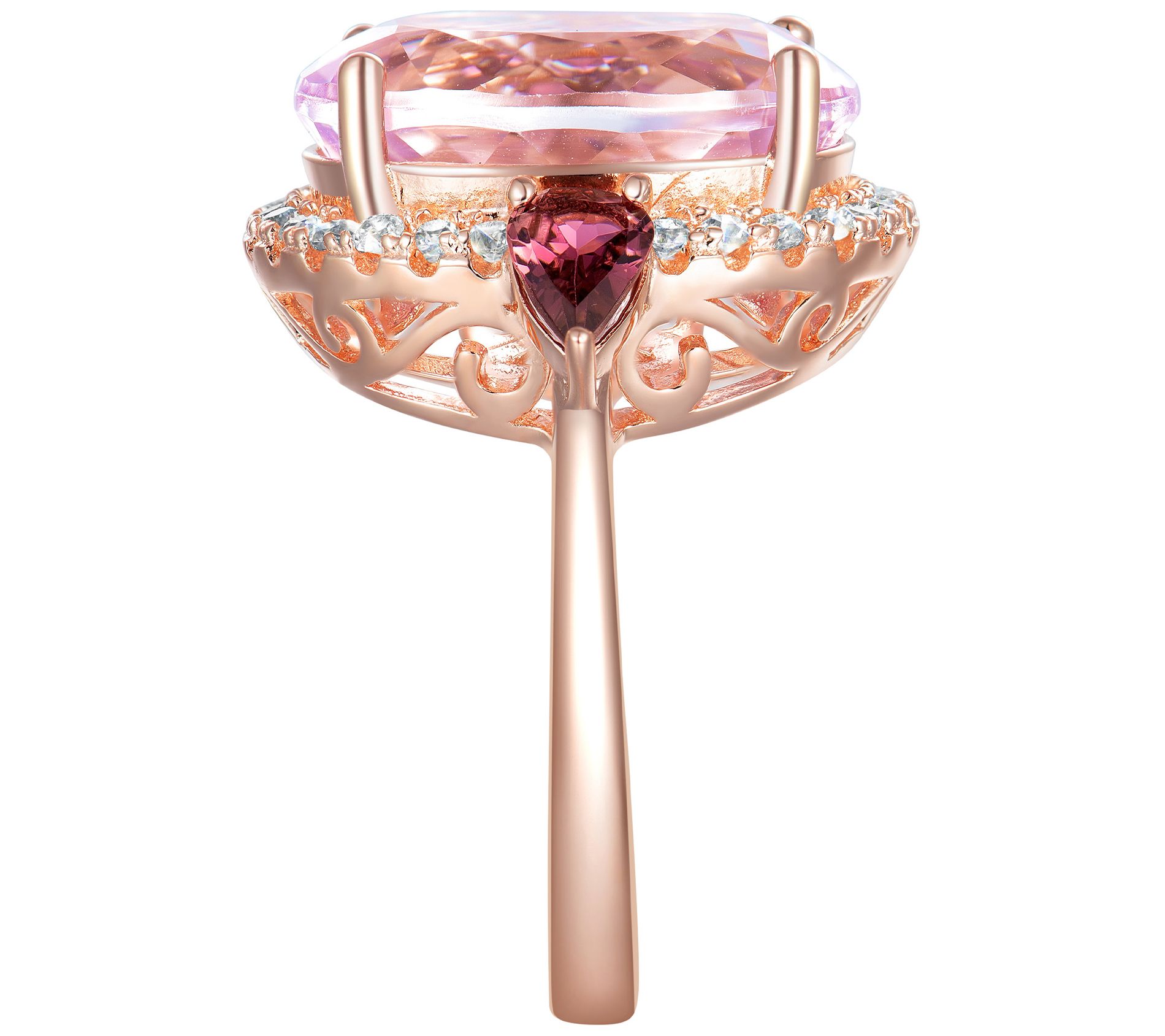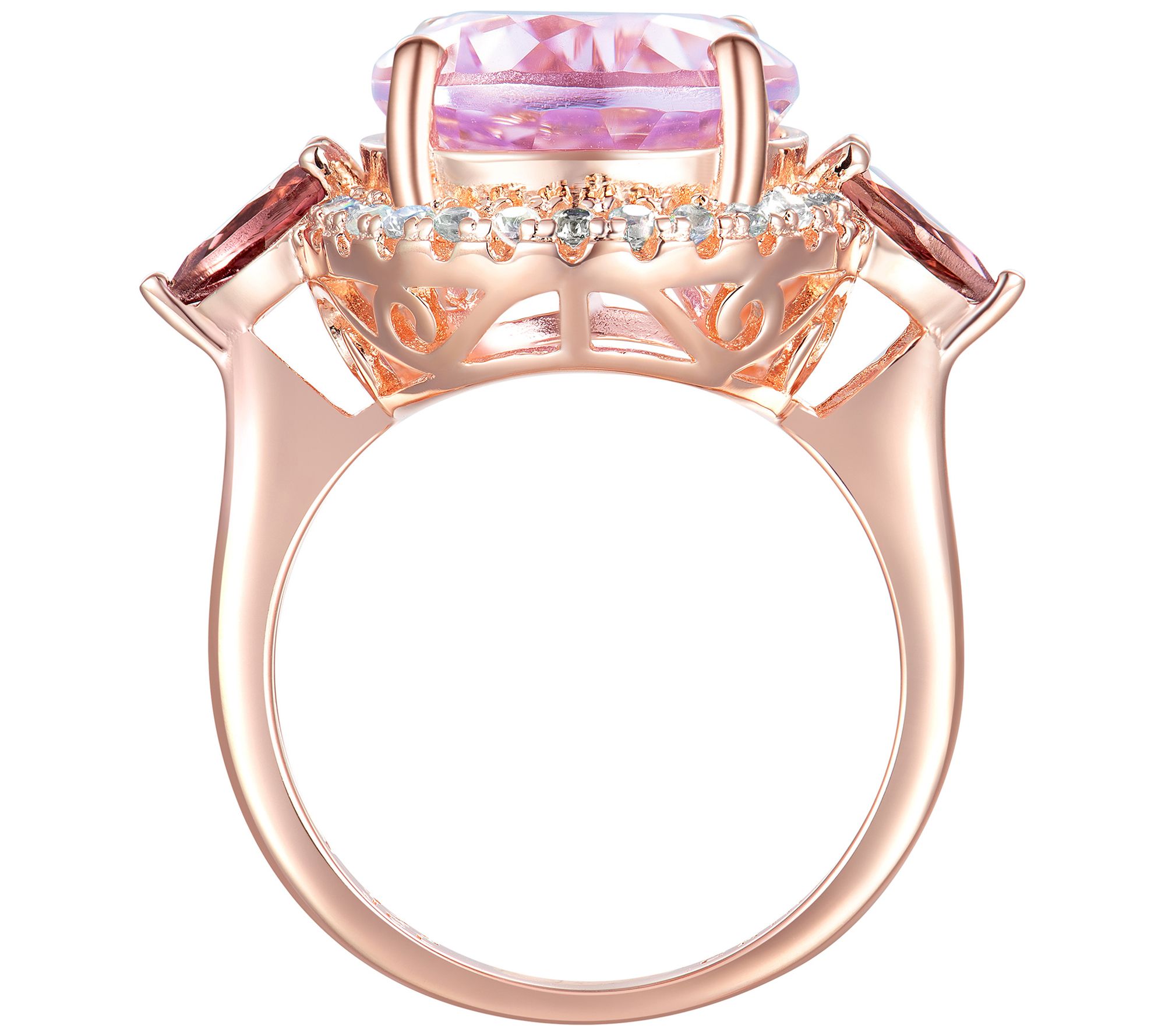 Bright and beautiful -- just like you! This 14K rose gold-plated sterling silver ring stands out with an oval kunzite at the center, a pear-shaped pink tourmaline on either side, and white zircon gemstones completing its spectacular sparkle. From Affinity® Gems.
