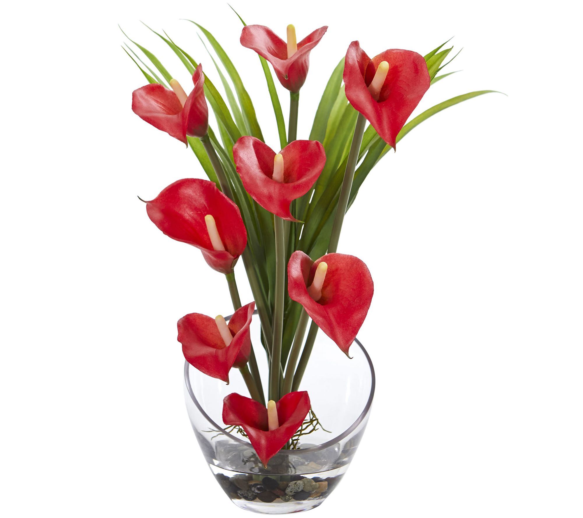 • Lifelike calla lilies and grass in a slanted clear vase with faux water and river rocks