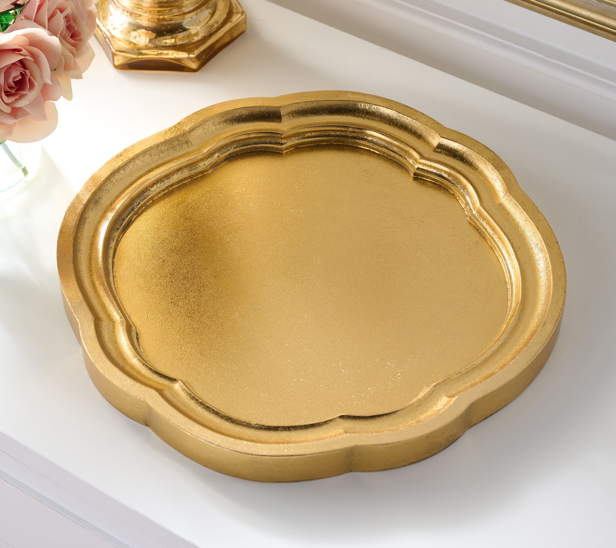 Style your entryway or dining table with this wood tray (with a stunning goldtone foil finish). Use the lovely scalloped accent to highlight a favorite vase, candle, or seasonal accent. From the Valerie Parr Hill Collection.
