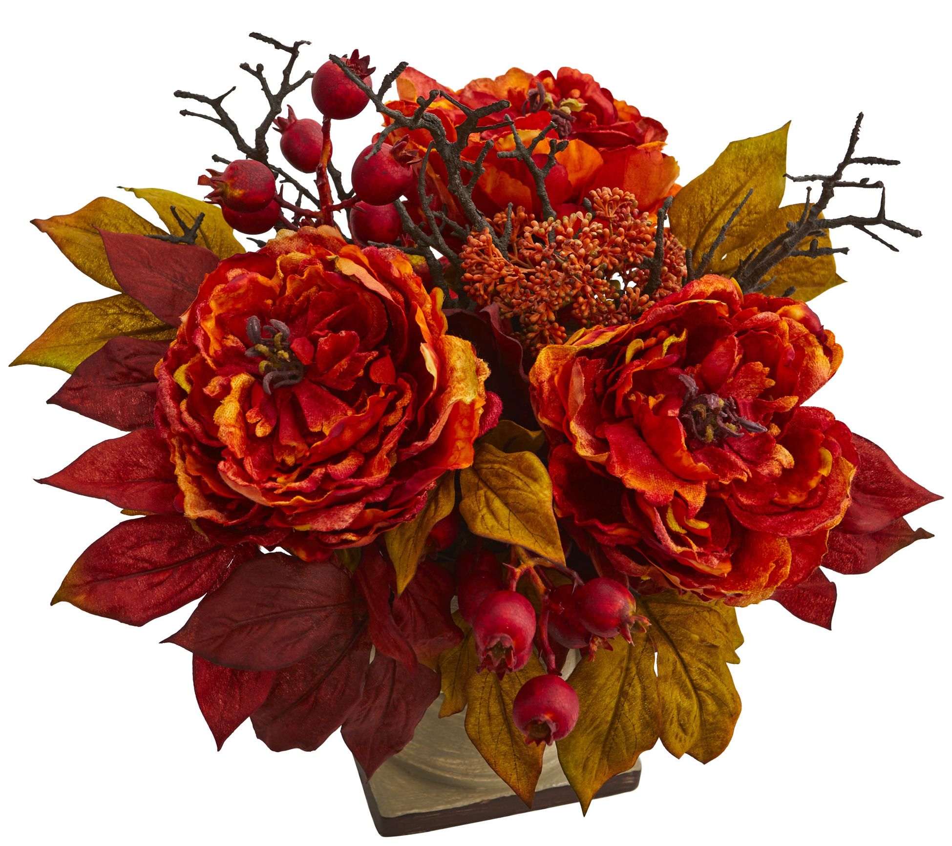 • Lifelike red and green leaves with orange peony's