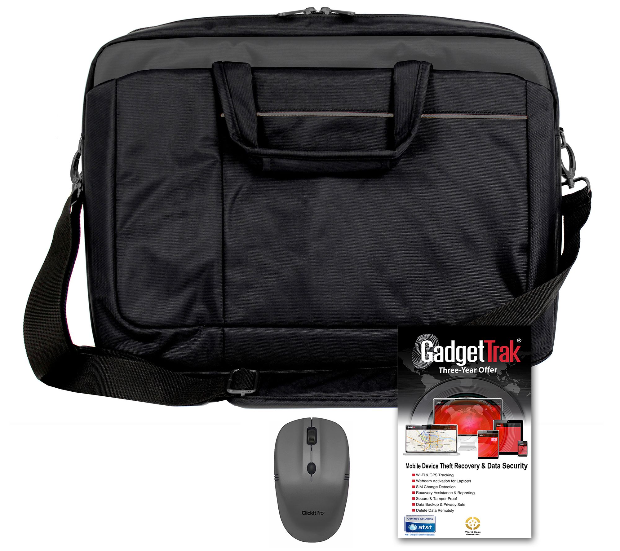• Includes 15" signature carry bag, wireless mouse with 2 AAA batteries, and 3-year Gadget Trak software subscription