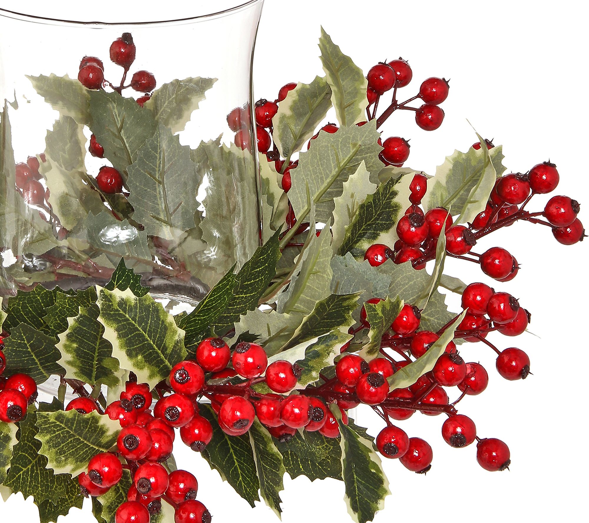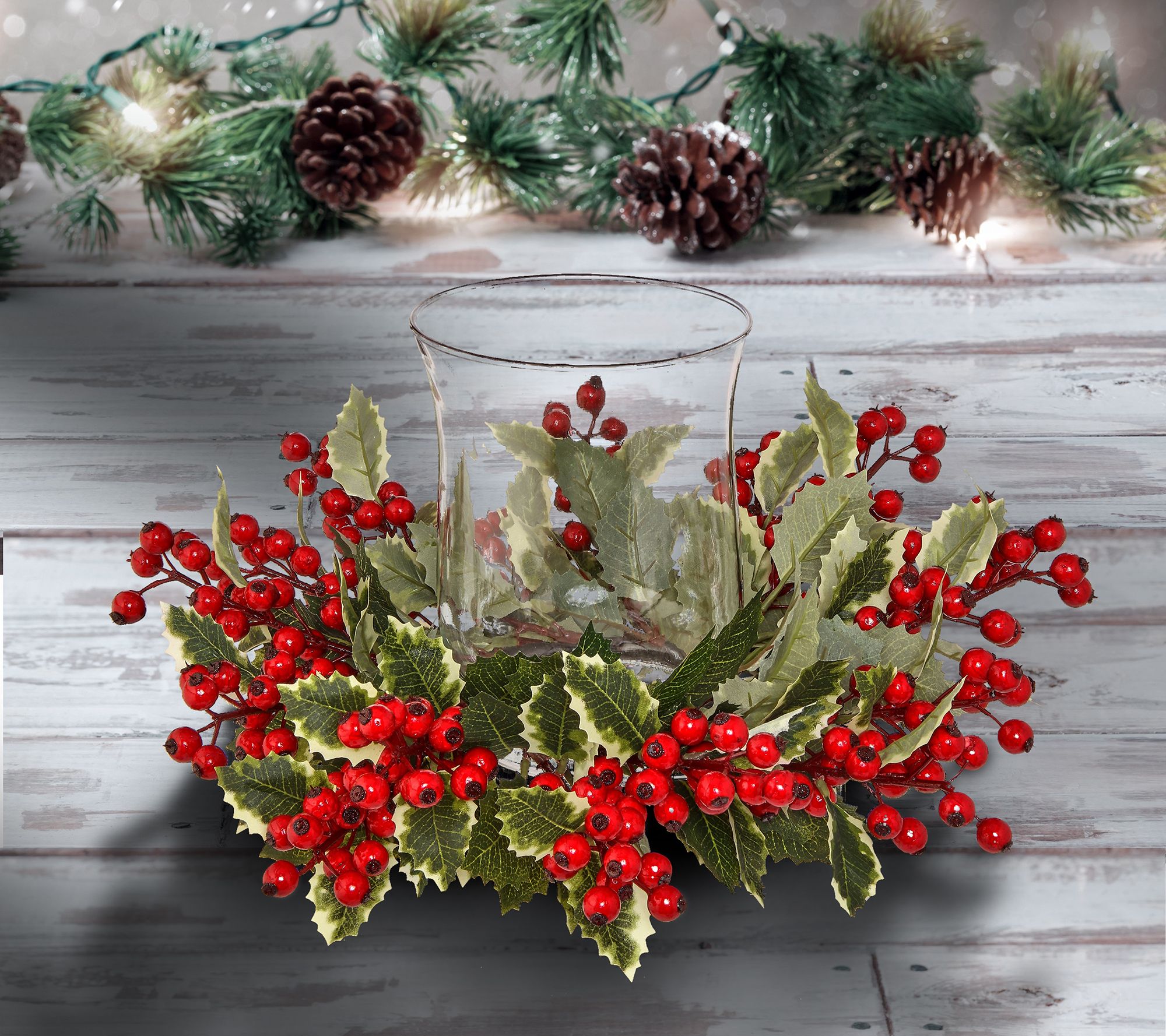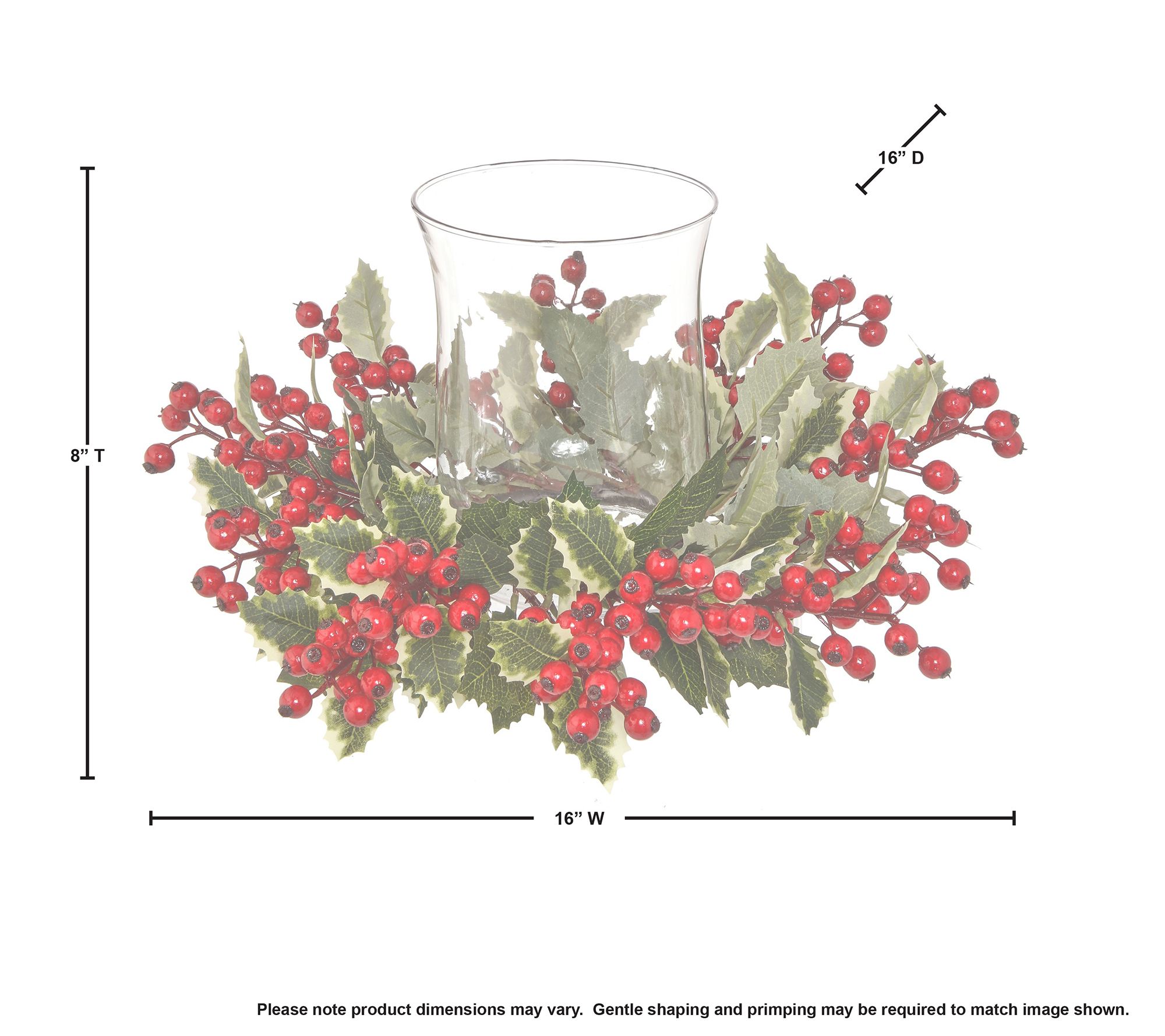 Turn any candle into an extraordinary display with this eye-catching candle ring featuring sprigs of faux spruce, cedar, and holly against a glass hurricane style candle holder. From the Valerie Parr Hill Collection.