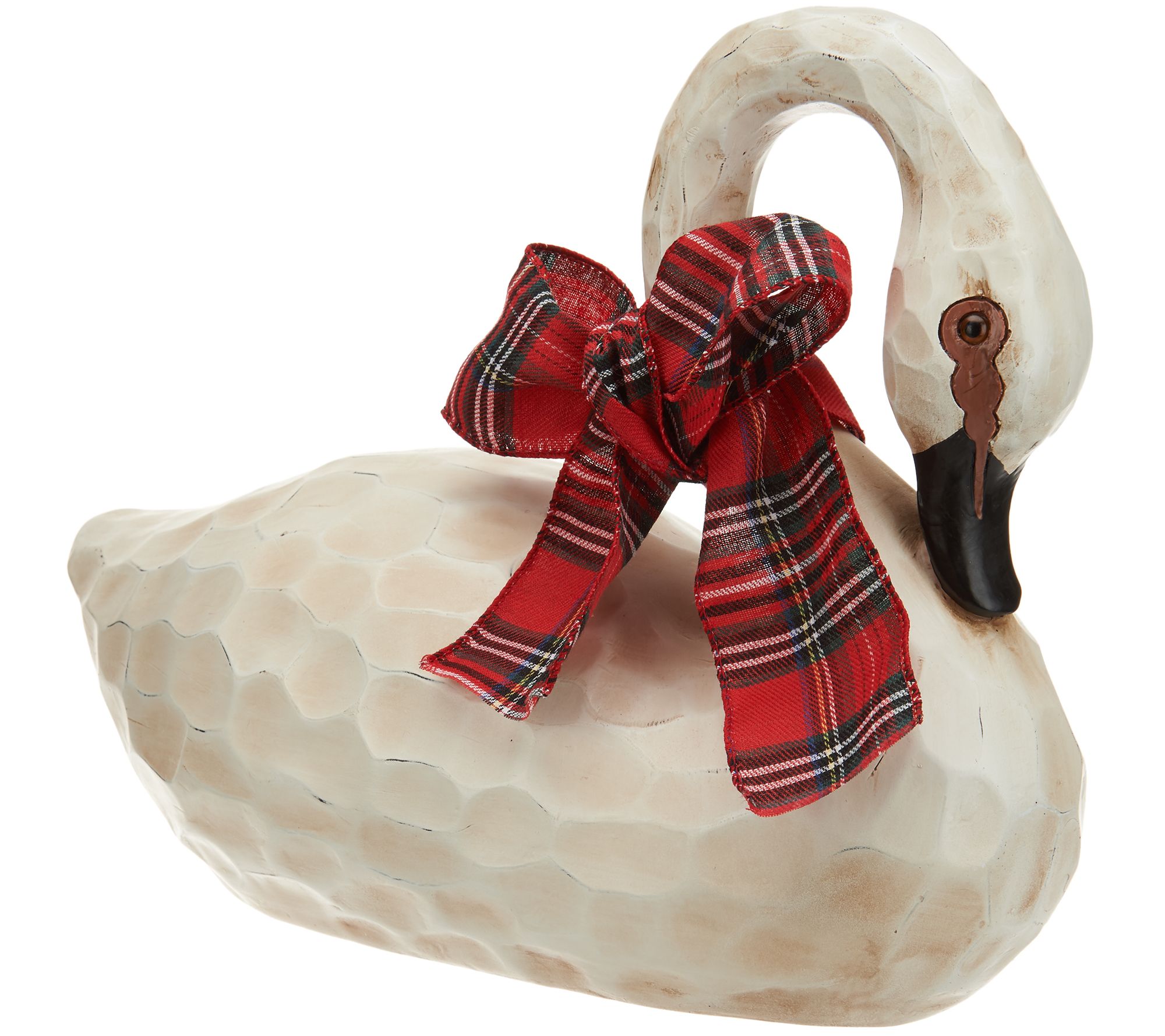 • Swan with curved neck wearing a plaid ribbon