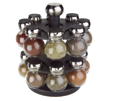Add zest to dining with the spices in this orbit rack. The rack holds 16 flip-lid jars and sits on a lazy Susan base for easy access to seasonings.