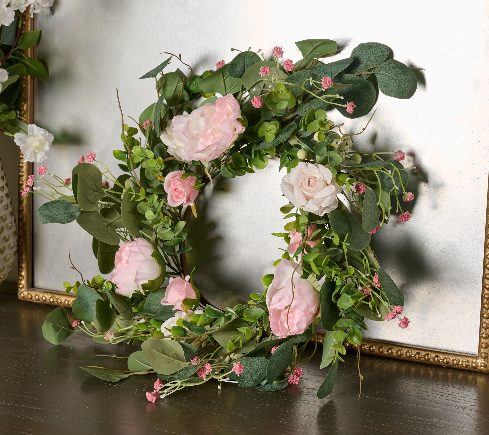 Don't wait for your garden to bloom to welcome spring! Brighten up any space with this delightful wreath, crafted with a lifelike arrangement of roses, peonies, green eucalyptus, and pink berries. From The Valerie Parr Hill Collection.