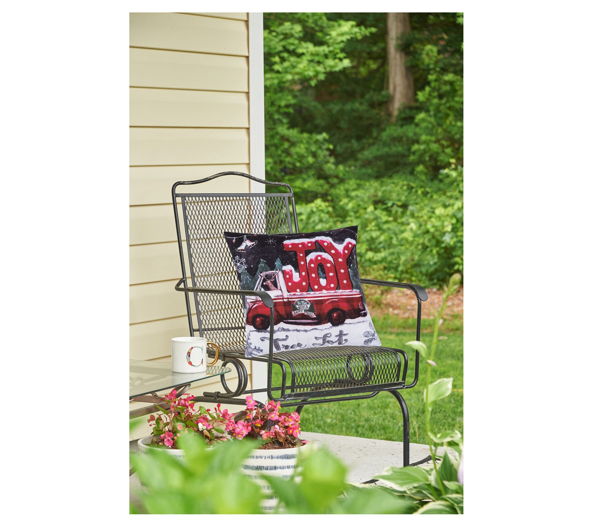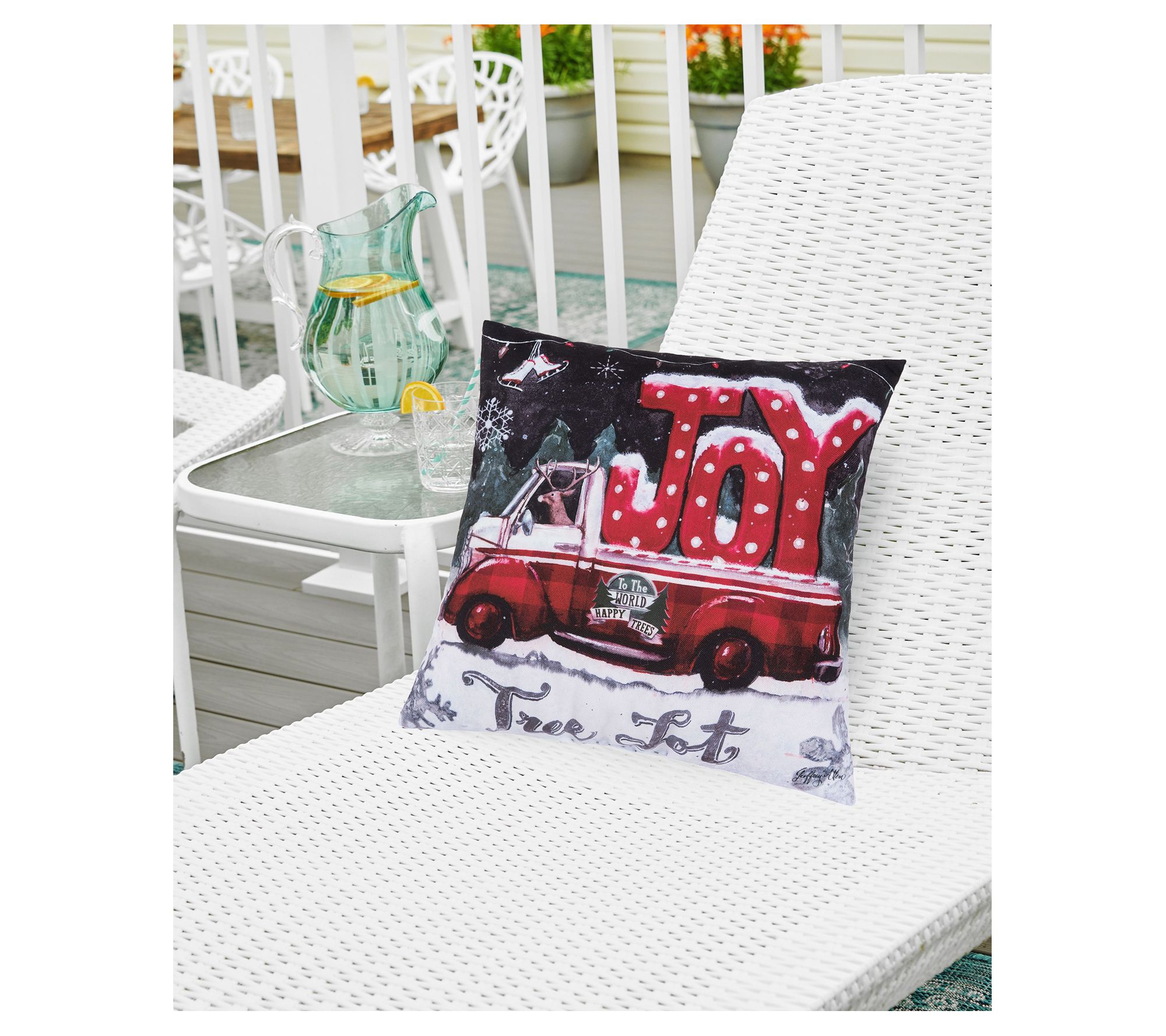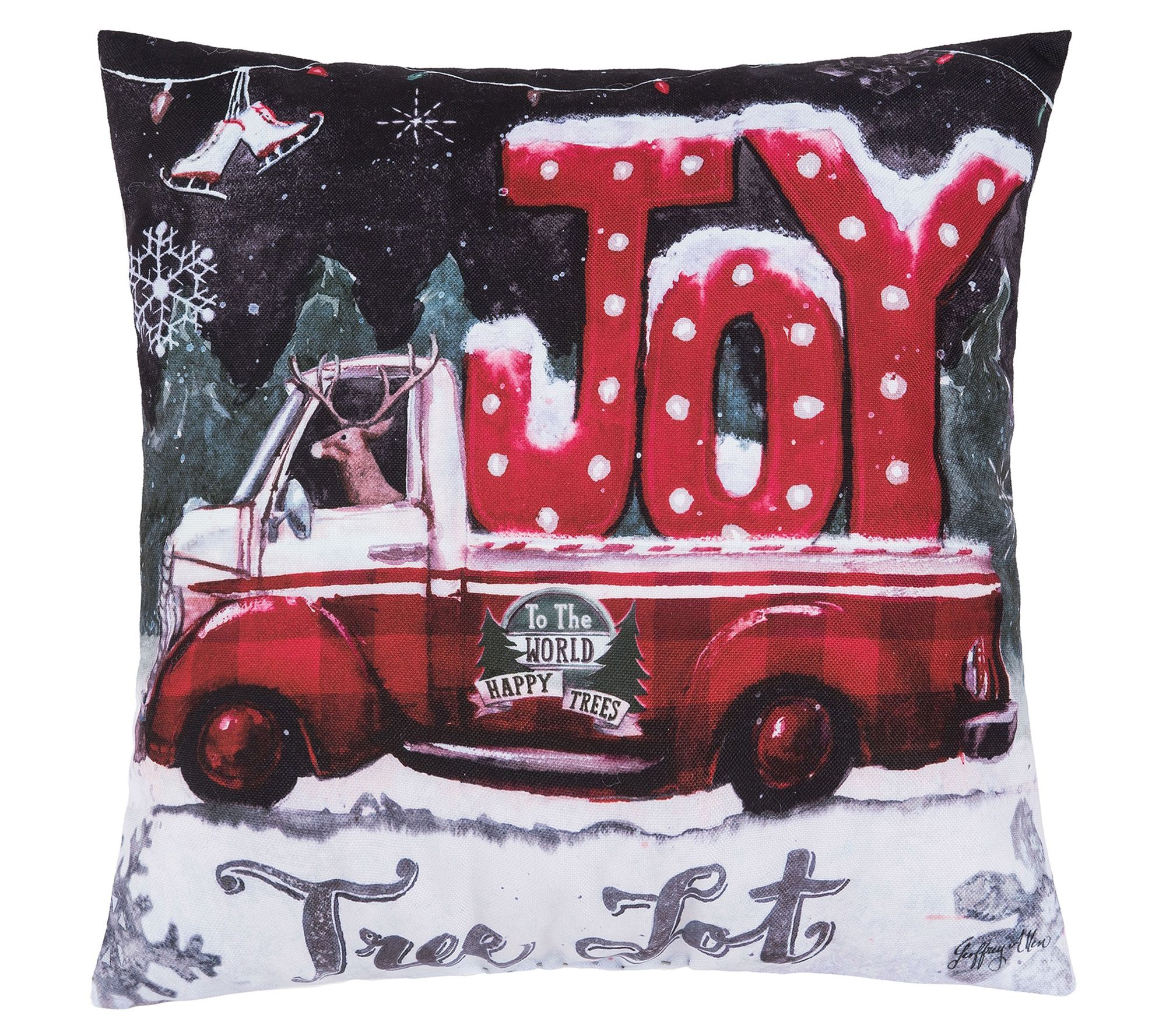 Hopefully that reindeer can drive a stick shift! Decorate your indoor and outdoor space for the holidays with this Tree Lot Joy Pillow. From the Valerie Parr Hill Collection.